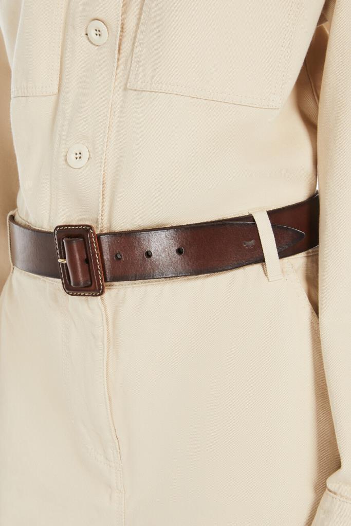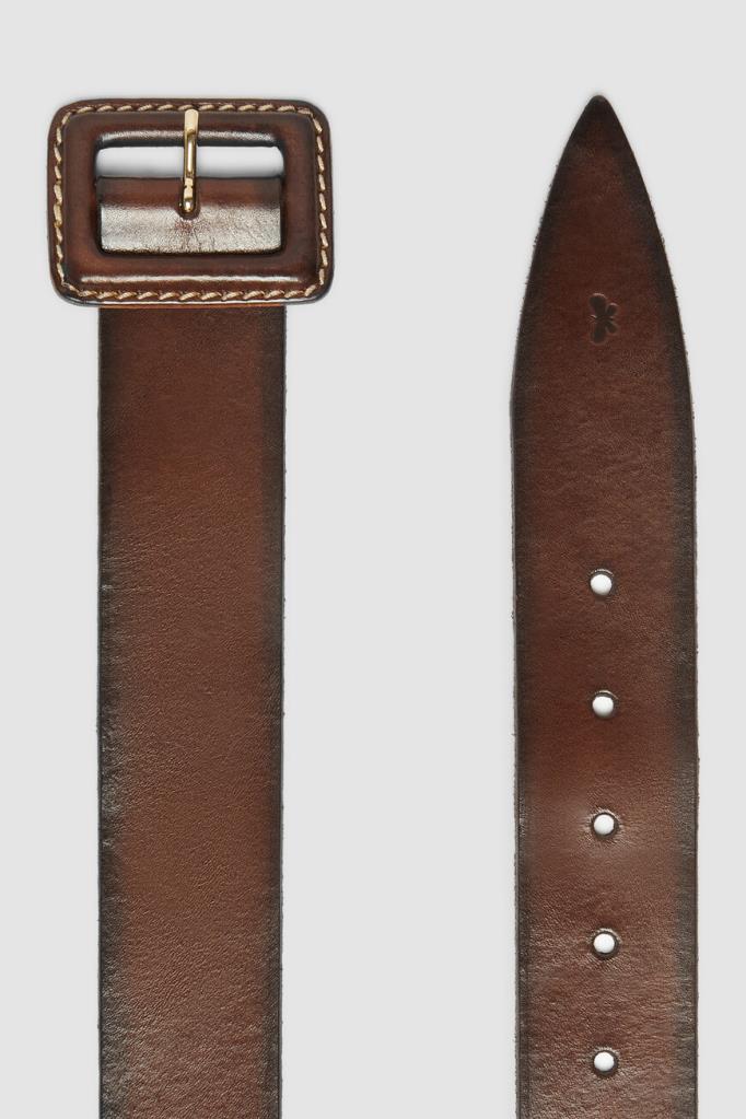 Тёмно-коричневый ремень Max Mara с патиной. Для изготовления модели из линейки Weekend используется мягкая телячья кожа. Объём аксессуара регулируется прямоугольной пряжкой из материала основы с окантовкой-швом и язычком из золотистого металла. Изделие отличается наличием заострённого кончика с культовой тиснёной символикой Дома - изображением бабочки.