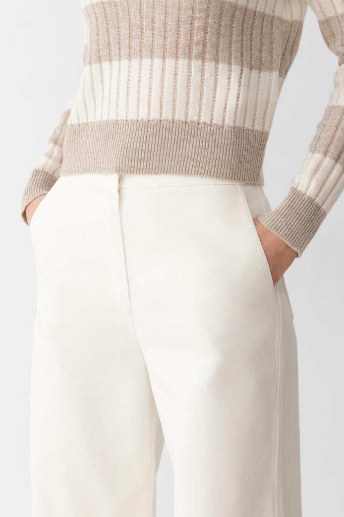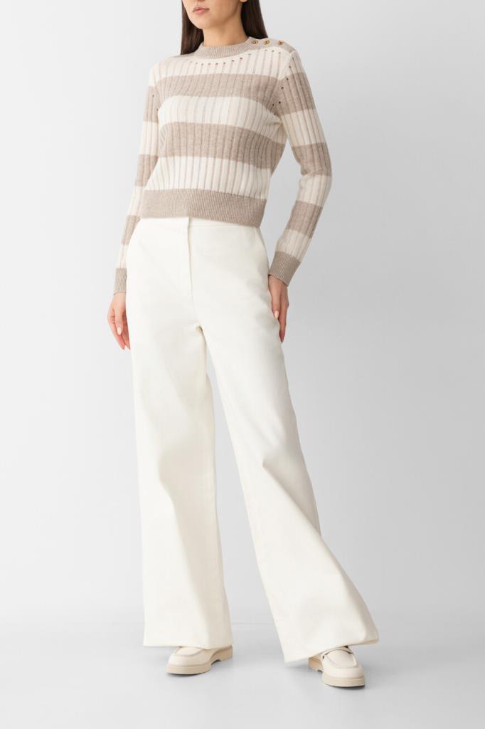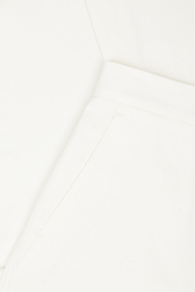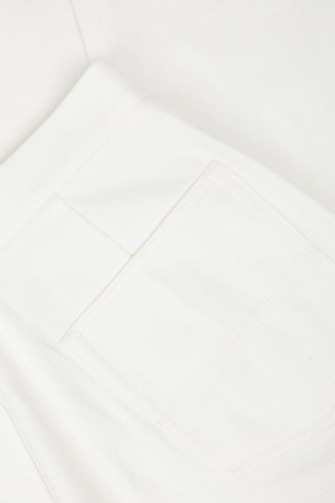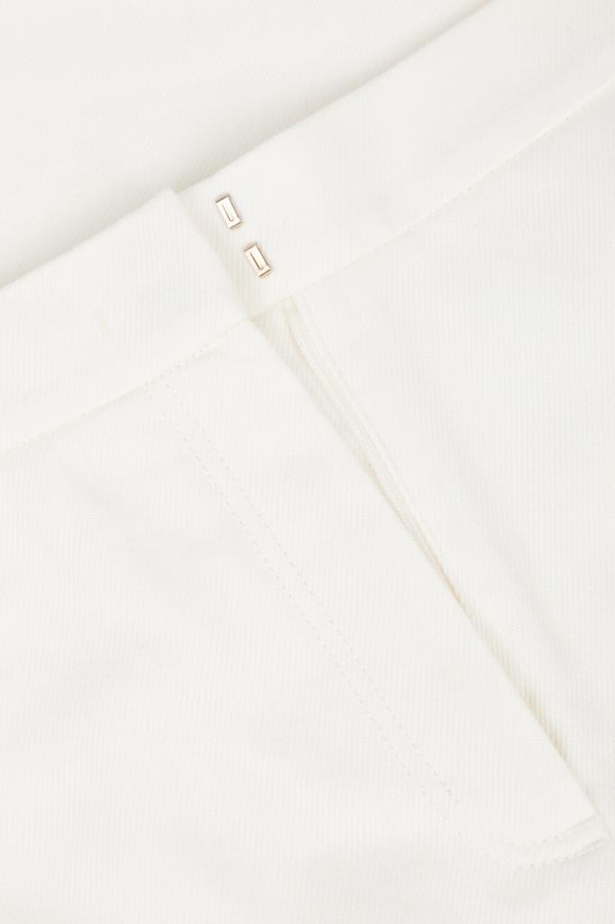 Длинные брюки Max Mara из чистого хлопкового твила. Изделие белого цвета сочетает в себе классический стиль и современный комфорт. Прямой силуэт штанин создает элегантный образ, а наклонные боковые карманы добавляют практичности. Отделка строчкой в тон и накладные карманы сзади подчеркивают силуэт. Застежка на широкий поясной хлястик, молнию и маленькие крючки обеспечивает идеальную посадку.
