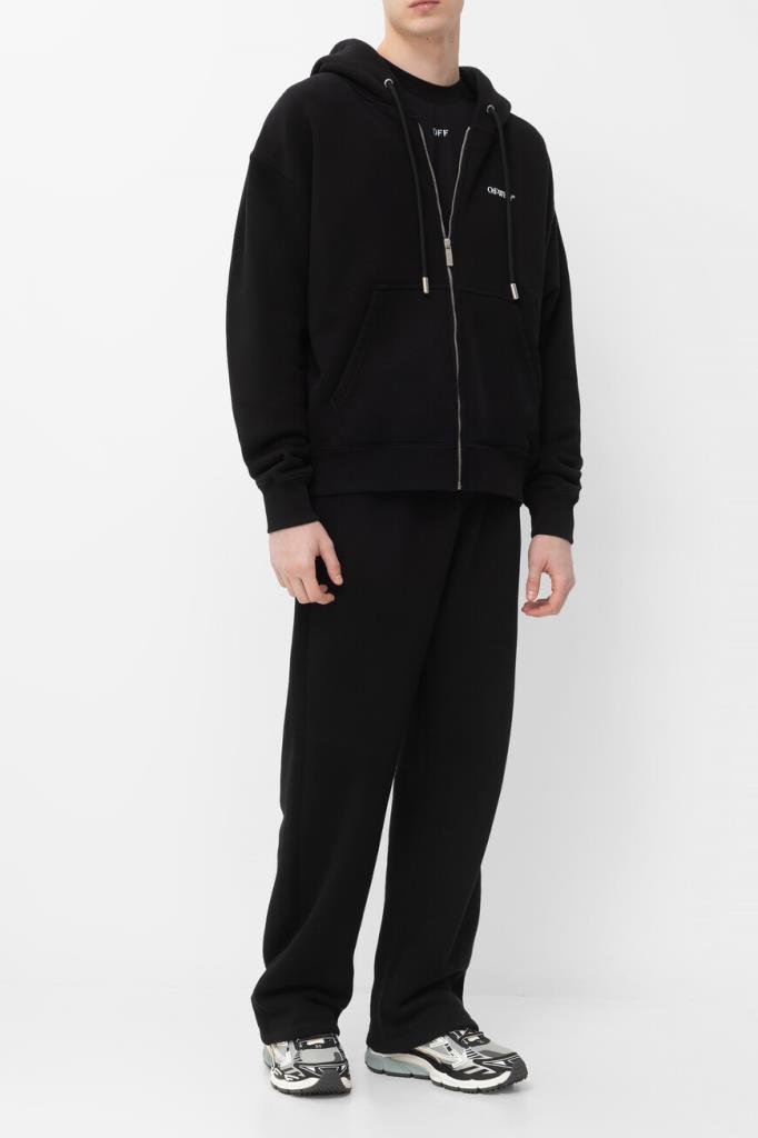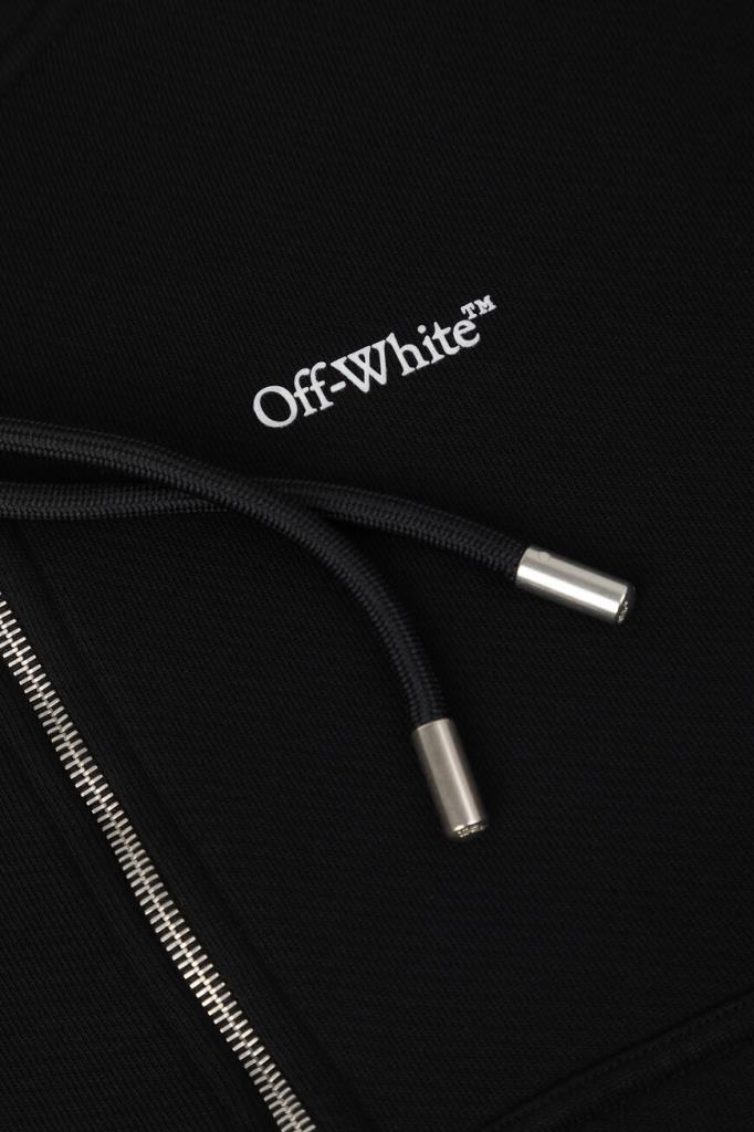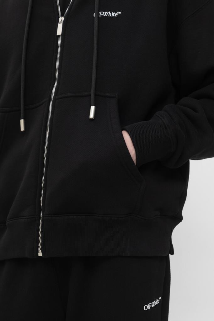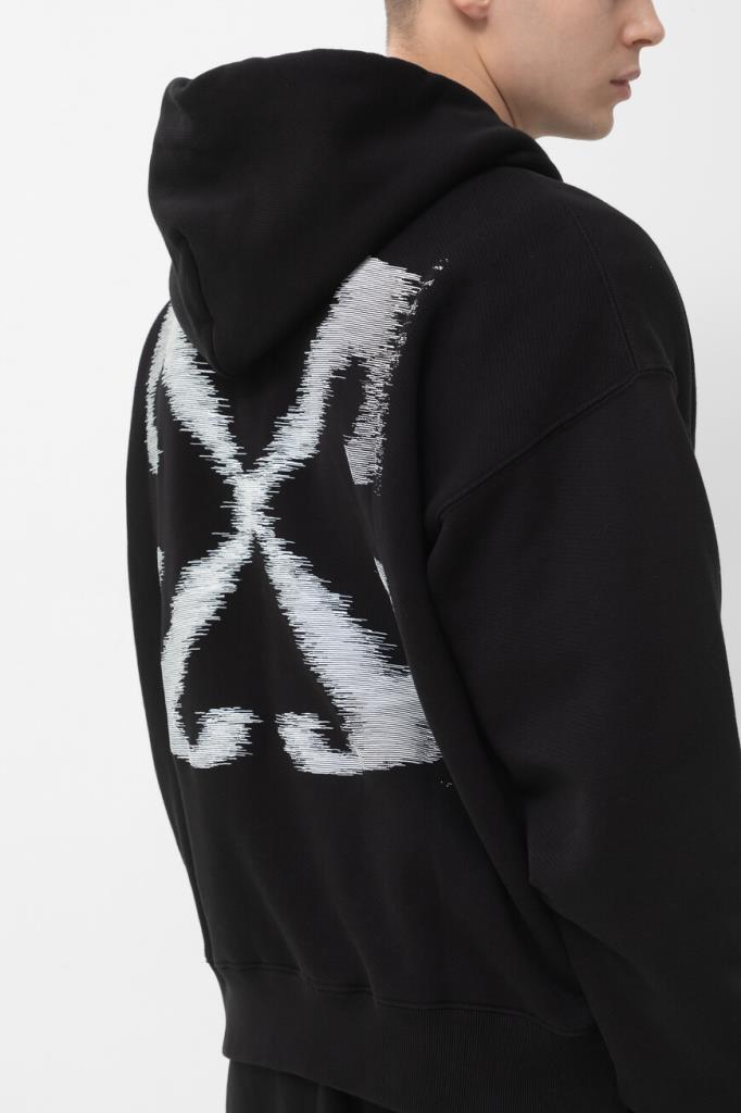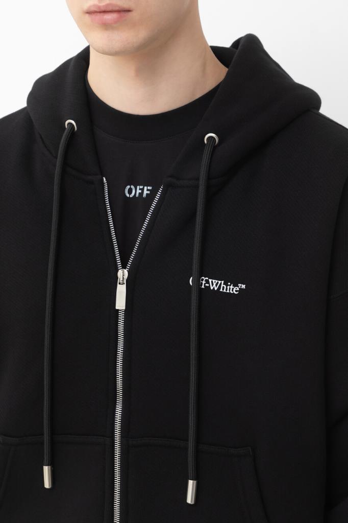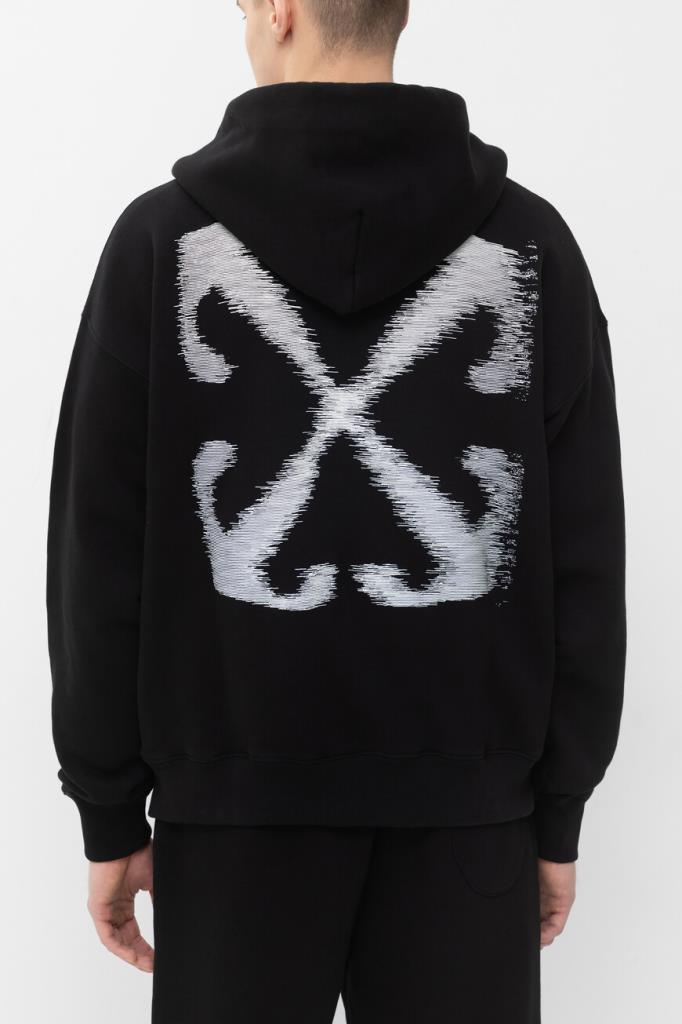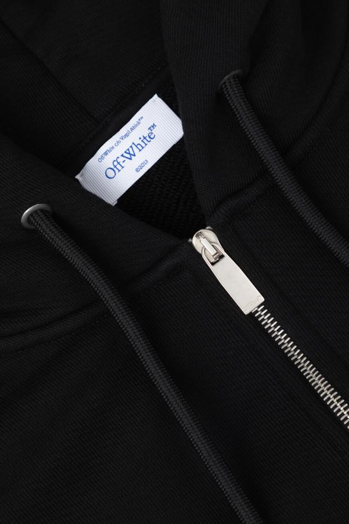 Чёрная толстовка Off-White с графичным принтом. Для пошива модели свободного силуэта выбран мягкий и при этом плотный хлопковый трикотаж. Принадлежность изделия Дому обозначена контрастными логотипом слева на груди и крупным знаковым принтом в виде перекрещенных стрелок Windy Arrows на спинке. Толстовка с глубоким капюшоном застёгивается на серебристую молнию с брендированным бегунком и сочетается со спортивными брюками Windy Arrow из той же коллекции.