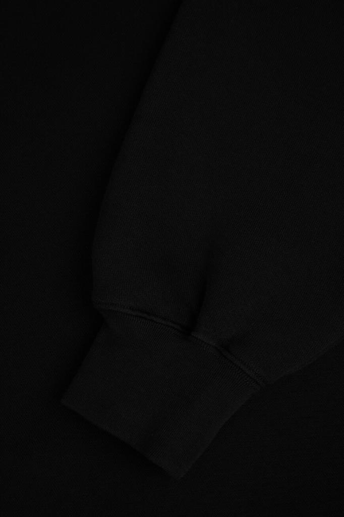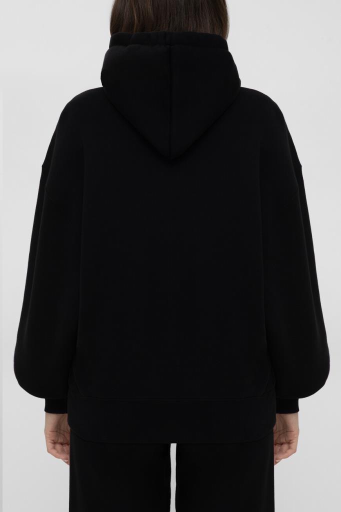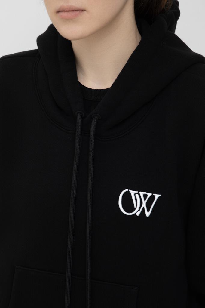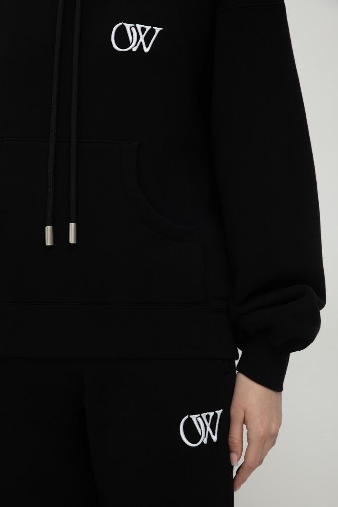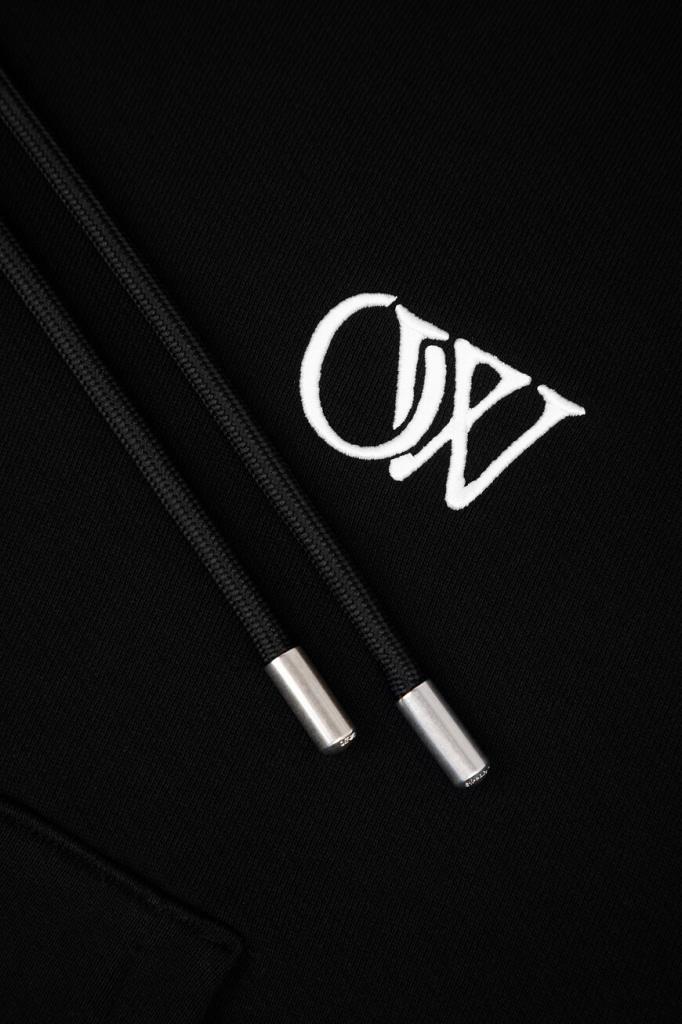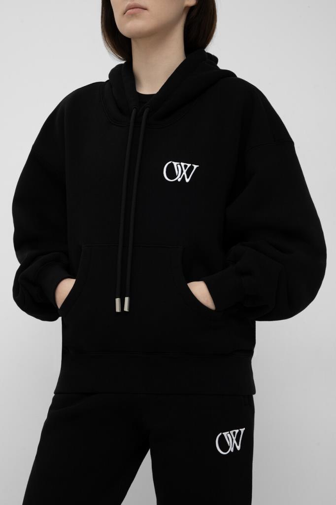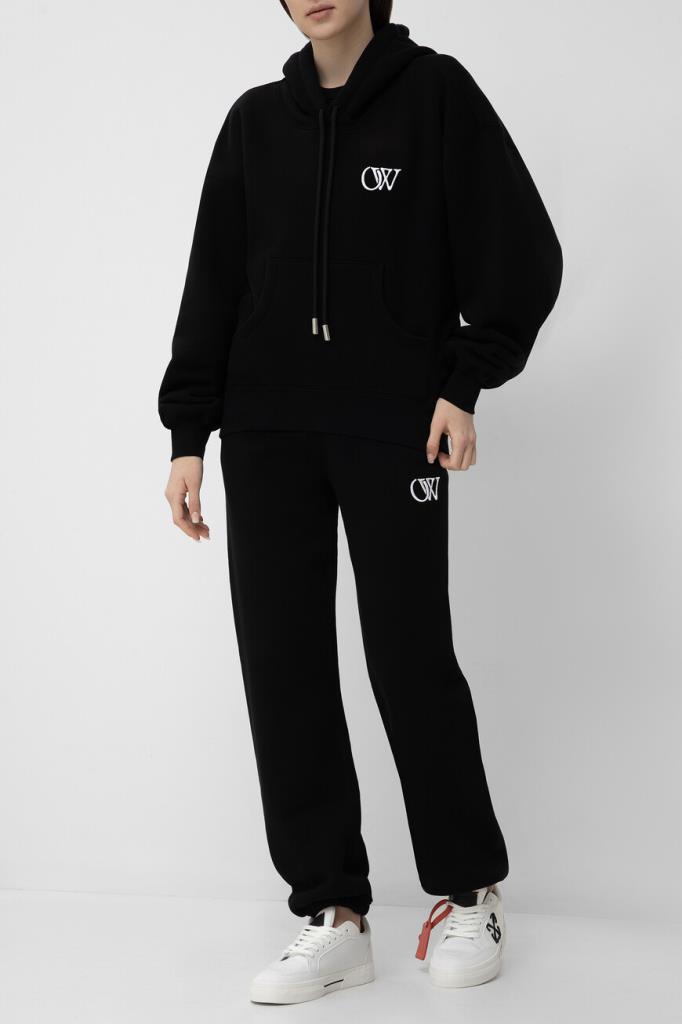 Чёрное худи Off-White с приспущенной линией плеч. Модель свободного силуэта изготовлена из плотного хлопкового футера. Мягкий материал хорошо удерживает тепло, не препятствуя циркуляции воздуха, не вытягивается и не пилингуется после стирок. Декором выступает крупная аббревиатура названия Дома, вышитая контрастной нитью слева на груди. Изделие станет неотъемлемой частью образа со спортивными брюками на резинке из той же коллекции.
