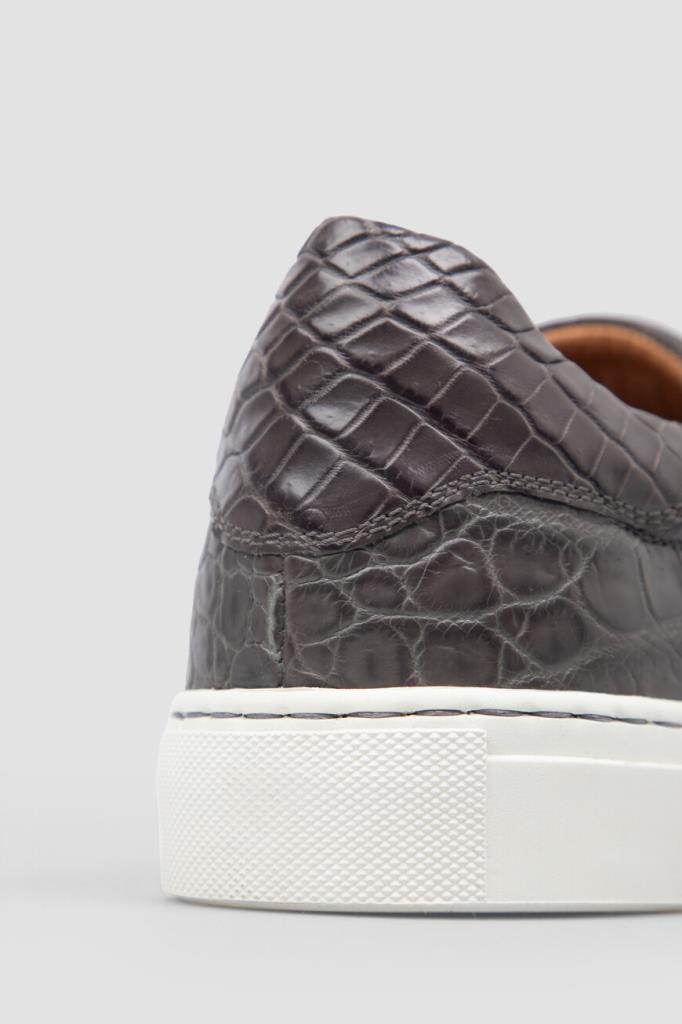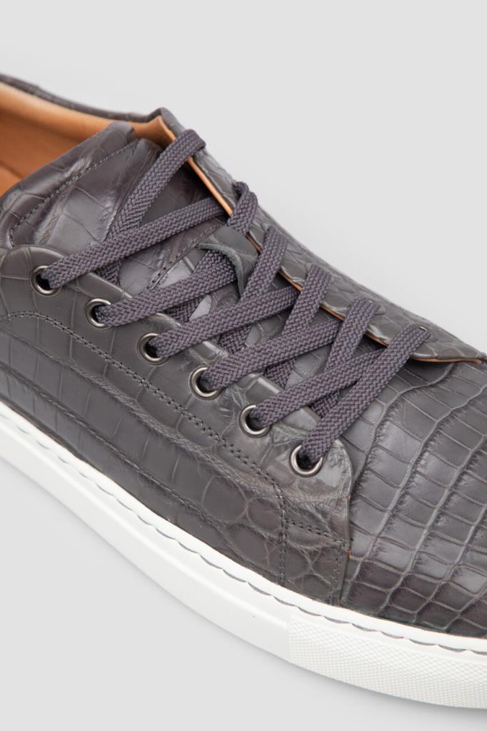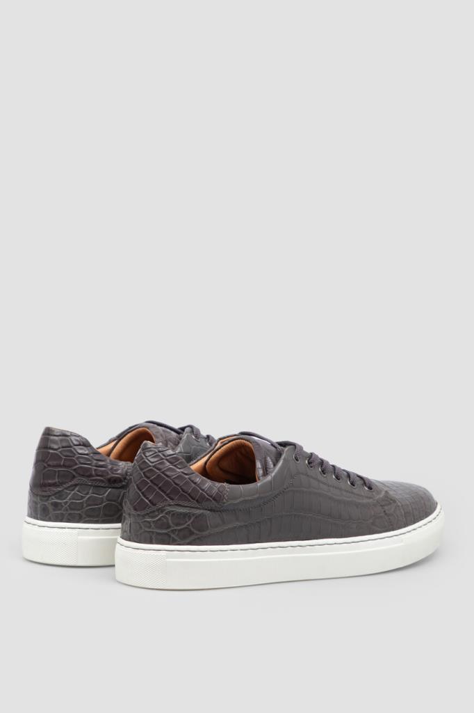 Демисезонные кеды тёмно-серого цвета от Bardini. Удобная модель выполнена из фактурной кожи крокодила и дополнена внутренней отделкой из тонкой телячьей кожи цвета бисквит. Открытая шнуровка с металлическими люверсами позволяет надёжно фиксировать пару на ноге, а крупные надписи-лого на стельках делают отсылку к знаковой символике Дома. Изделие станет идеальным завершением casual-комплектов.