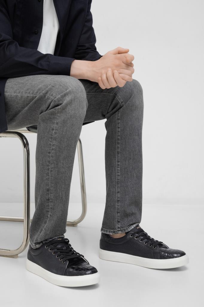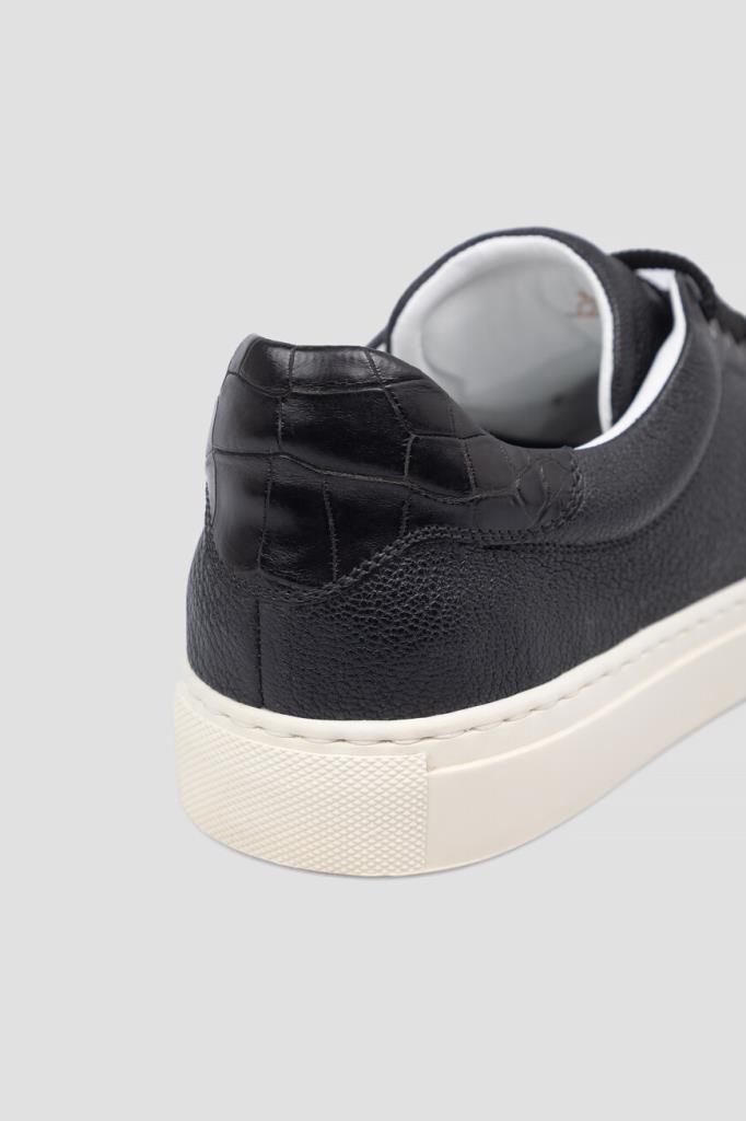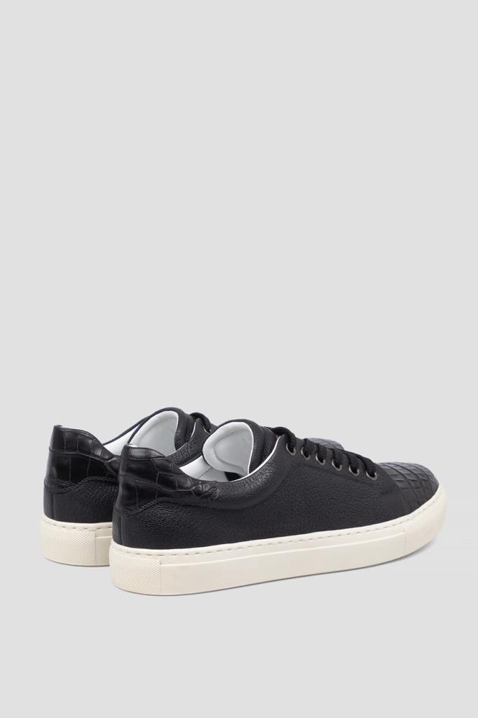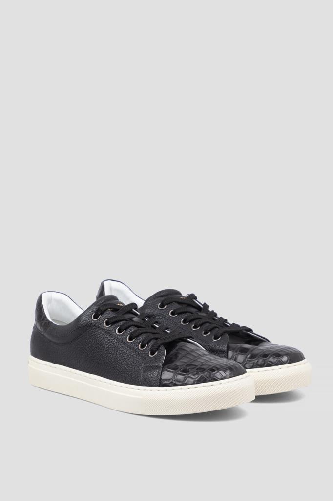 Чёрные кеды Bardini с перекрёстной многорядной шнуровкой. Для изготовления основы пары используется мягкая зернистая кожа оленя, а для создания деталей на носке и заднике в тон - кожа нильского крокодила с характерным чешуйчатым узором. Модель классической формы идеально подходит для создания повседневных образов.