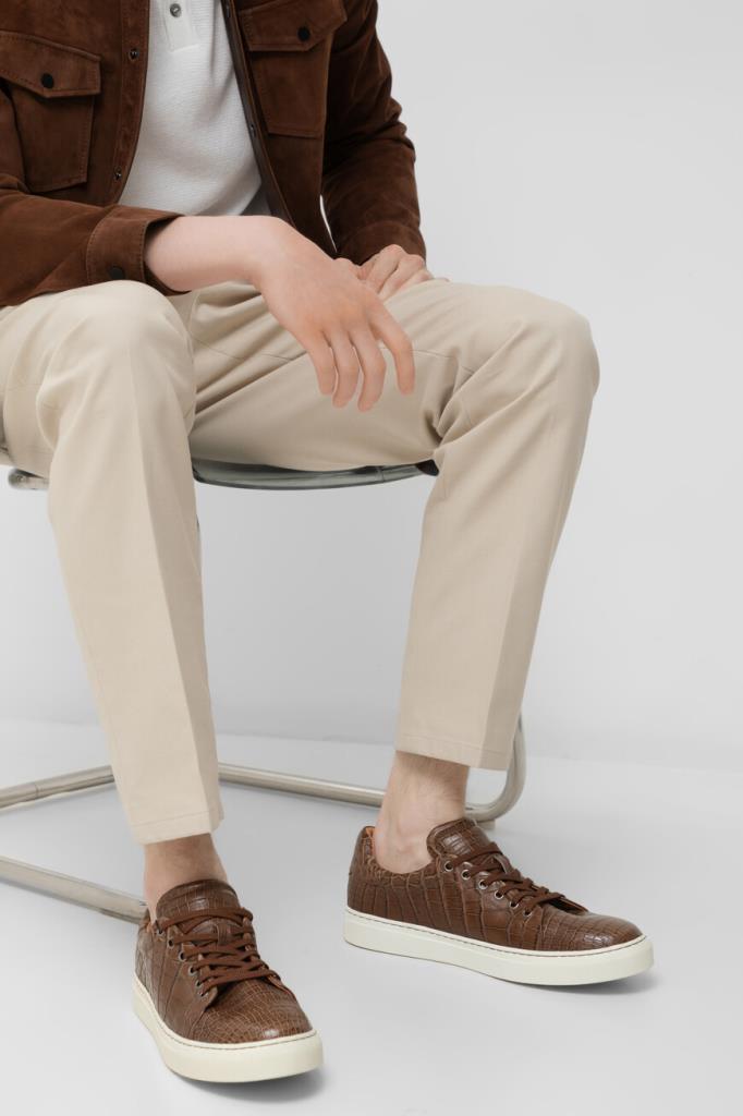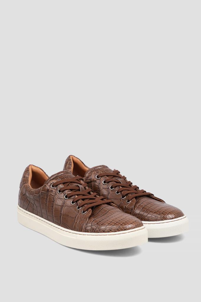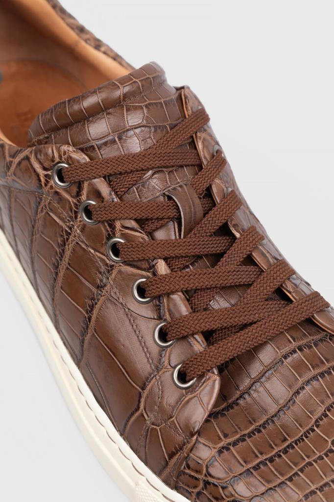Кожаные кеды шоколадного оттенка от Bardini. Конструкция модели с характерной чешуйчатой текстурой материала отличается классической формой с перекрёстной многорядной шнуровкой в тон и плоской амортизирующей подошвой из натуральной резины белого цвета с тёмно-коричневой прострочкой-швом. Роль минималистичного декора отдана крупному тиснёному лого Дома на кожаных стельках.