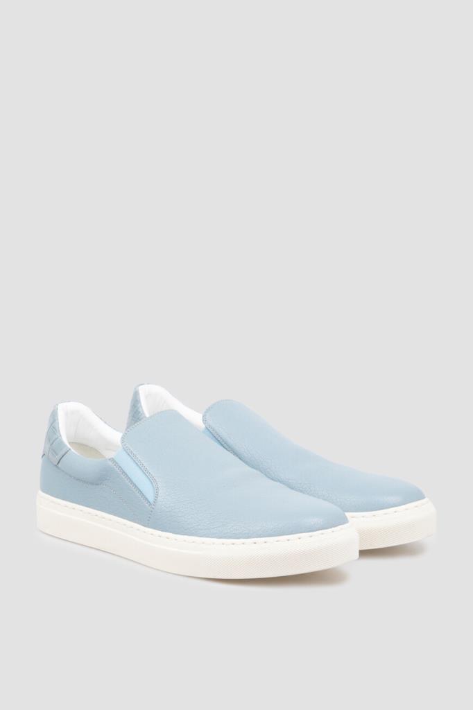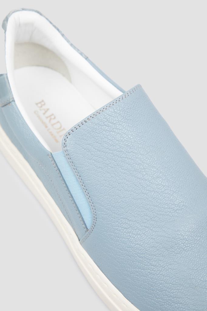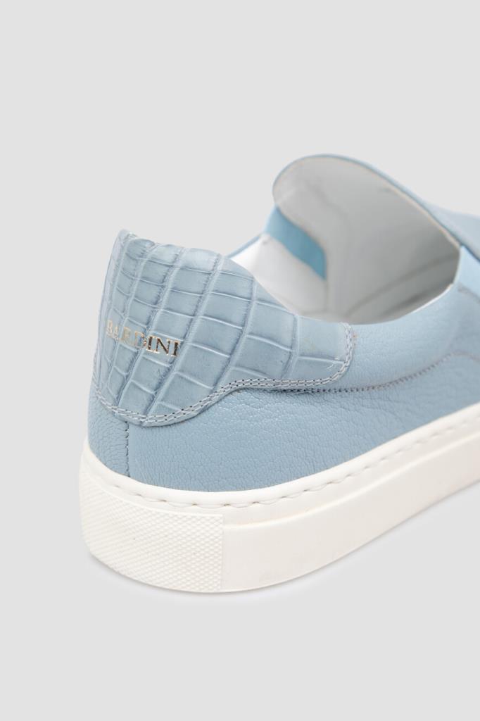 Комбинированные слипоны Bardini с минималистичным знаковым декором. Модель из мягкой зернистой кожи оленя голубого оттенка удобно надевать и снимать благодаря эластичным вставкам по бокам. Задник декорирован вставкой из фактурной кожи крокодила в тон и золотистой надписью-лого Дома. Особенностями изделия стали белые внутренняя отделка из тонкой телячьей кожи и амортизирующая подошва из натуральной резины с оттиском в стиле бренда Bardini снизу.