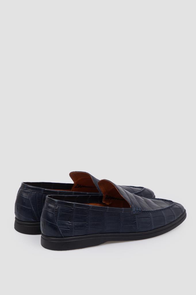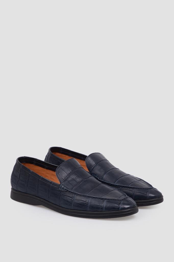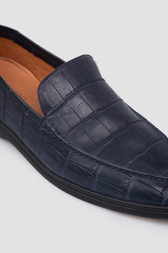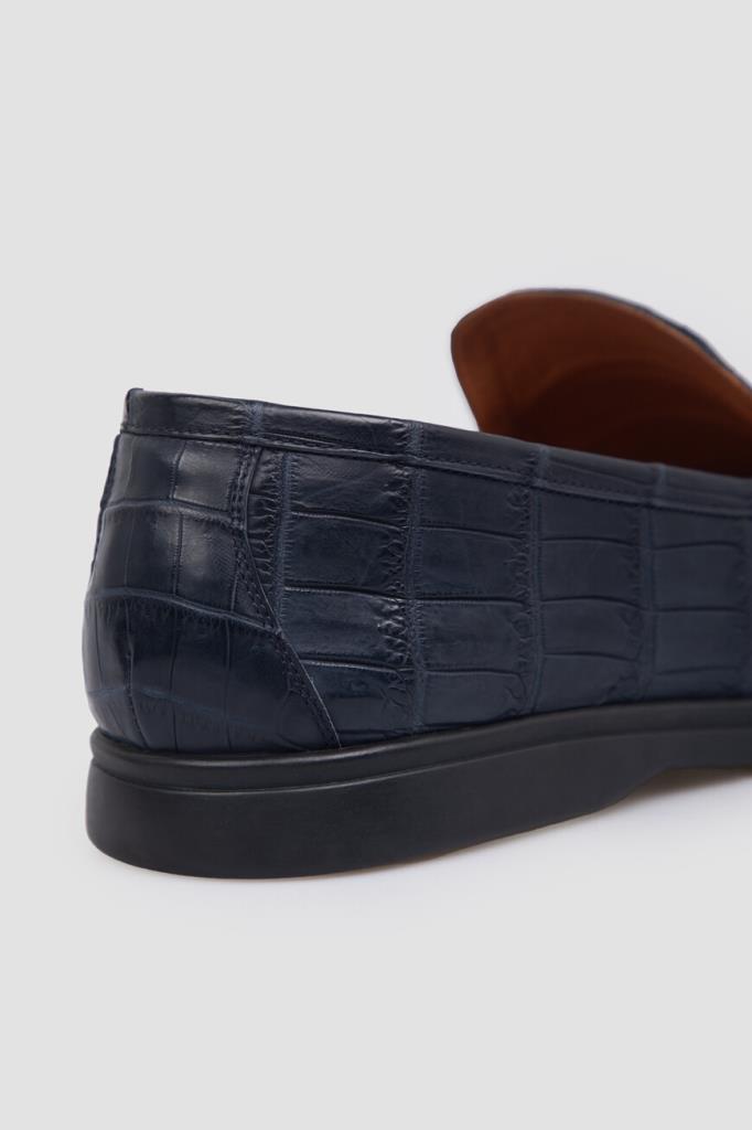 Тёмно-синие лоферы Bardini на чёрной амортизирующей подошве. Модель изготовлена вручную из мягкой кожи нильского крокодила с естественным природным рисунком. Максимальный комфорт обеспечивается мягкой конструкцией обуви и внутренней отделкой из нежной телячьей кожи цвета бисквит. Декором выступают крупные тиснёные лого Дома на стельках.