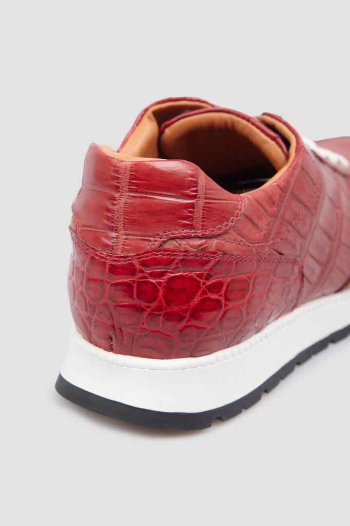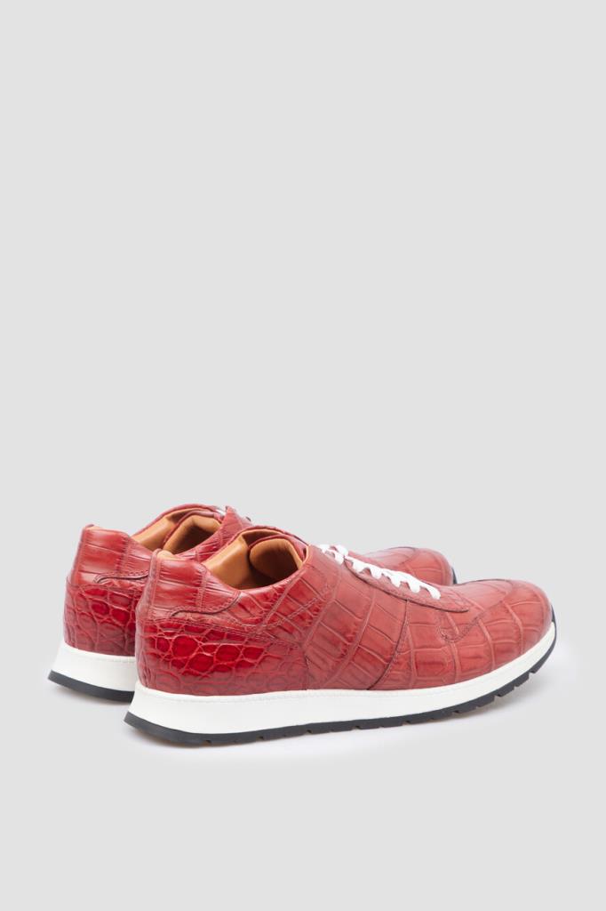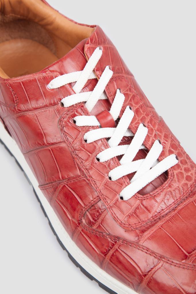 Пурпурно-красные кроссовки с перекрёстной многорядной шнуровкой от Bardini. Для создания изделия ручной работы выбрана мягкая кожа нильского крокодила с характерным природным узором. В качестве подкладки используется тонкая телячья кожа цвета бисквит. Носите удобную пару на толстой амортизирующей подошве каждый день или занимайтесь в ней спортом.