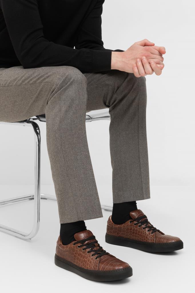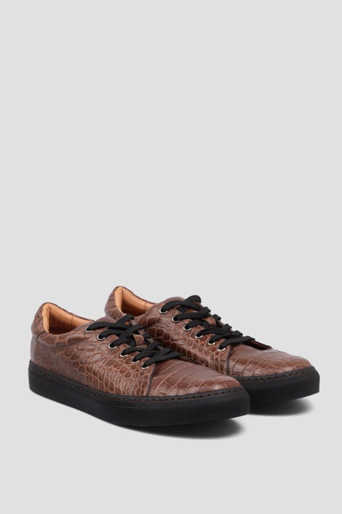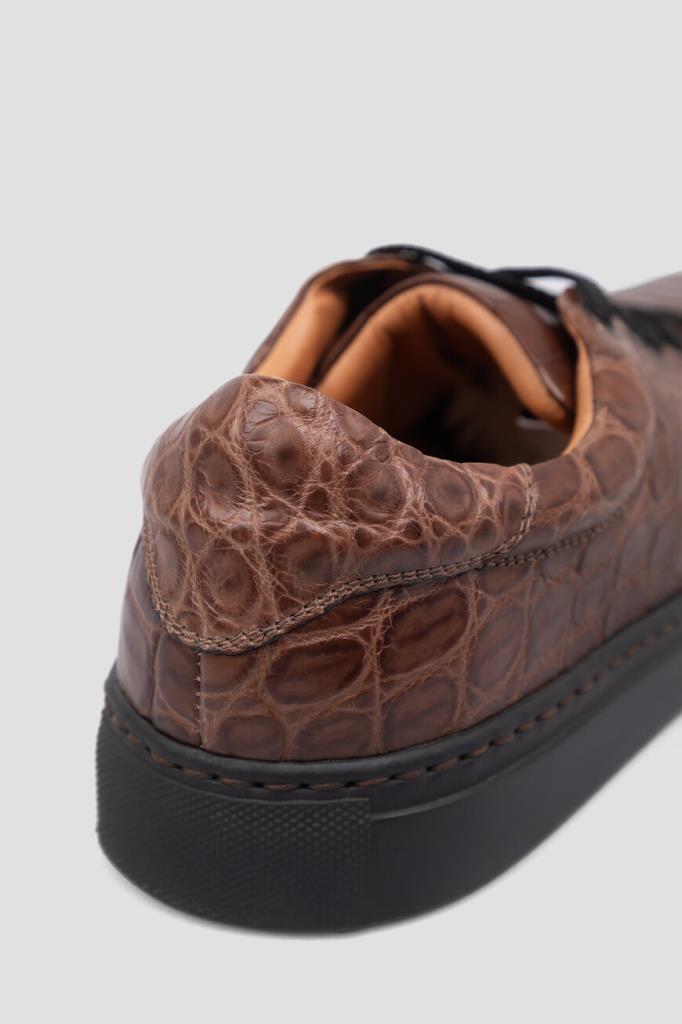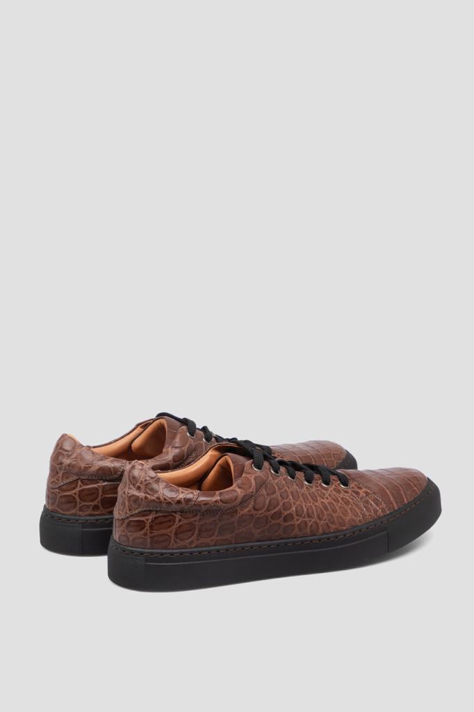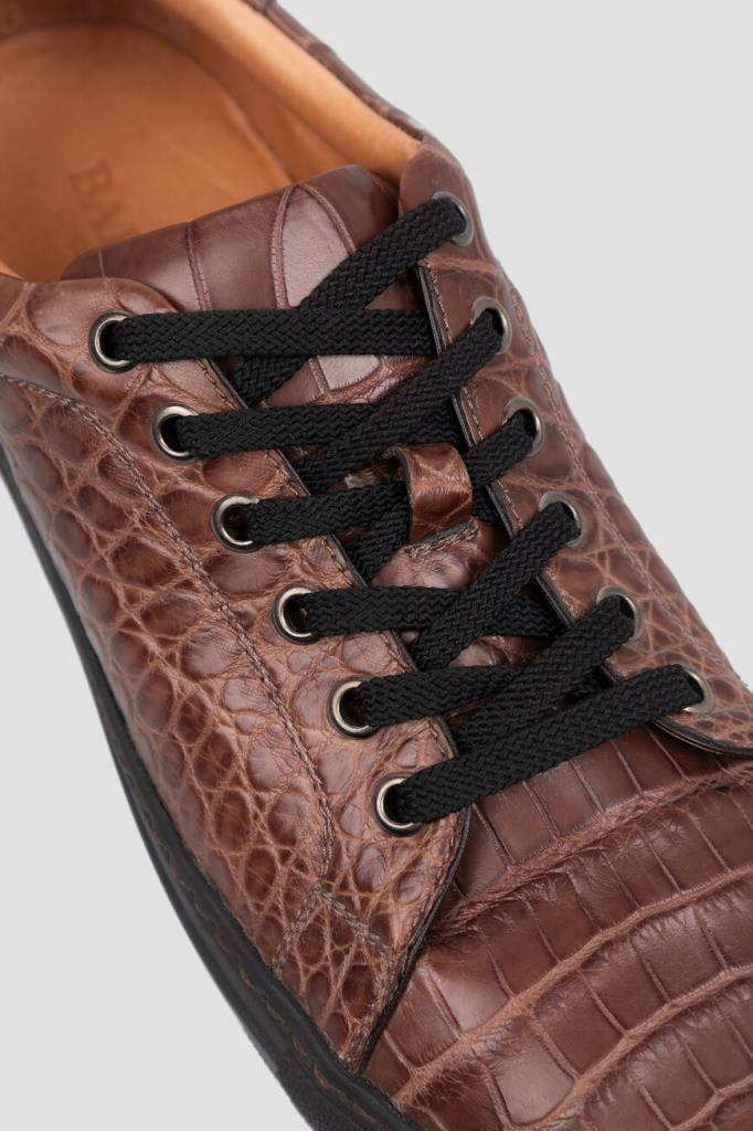 Кеды ручной работы от Bardini станут превосходным завершением Ваших образов. Для изготовления удобной пары коричневого цвета используется мягкая фактурная кожа крокодила. Классическая форма, закруглённый мыс, перекрёстная многорядная шнуровка и амортизирующая резиновая подошва чёрного цвета - это спортивная эстетика и новый уровень комфорта. Носите модель с подходящим ремнём из кожи крокодила для создания органичного комплекта.