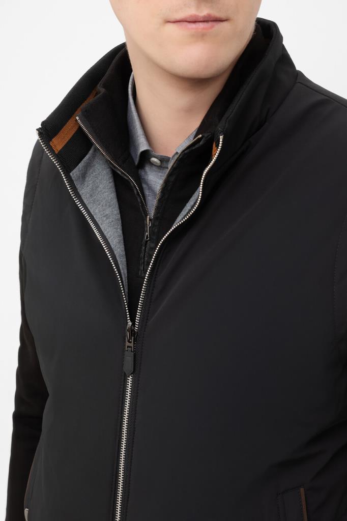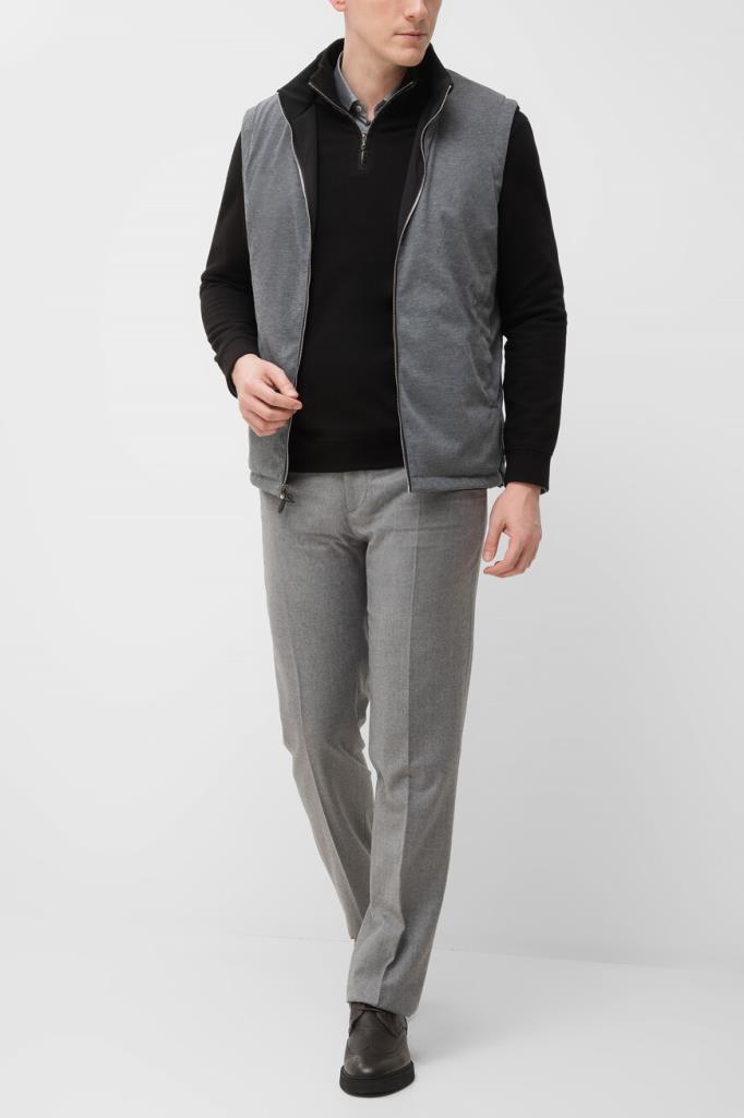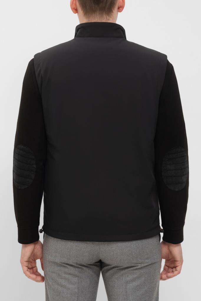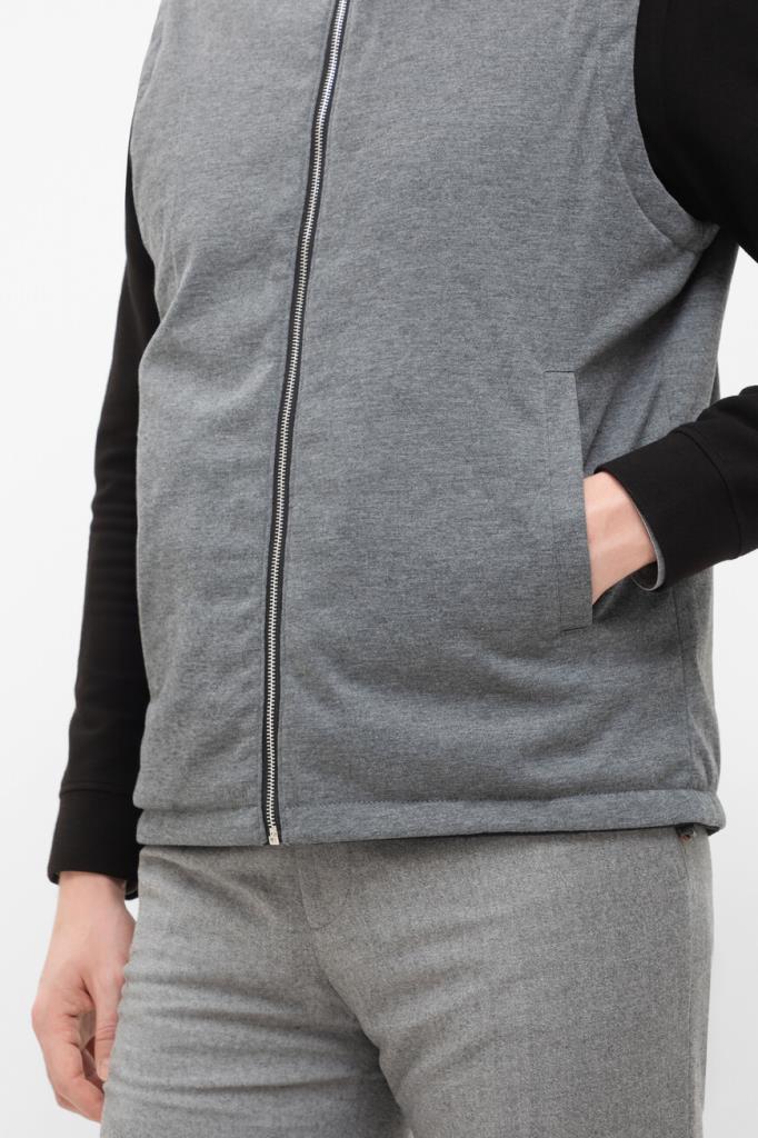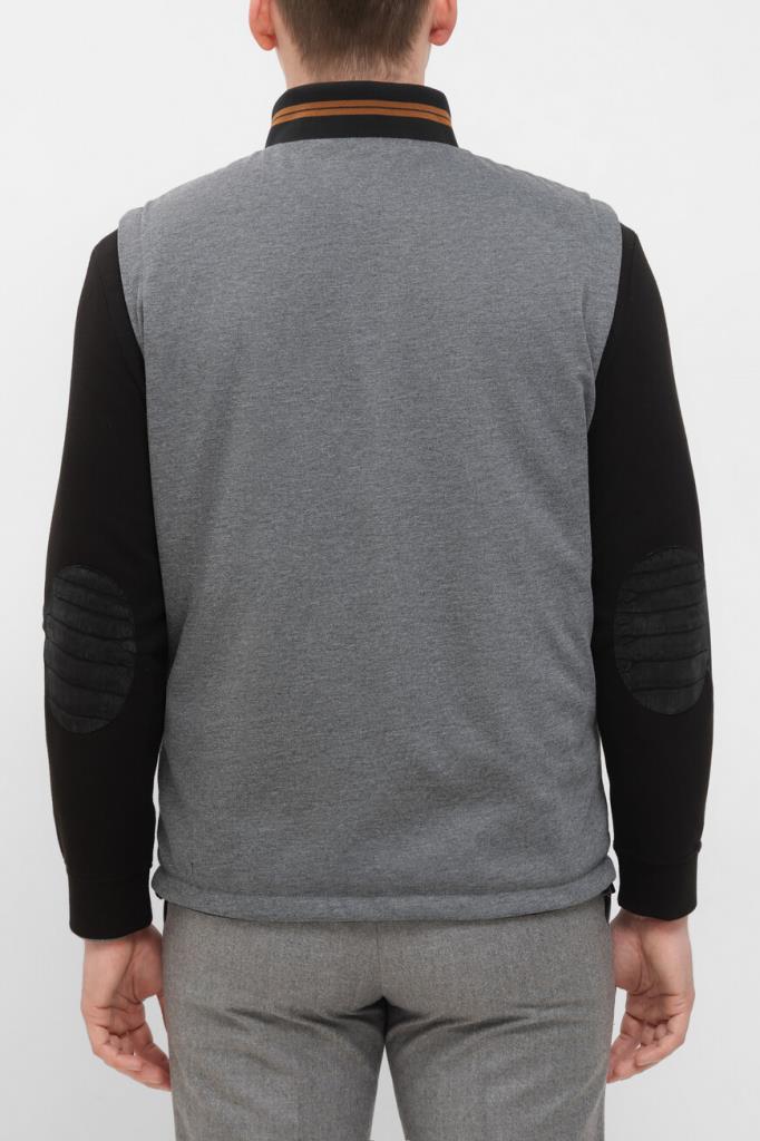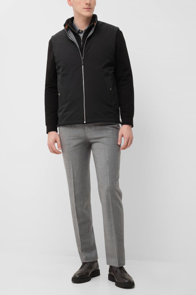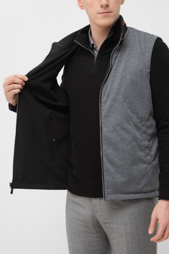Прямой жилет Bardini на серебристой молнии с кожаным пуллером. Для изготовления двусторонней модели используются прочный матовый нейлон и полиэфир чёрного и серого оттенков соответственно. Отличительными деталями являются горизонтальные полосы на воротнике и коричневый кант на карманах на стороне чёрного цвета. Утеплённая модель станет хорошей альтернативой лёгкой куртке в ветреную погоду.