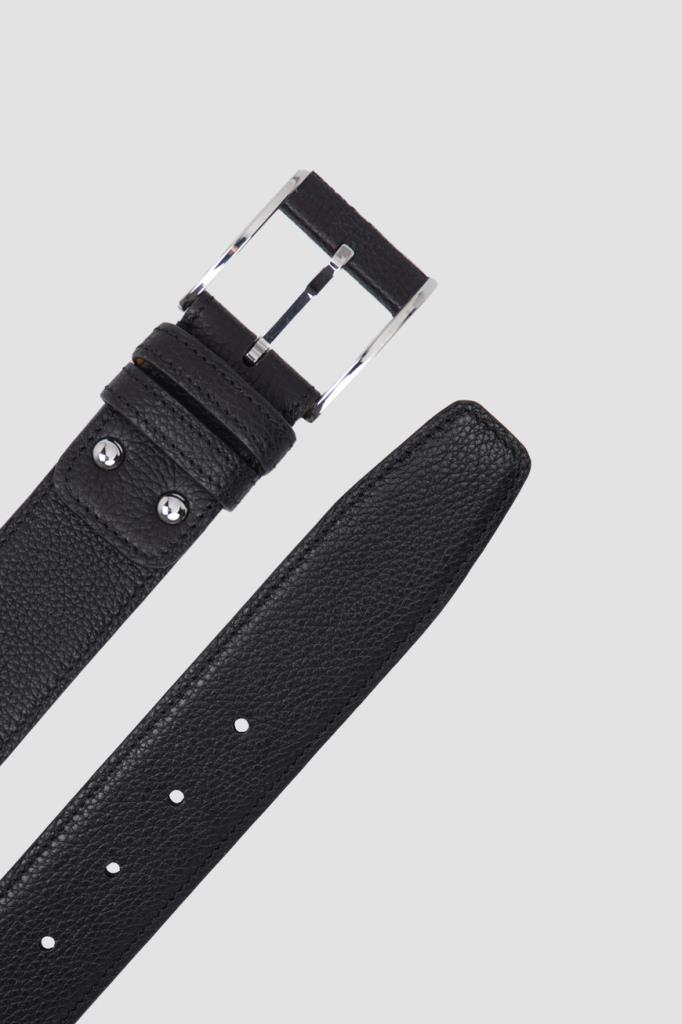 Ремень Bardini из мягкой зернистой кожи телёнка итальянской выделки. Классический аксессуар чёрного цвета оснащён двумя подвижными тренчиками для фиксации наконечника. Модель усилена специальной прокладкой, которая позволяет сохранить форму в течение длительного времени. Принадлежность изделия с пряжкой с высококачественным и прочным гальваническим покрытием Дому деликатно обозначена логотипом на подкладке.