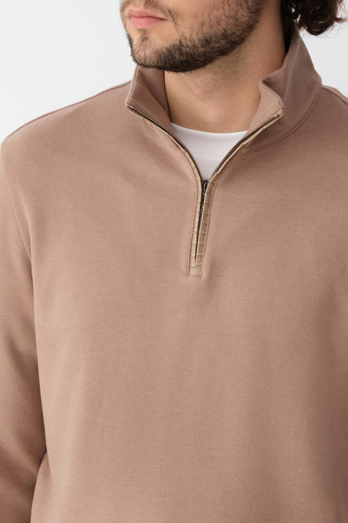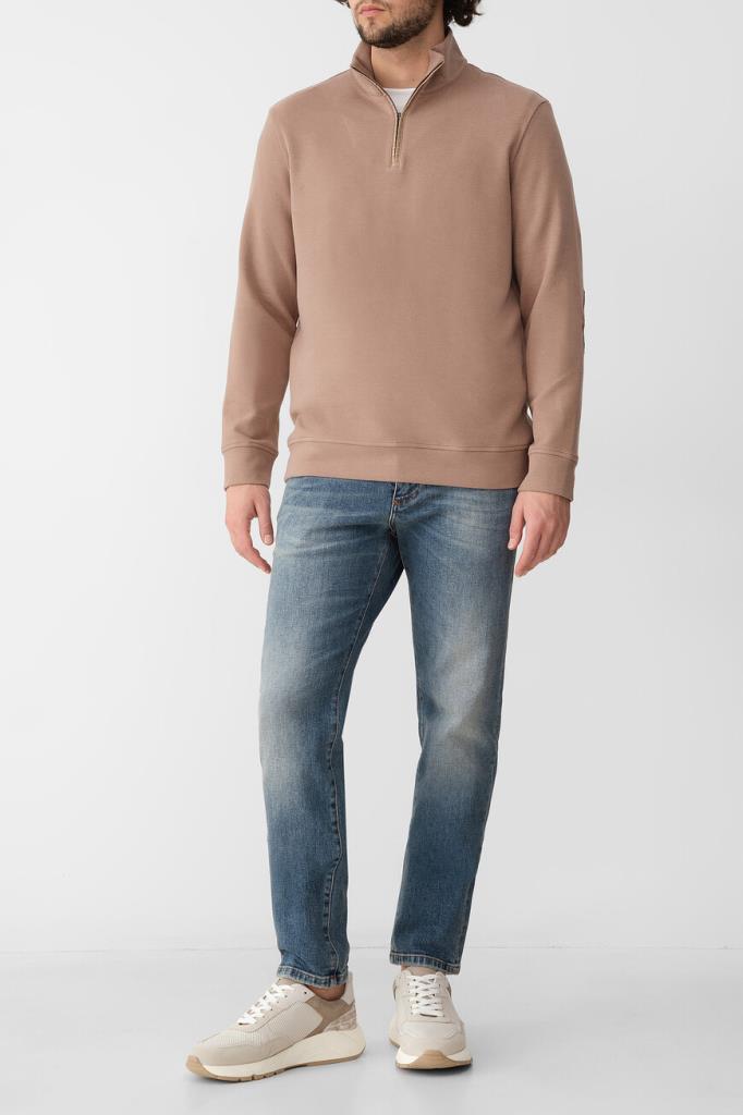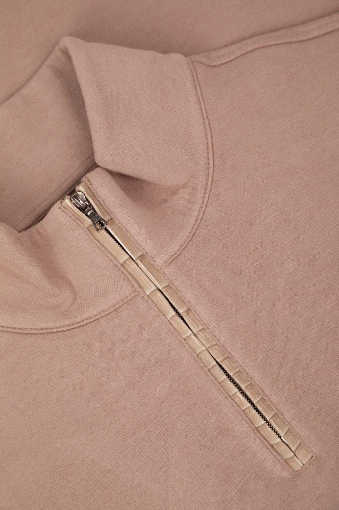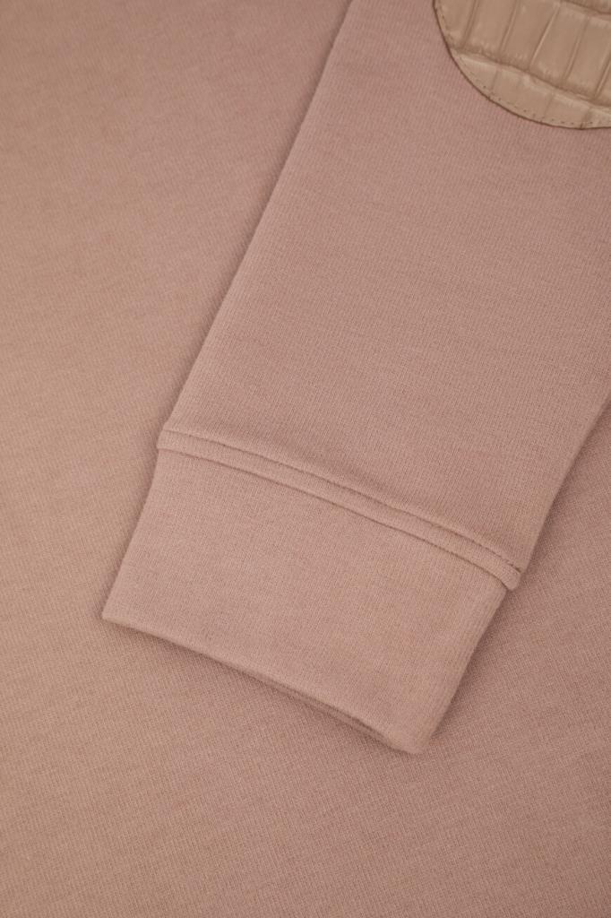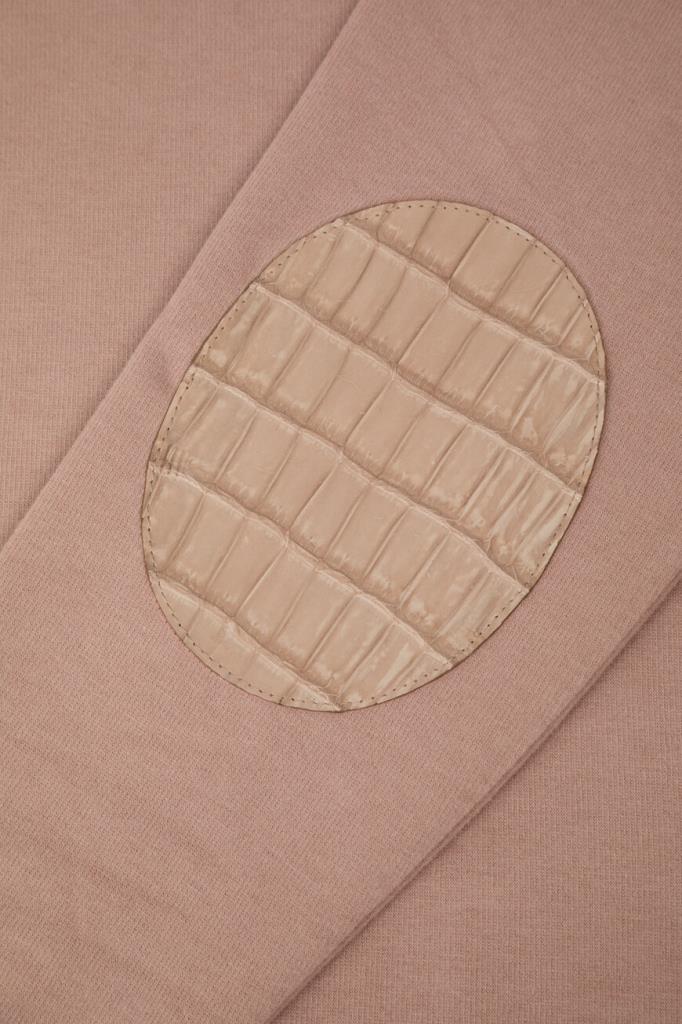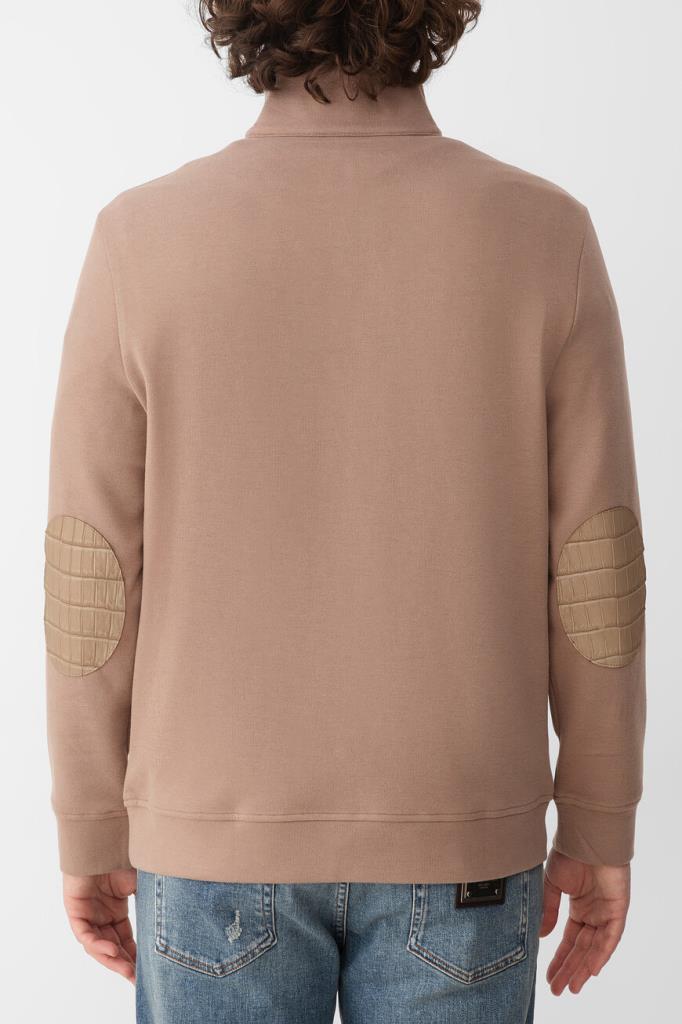 Бежевый джемпер с воротником-стойкой от Bardini. Изделие выполнено из мягкого трикотажа на основе хлопка, кашемира, модала и прочного полиэстера с деталями-отделкой из фактурной кожи крокодила на уровне планки шнуровки и сзади на локтях. Модель комфортно садится по фигуре и застёгивается на короткую молнию с серебристым металлическим пуллером.  Джемпер будет смотреться выигрышно в комплекте с джинсами Dolce&Gabbana с эффектом делаве.