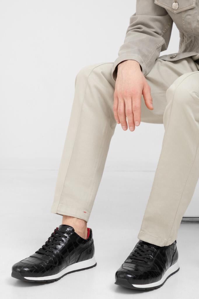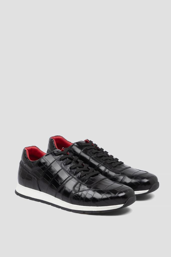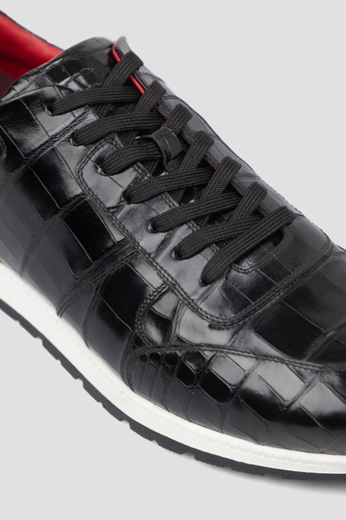 Глянцевые кроссовки Bardini с закрытым типом шнуровки. Конструкция изделия из фактурной кожи нильского крокодила характеризуется наличием широкой колодки и объёмной чёрно-белой подошвы из прочного полиуретана с протектором для надёжного сцепления с дорогой. Удобная пара ручной работы дополнит Ваши повседневные образы нотой в фирменном стиле.