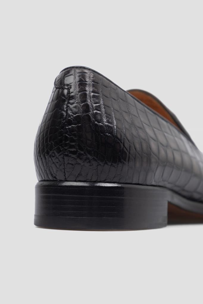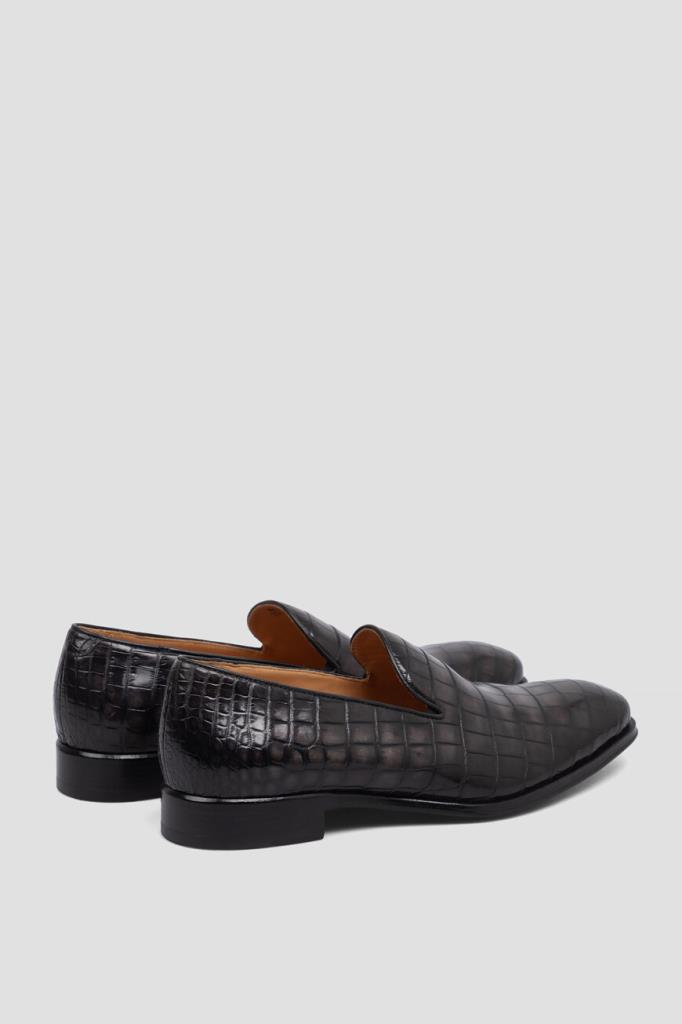 Лоферы Bardini с брендированием на кожаных стельках. Изделие выполнено из кожи нильского крокодила серого оттенка с патиной и характерным фактурным узором. Для удобства надевания предусмотрены небольшие эластичные вставки по бокам, а для комфорта в носке - внутренняя отделка из гладкой бежевой кожи телёнка и бархатистой замши.