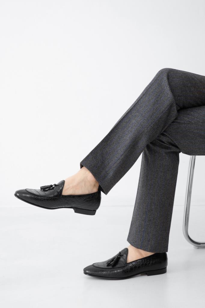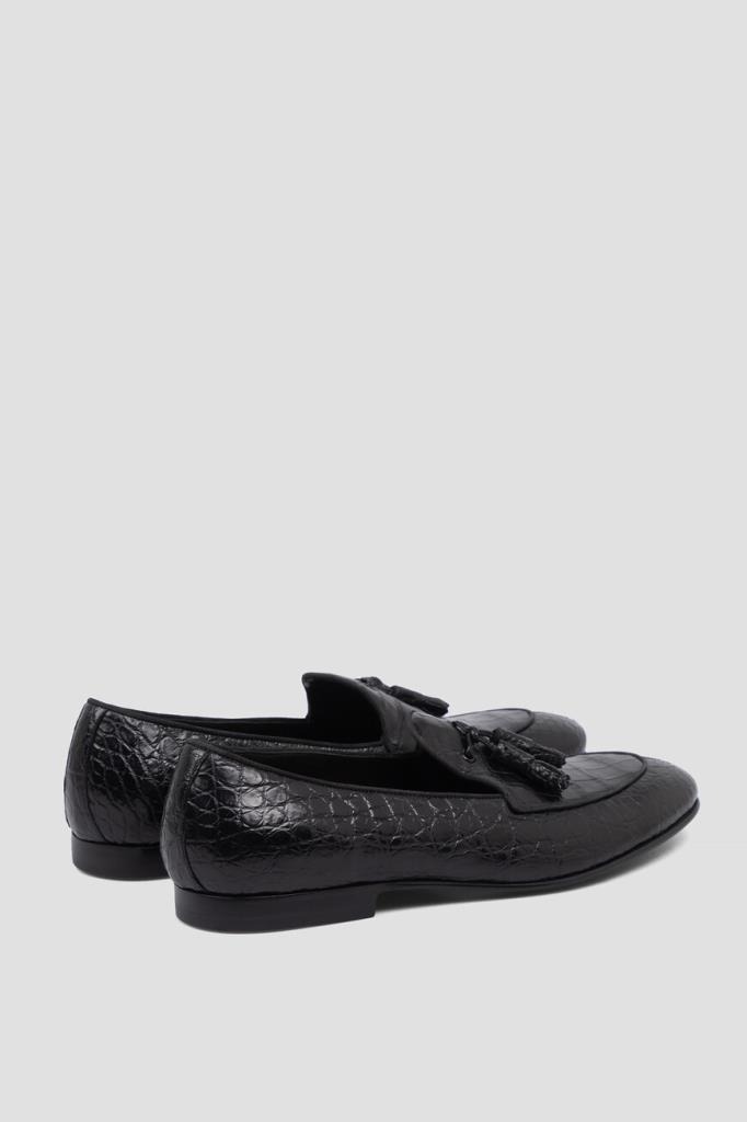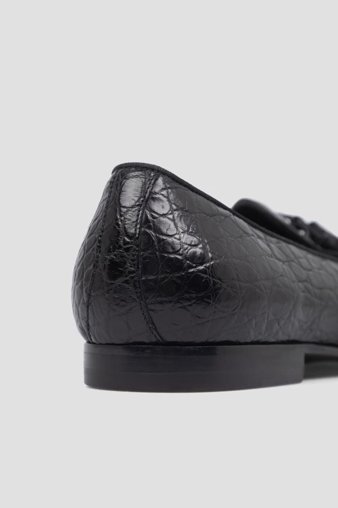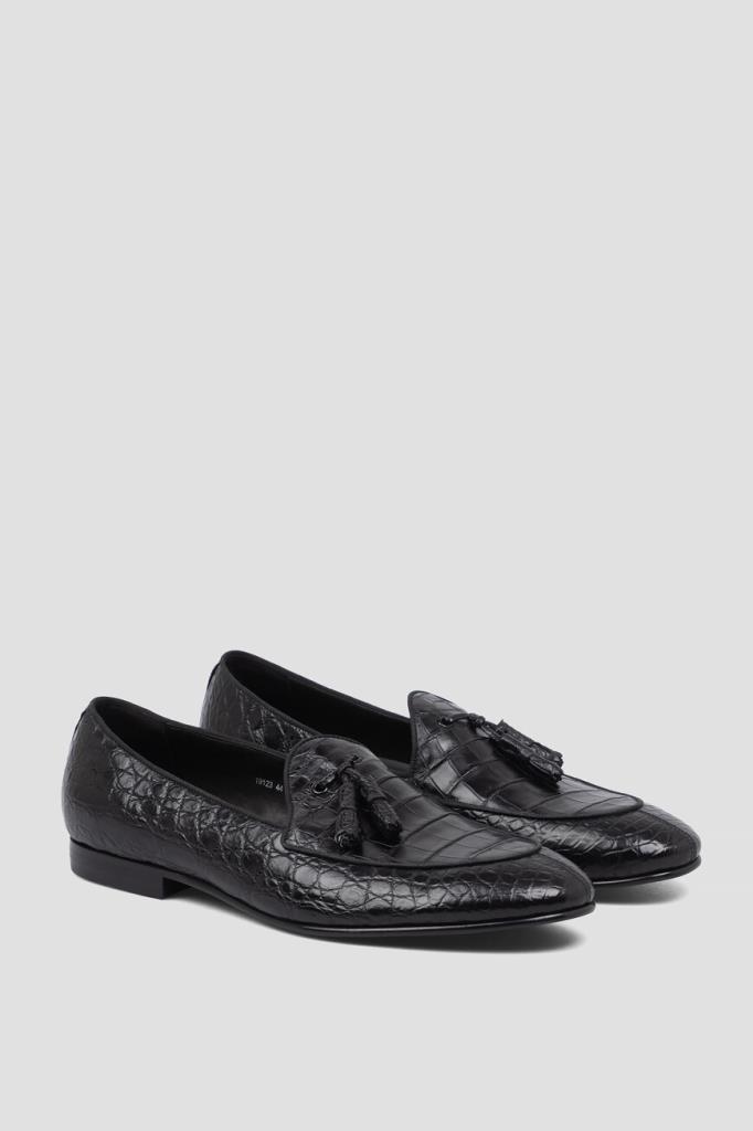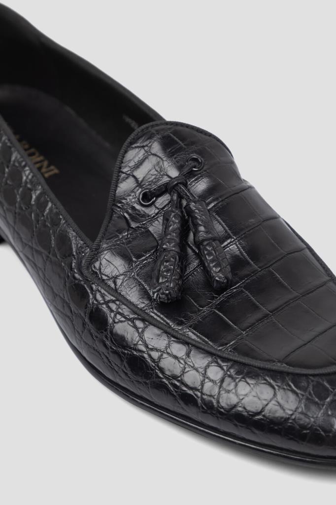 Лоферы Bardini с традиционным рельефным швом на союзке. Модель изготовлена из фактурной кожи нильского крокодила чёрного базового цвета. Декором выступают изящные завязки-кисточки с люверсами на мысе и крупные золотистые лого Дома на кожаных стельках. Изделие на кожаной подошве с невысоким устойчивым каблуком в тон завершит образы в стиле casual.