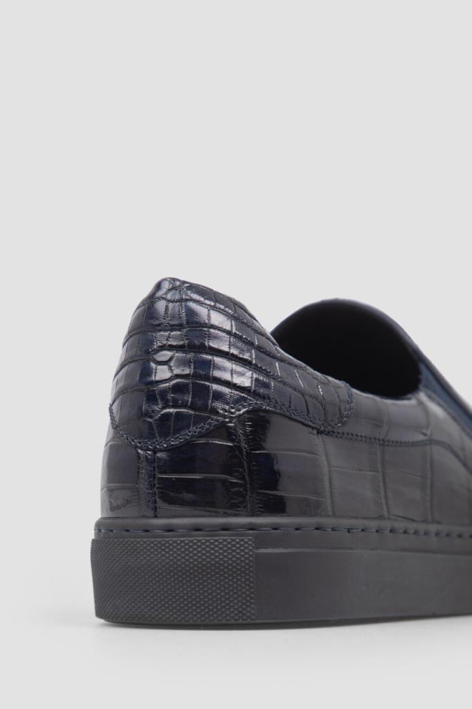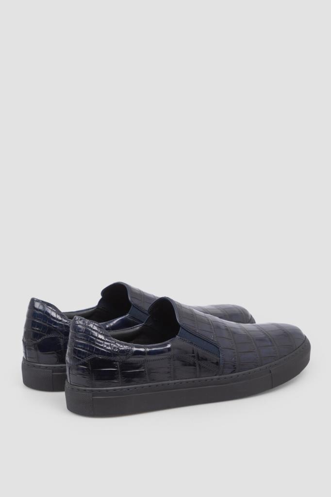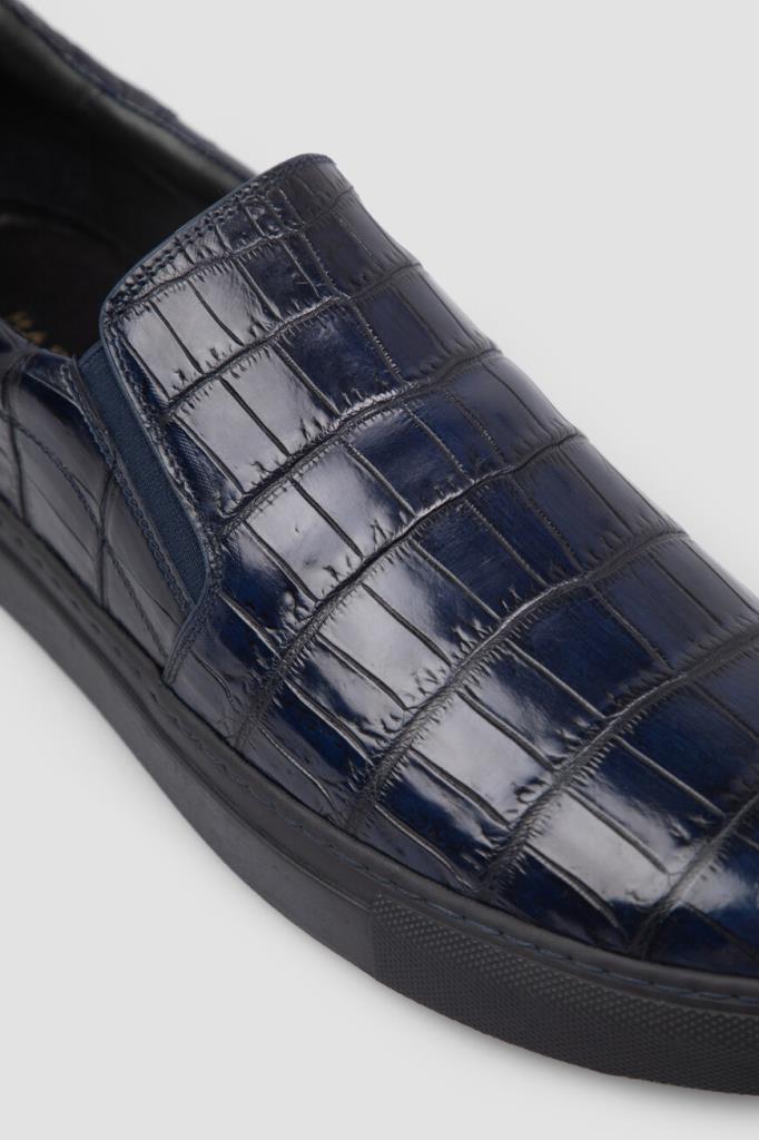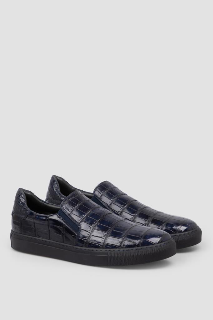 Тёмно-синие слипоны Bardini, отполированные до деликатного блеска. Для производства удобной пары используется кожа нильского крокодила с уникальным природным рисунком. По бокам размещены эластичные вставки в тон для удобства надевания, а плоская подошва пришита к верхней части модели швом Гудиер, обеспечивающим максимальную долговечность этому соединению.