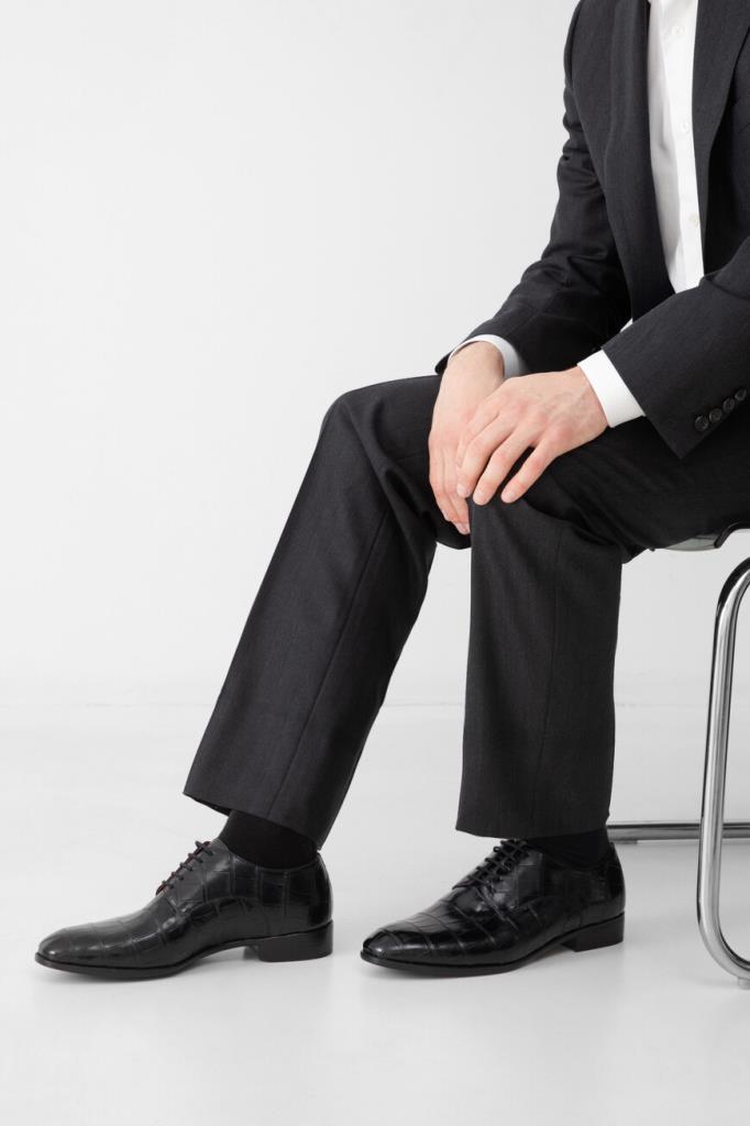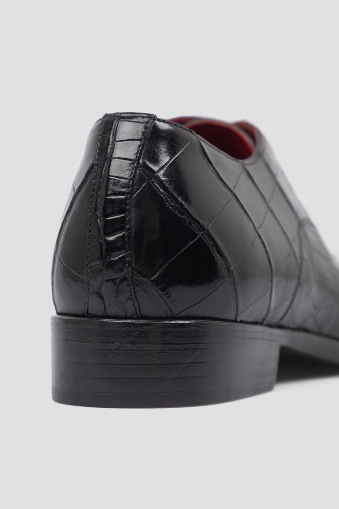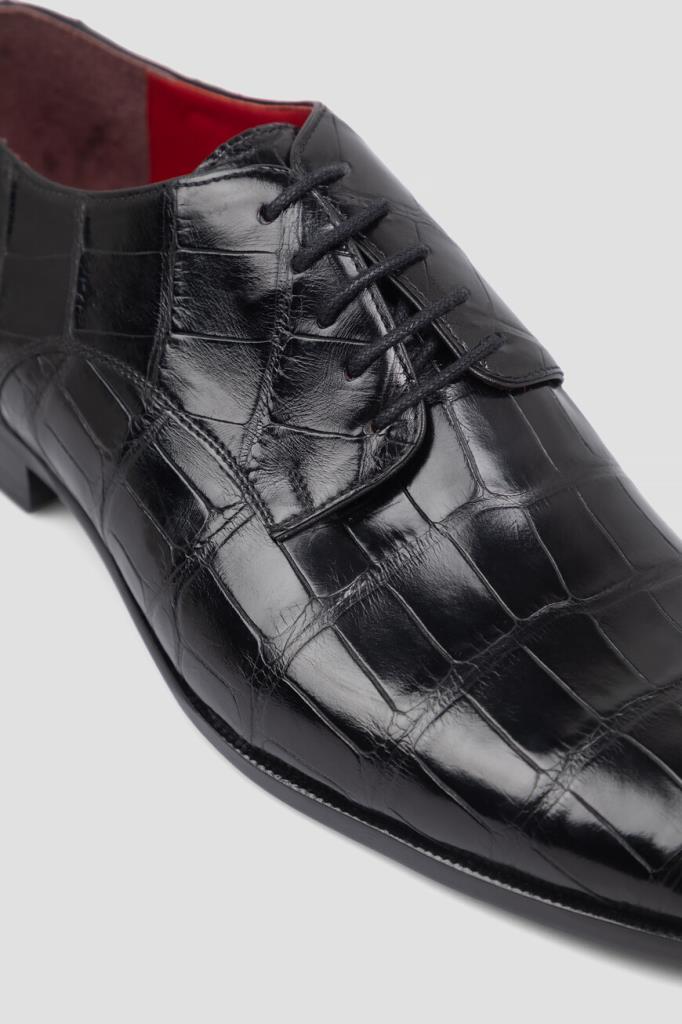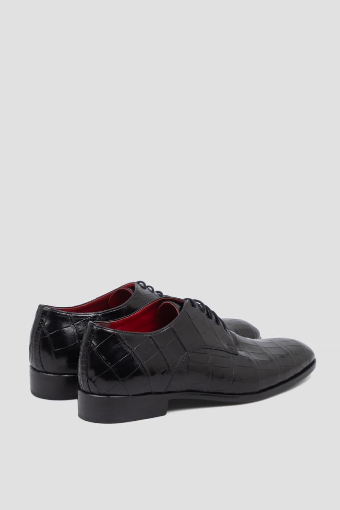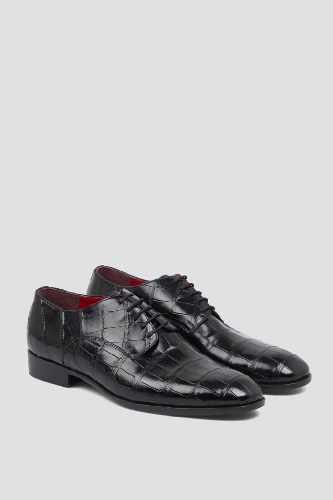 Дерби Bardini чёрного цвета с характерным природным узором. Модель, изготовленная из фактурной кожи крокодила, отличается наличием кожаной подошвы с широким устойчивым каблуком и внутренней отделкой из гладкой телячьей кожи и бархатистой замши. Изделие с традиционным для такого типа обуви открытым типом шнуровки станет превосходным завершением Ваших деловых комплектов.