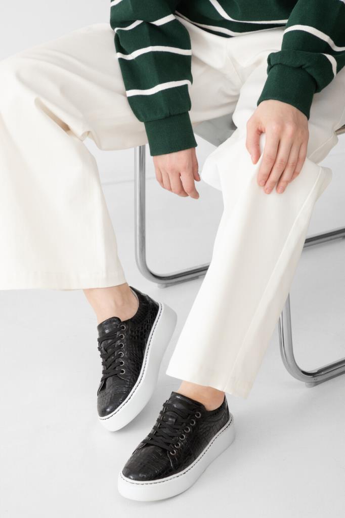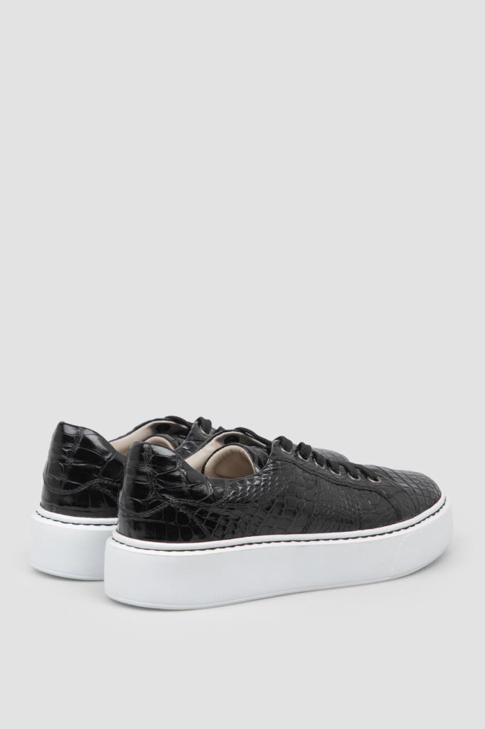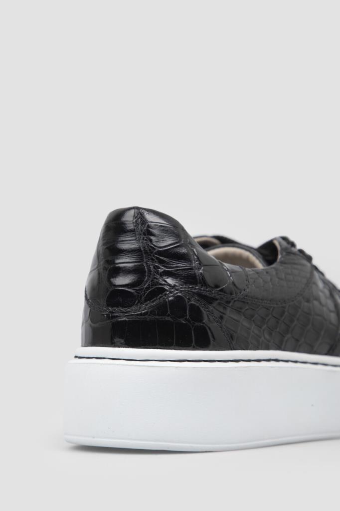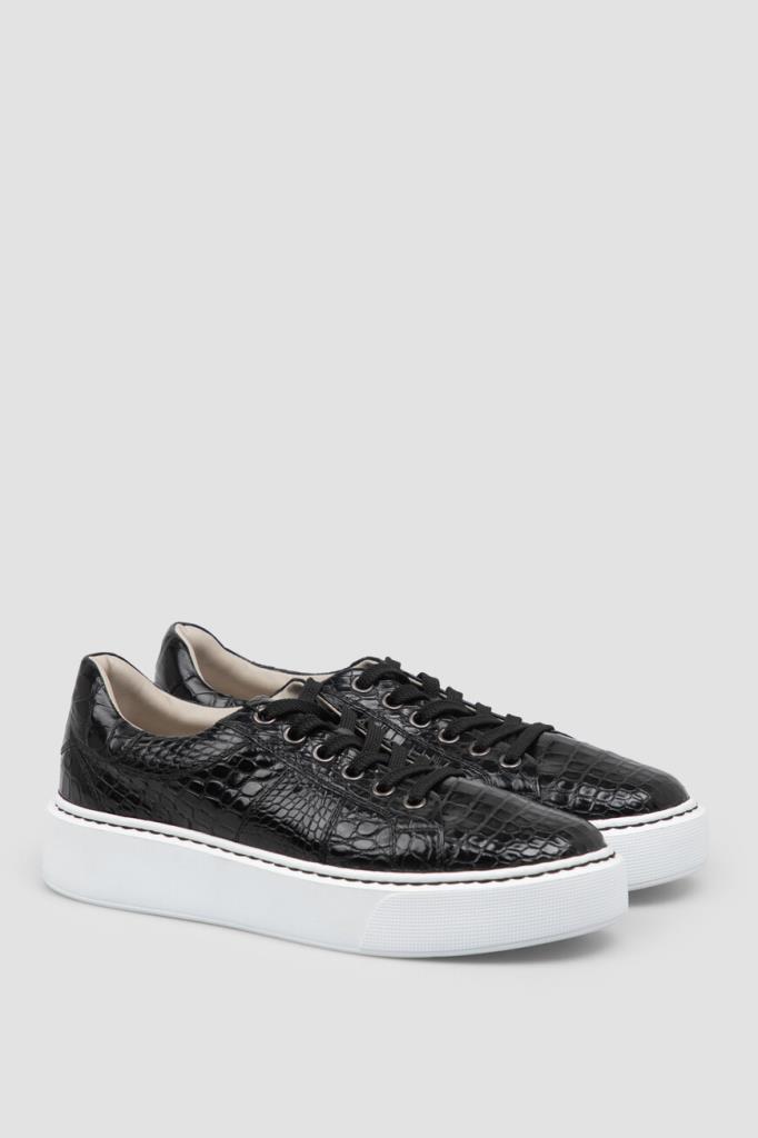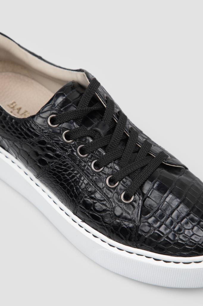 Кеды Bardini на толстой амортизирующей подошве из полиуретана. Модель изготовлена из фактурной кожи крокодила чёрного цвета с характерной чешуйчатой текстурой. О принадлежности удобной пары Дому деликатно напоминают крупные лого на кожаных стельках. Изделие надёжно фиксируется на ноге при помощи открытой шнуровки с серебристыми металлическими люверсами.