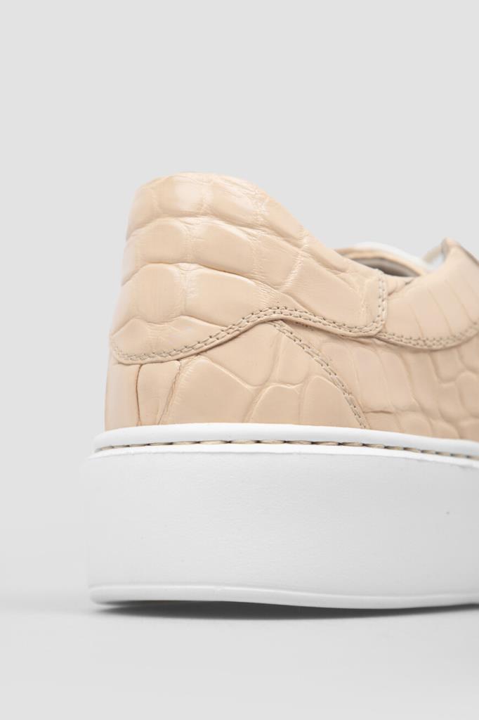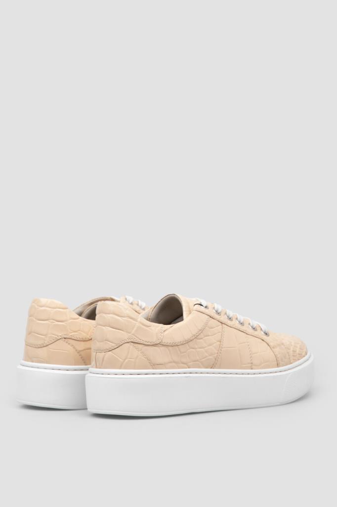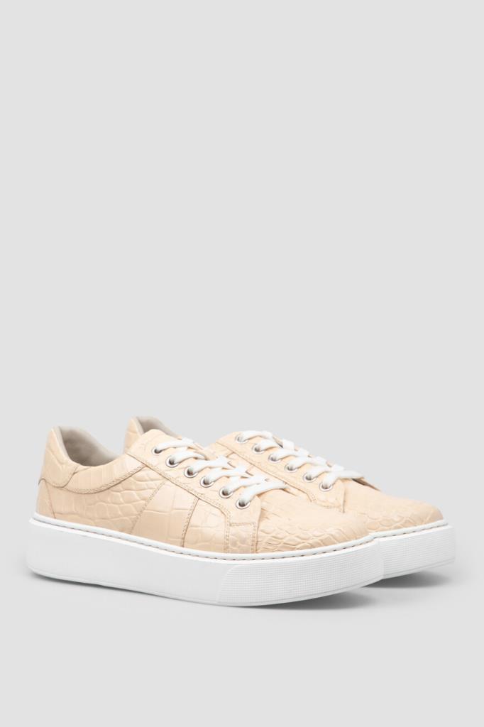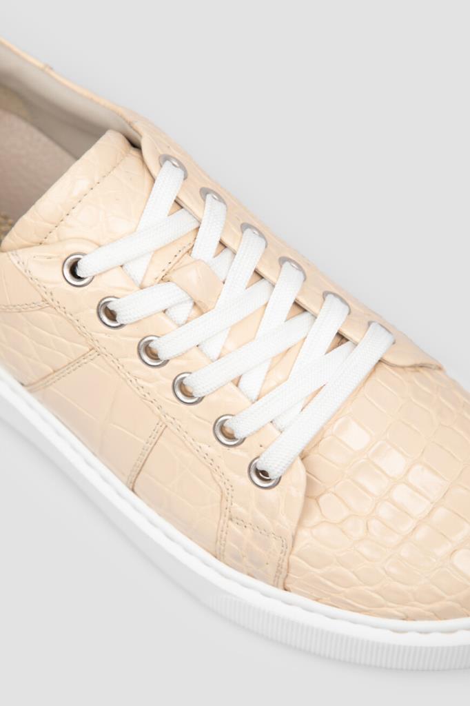 Светло-бежевые кеды с открытой перекрёстной шнуровкой от Bardini. Для производства модели с широкой колодкой выбрана фактурная кожа крокодила естественным чешуйчатым рисунком. Атрибутами Дома являются лого золотого оттенка на кожаных стельках. Отличительными особенностями удобной пары стали толстая прошитая подошва белого цвета, выполненная из полиуретана, и внутренняя отделка из тонкой телячьей кожи.