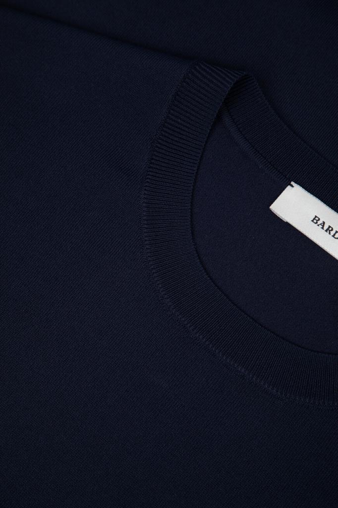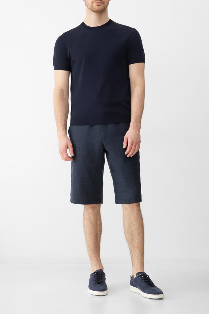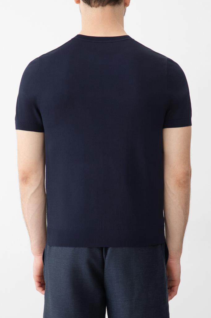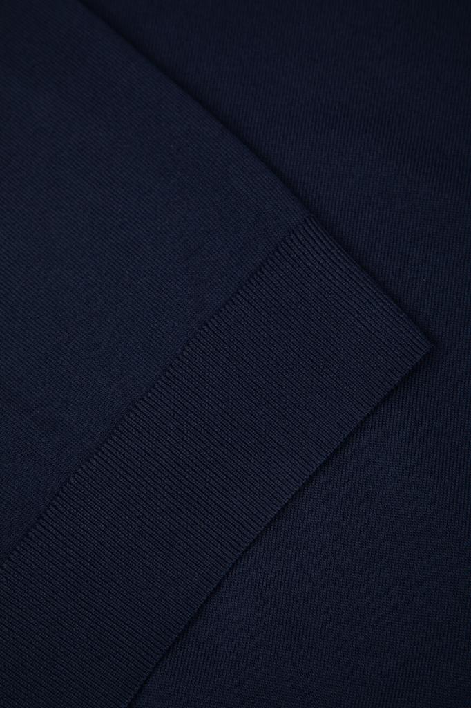Футболка-джемпер тёмно-синего цвета комфортно садится по фигуре. Это достигается благодаря наличию у модели широкого эластичного пояса и манжет-резинок, а также выверенному по фигуре крою. Для производства повседневной модели используется мягкий трикотаж на основе прочного нейлона и вискозного волокна, связанный лицевой гладью.