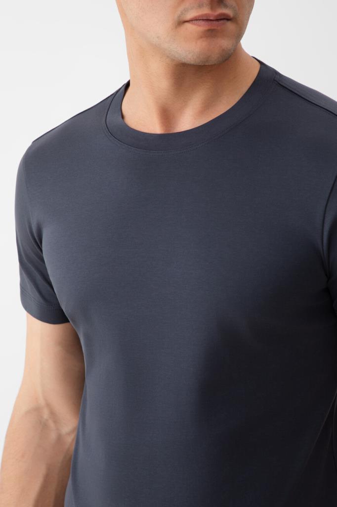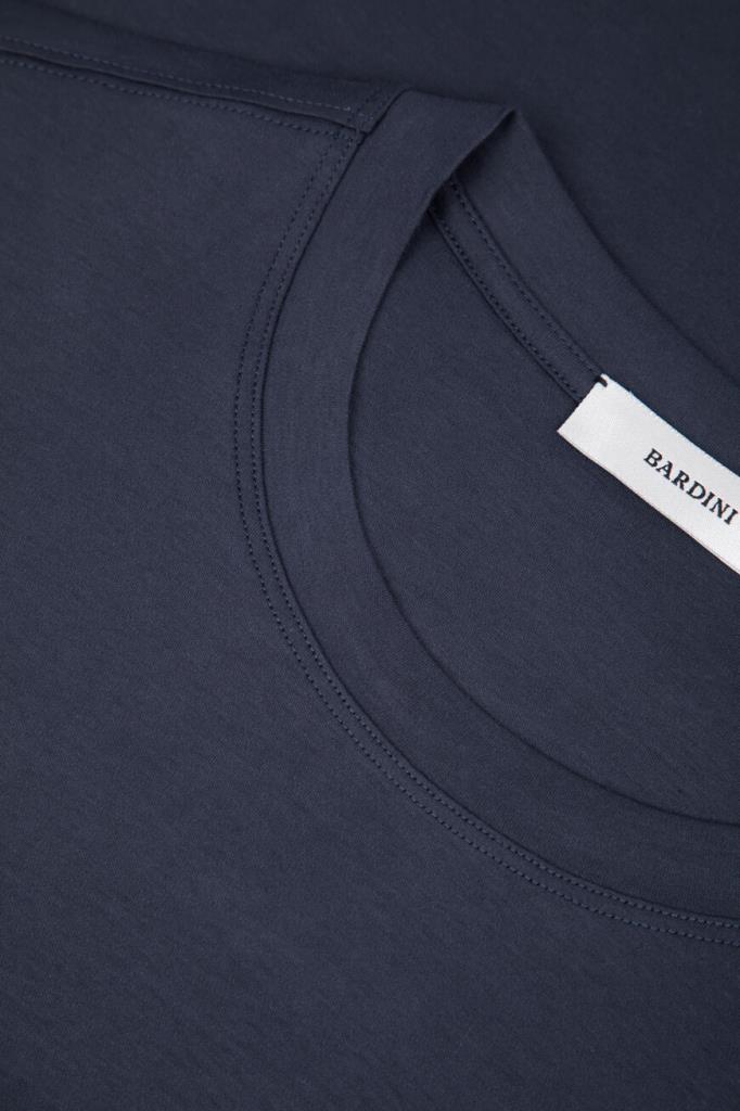 Хлопковая футболка от Bardini обеспечит комфорт в течение дня. Приятный на ощупь дышащий трикотаж тёмно-синего цвета почти не мнётся и не деформируется со временем. Особенностями повседневной модели стали наличие круглого выреза горловины, подобранного на резинку, и полное отсутствие декора.