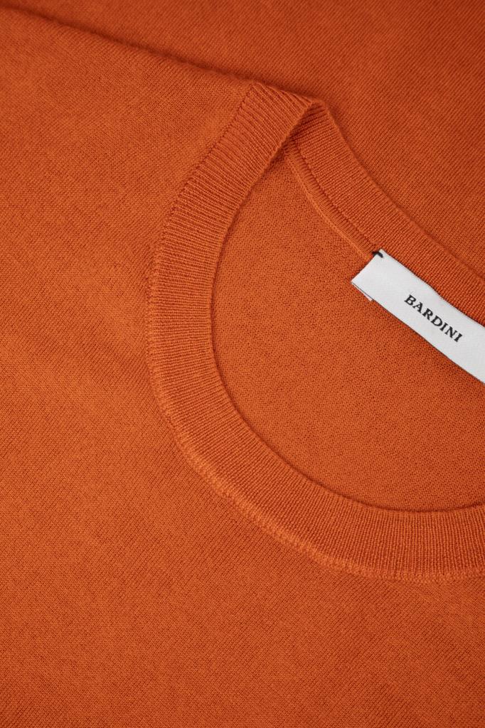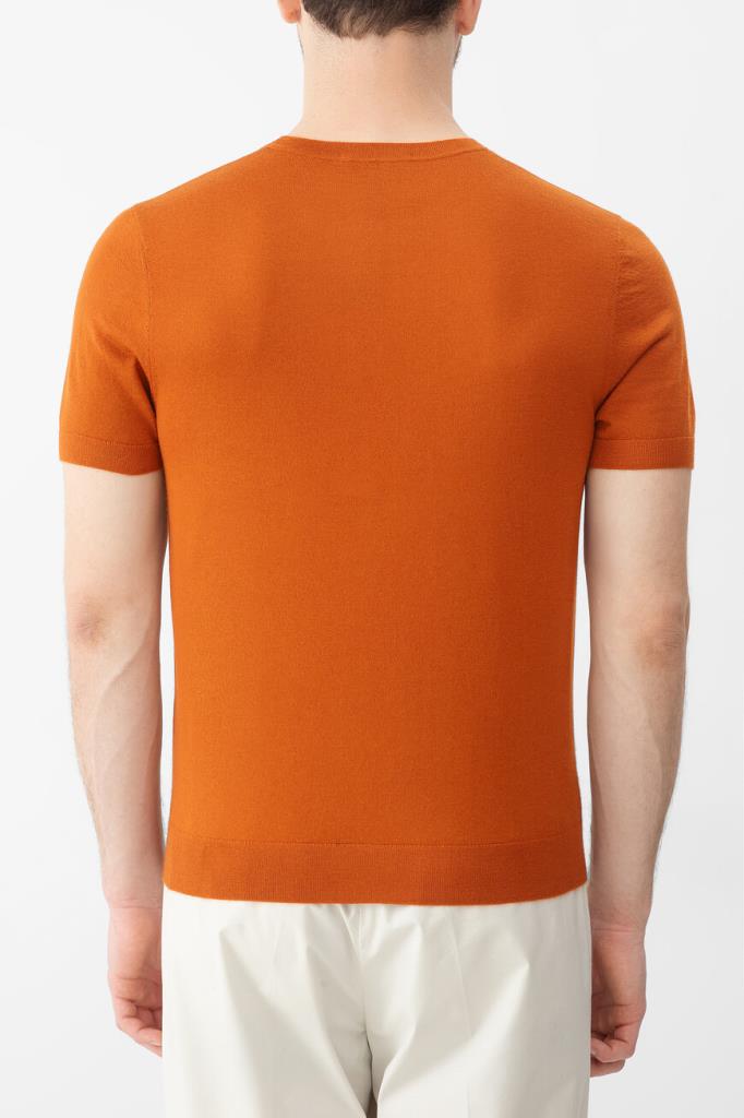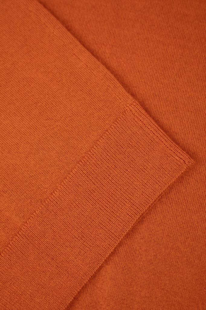 Футболка-джемпер от Bardini с широким эластичным поясом и манжетами на резинке. Модель из мягкого кашемира оранжевого оттенка комфортно садится по фигуре и совсем не колется. Отличительной особенностью изделия прямого силуэта стала чулочная вязка.