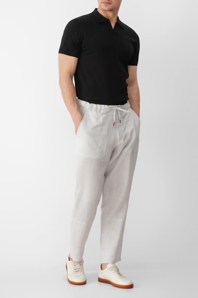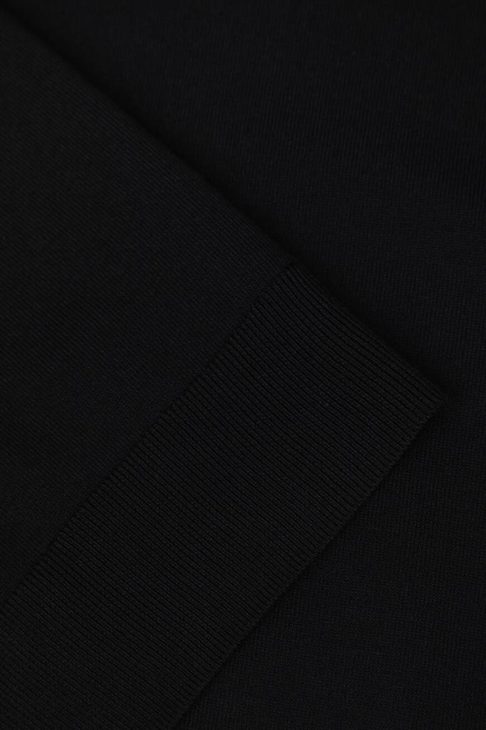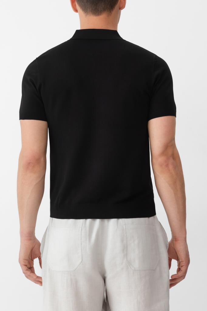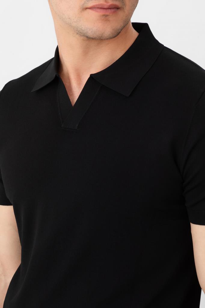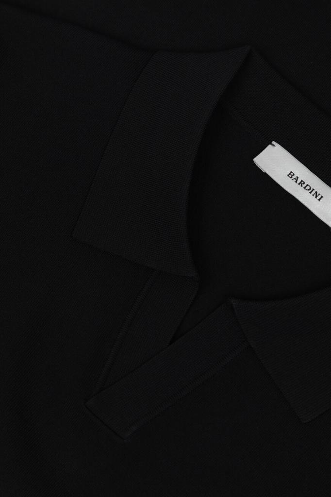 Чёрное поло Bardini с короткими рукавами. Изделие выполнено из прочного нейлона и вискозного волокна без знакового декора Дома. Отличительной деталью является изящный V-образный вырез горловины, обрамлённый резинкой. Модель без застёжки станет частью образа с брюками с четырьмя крупными накладными карманами, выполненными в стиле рабочей униформы.