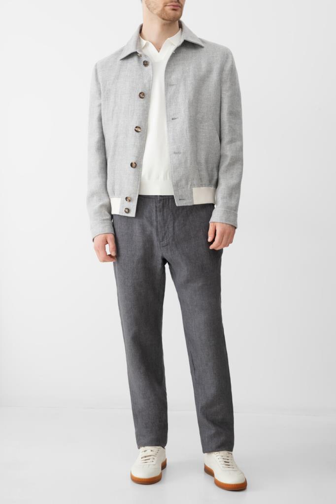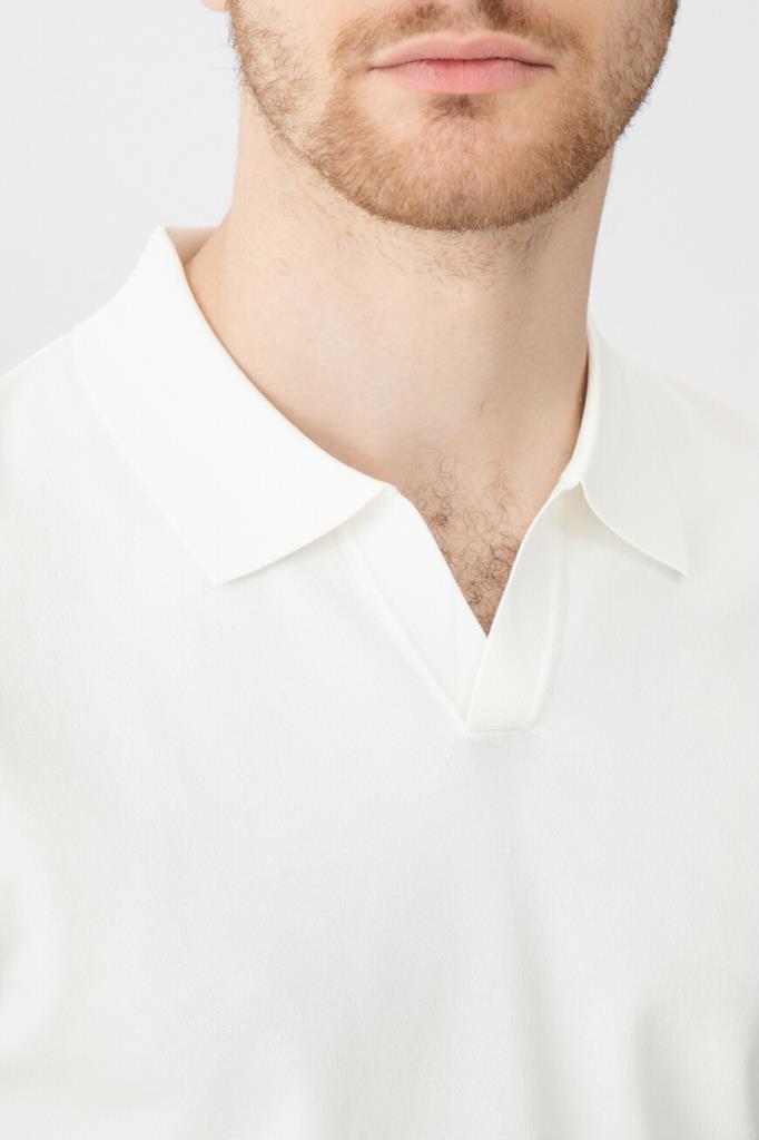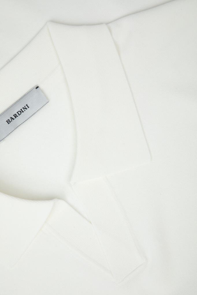 Поло с изящным V-образным вырезом горловины от Bardini. Для производства изделия прямого силуэта без застёжки выбран мягкий трикотаж на основе прочного нейлона и вискозы белого цвета. Модель без знакового декора сыграет роль нижнего слоя в образе с курткой на крупных роговых пуговицах и брюками с четырьмя прорезными карманами.