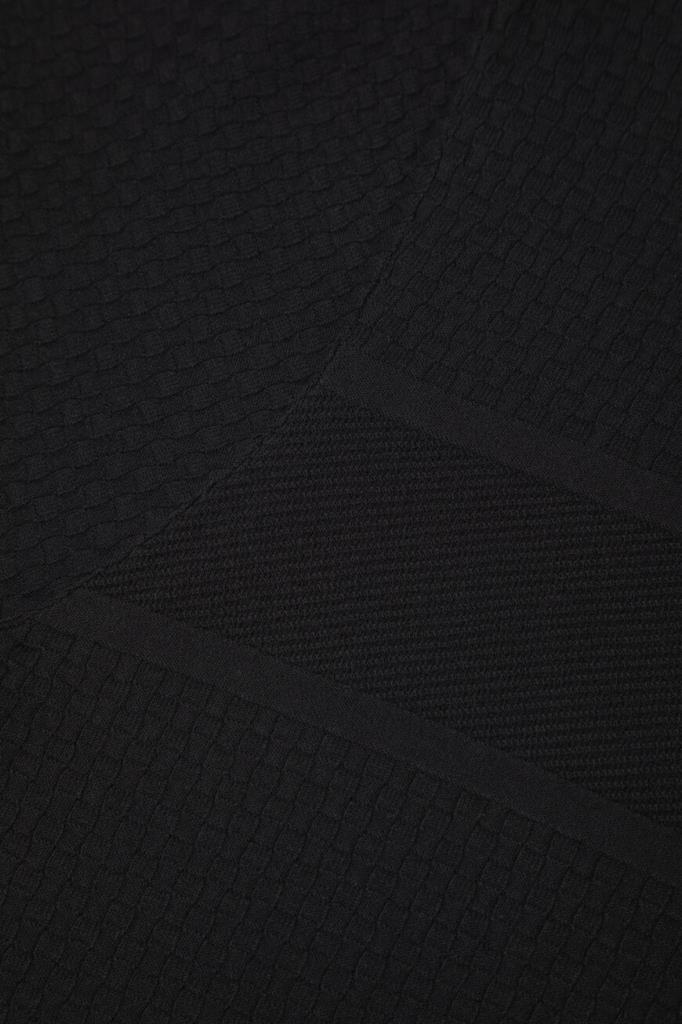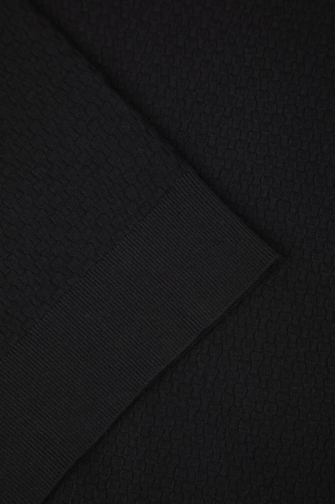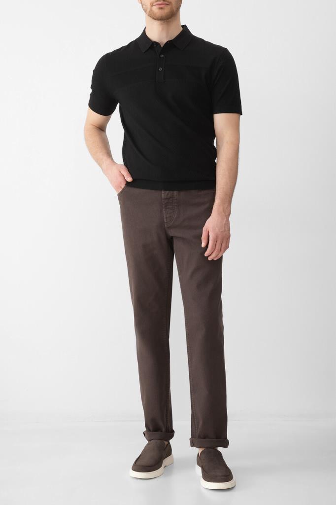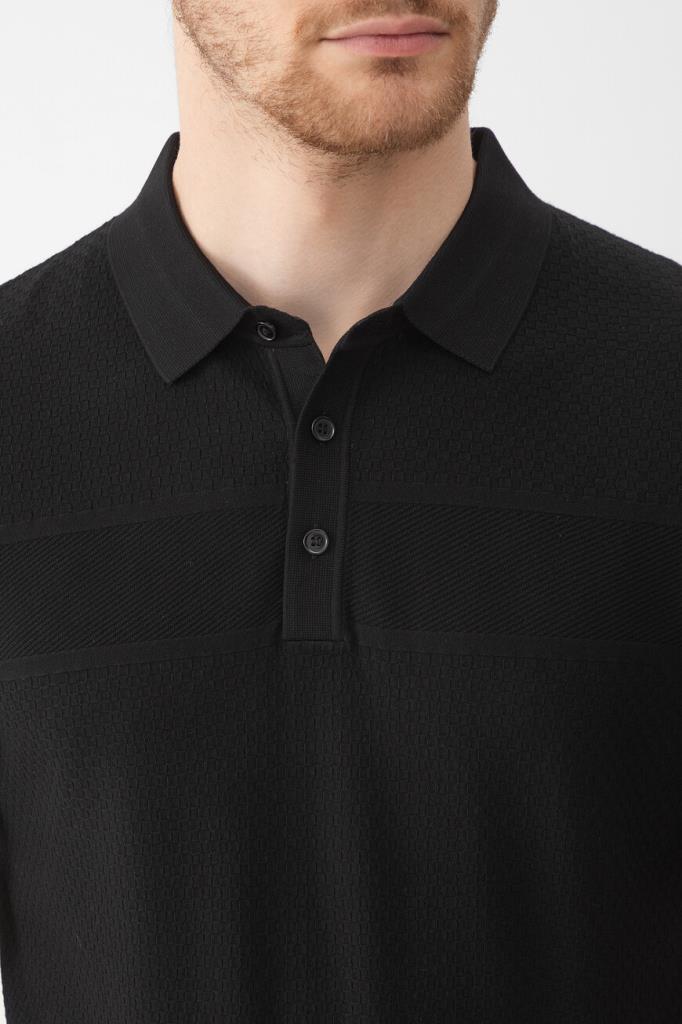 Прямое поло чёрного базового цвета от Bardini. Повседневная модель изготовлена из мягкого трикотажа на основе прочного полиэфира и вискозы. Отличительными деталями являются плетёный геометрический узор и фактурная горизонтальная полоса на груди в тон. Изделие застёгивается на три пуговицы с очерченной планкой сверху и превосходно сочетается с другими элементами мужского casual-гардероба.