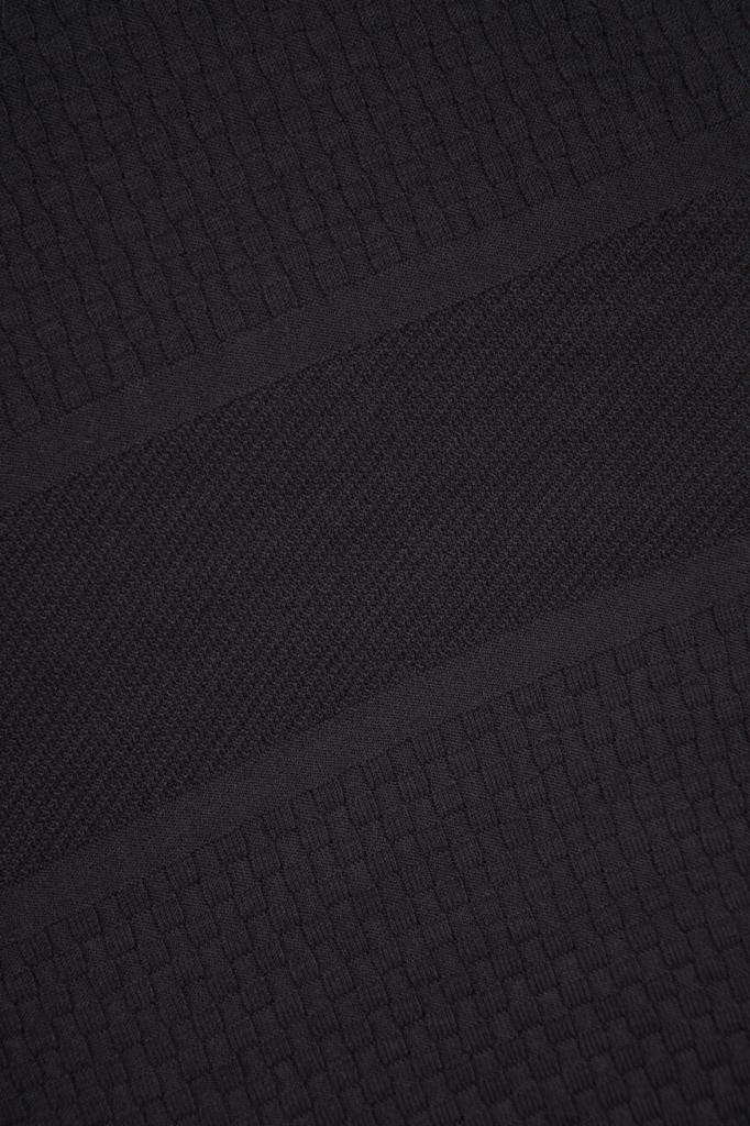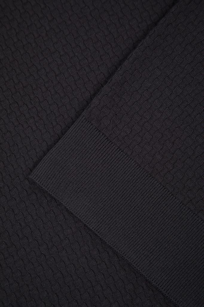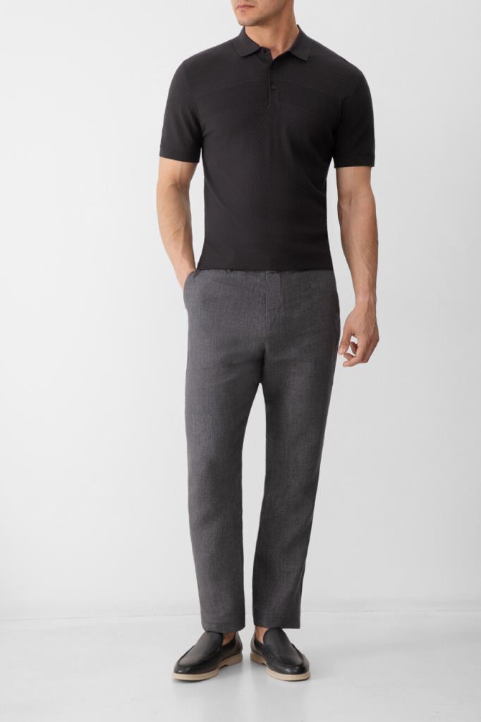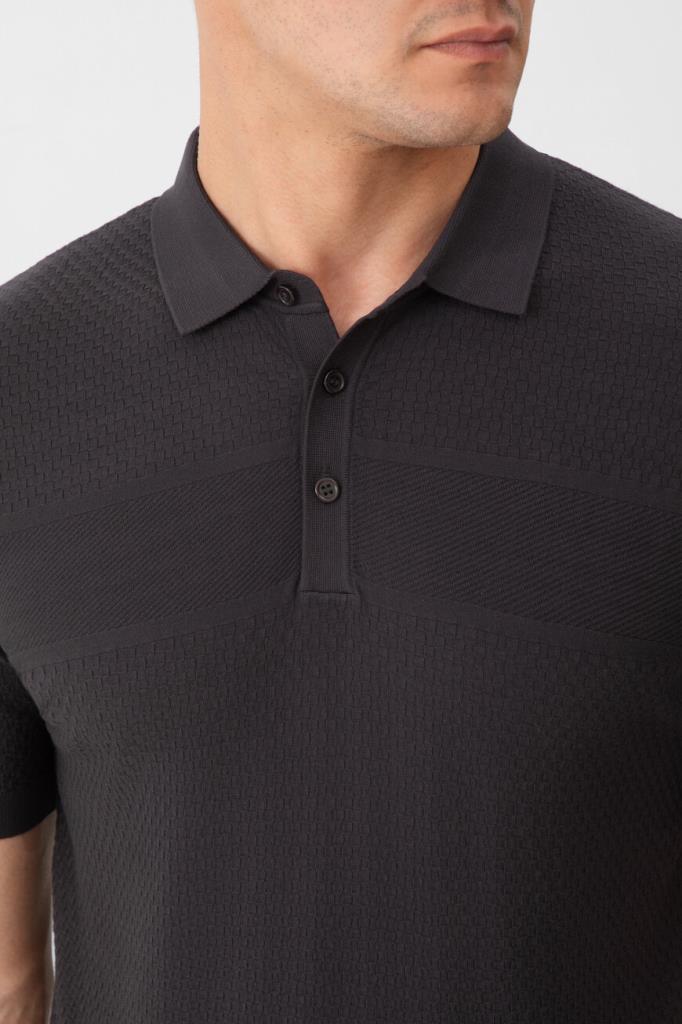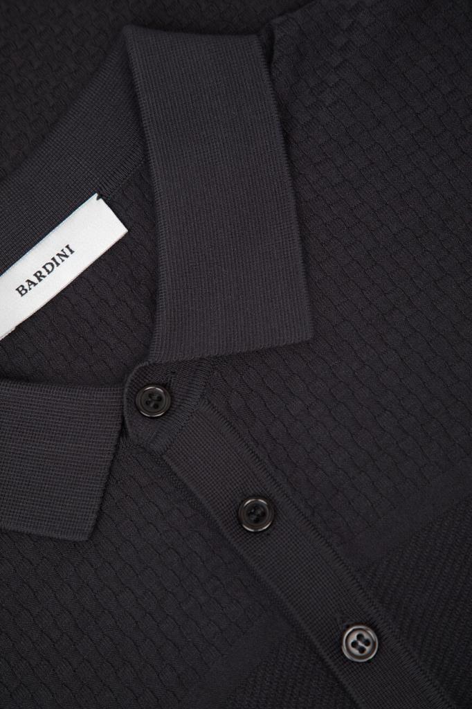 Тёмно-серое поло Bardini с неброским тональным декором. Изделие выполнено из мягкого трикотажа на основе прочного полиэфира и вискозного волокна и украшено плетёным геометрическим узором и фактурной горизонтальной полосой на груди. Для оптимальной посадки повседневной модели по фигуре предусмотрены широкий эластичный пояс и манжеты-резинки.
