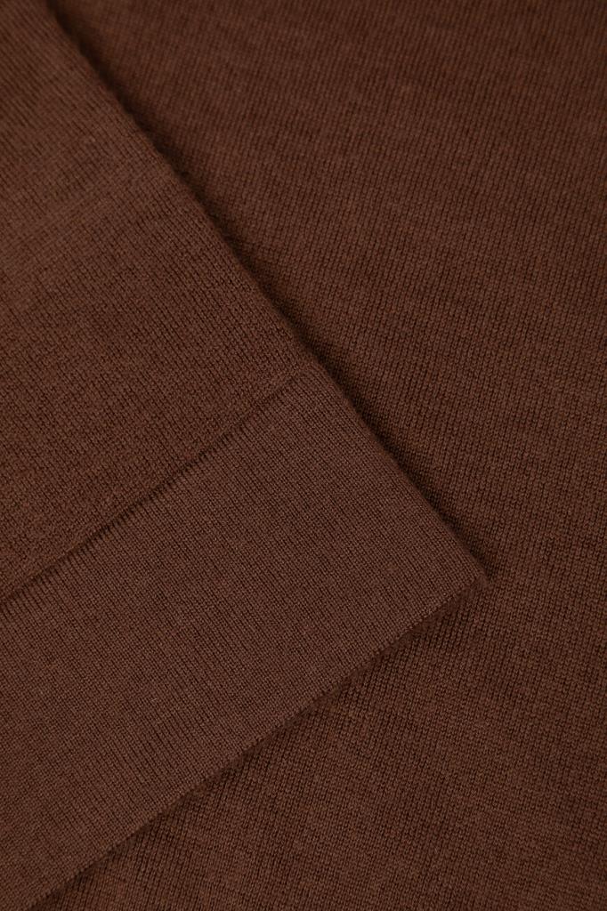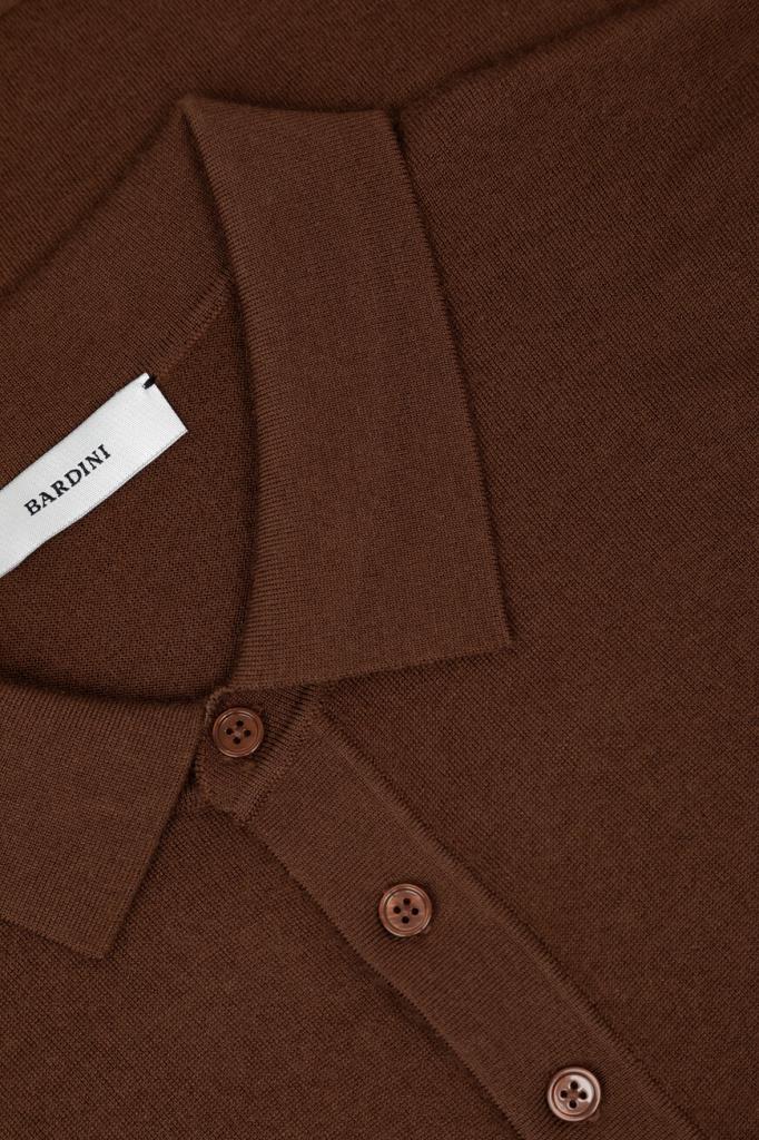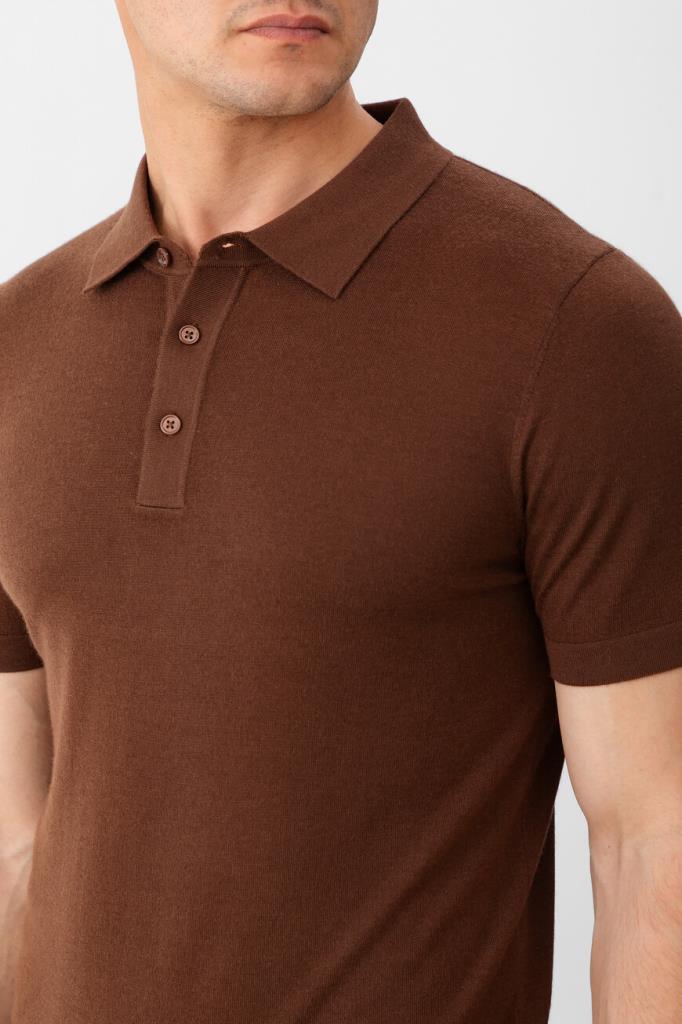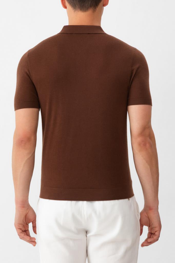 Кашемировое поло коричневого цвета от Bardini. Конструкция повседневной модели, изготовленной из тонкого шелковистого материала лицевой гладью, предполагает прямой силуэт и наличие коротких рукавов. Изделие на трёх перламутровых пуговицах сверху комфортно садится по фигуре благодаря широкому эластичному поясу и манжетам-резинкам.