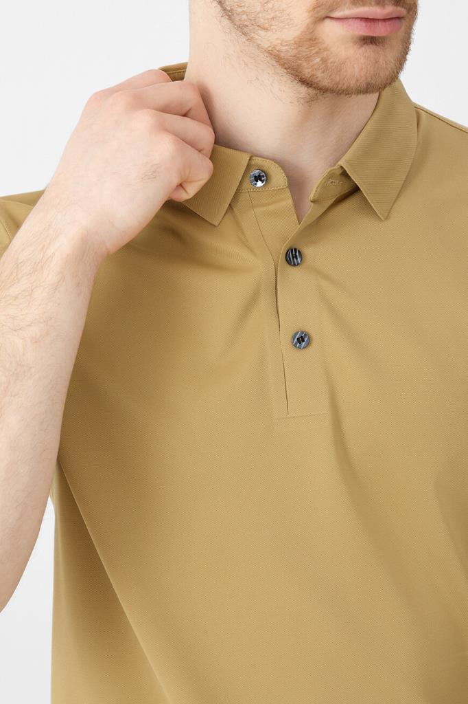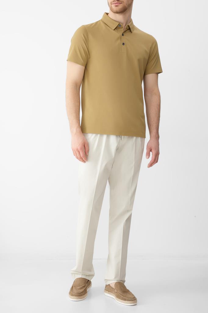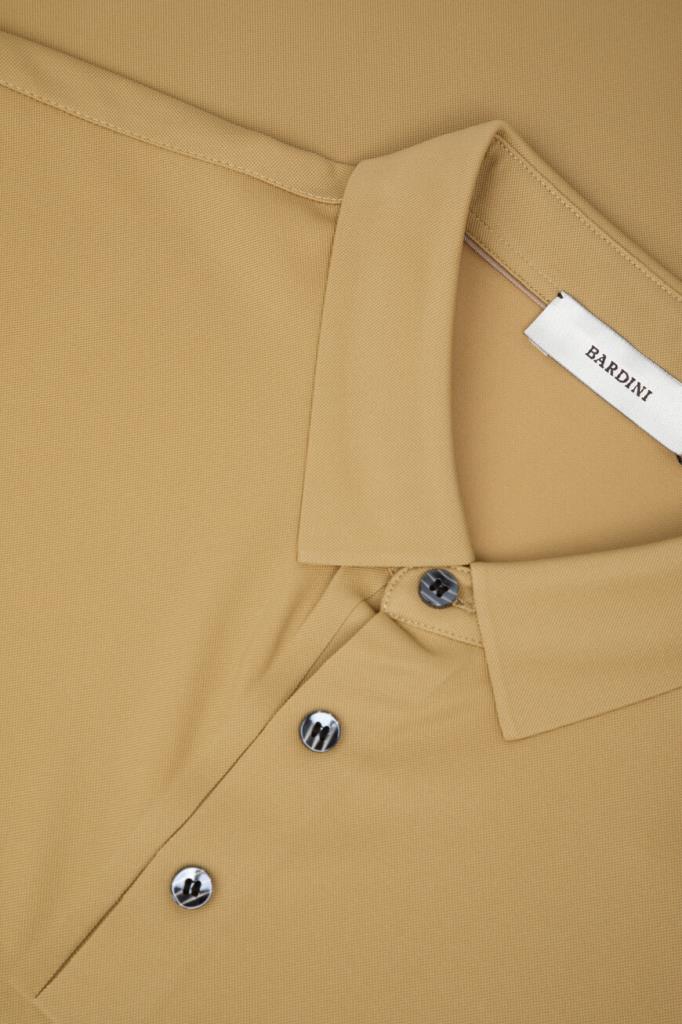 Фактурное поло горчичного оттенка от Bardini. Модель изготовлена из мягкого трикотажа на основе полиэфира, прочного эластичного нейлона и гладкого шёлка. Изделие с короткими рукавами застёгивается на брендированные перламутровые пуговицы сверху и сочетается с вещами в любой цветовой гамме.