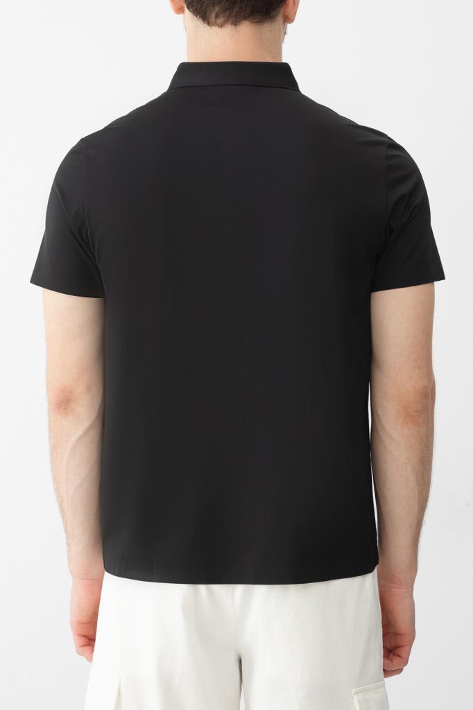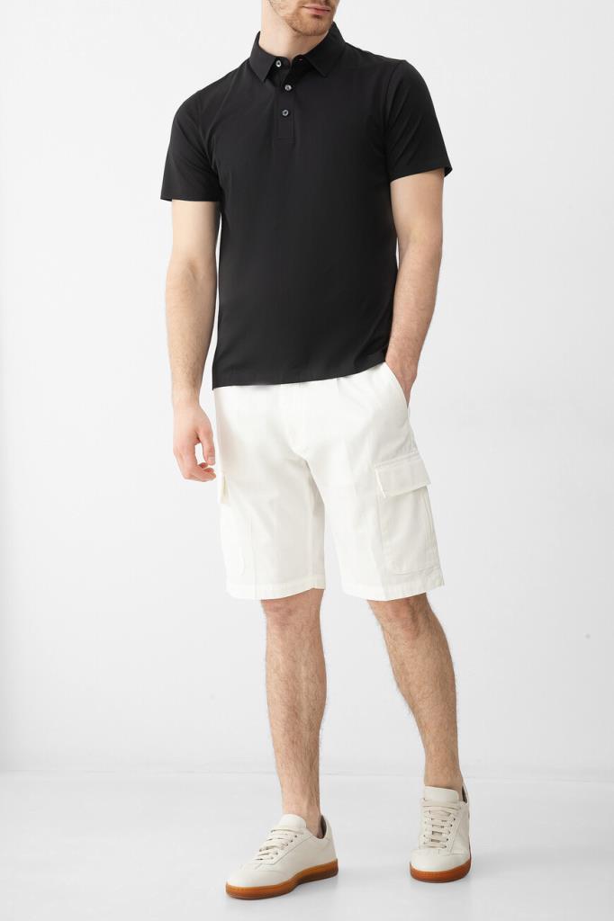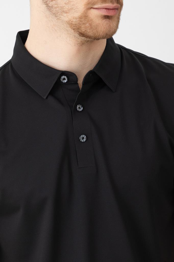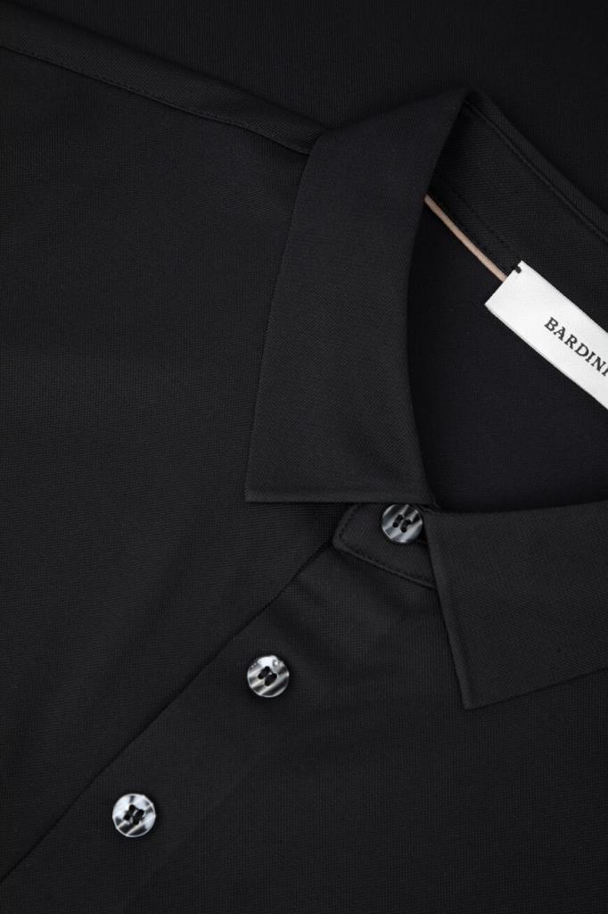 Базовое поло Bardini с фактурным узором в тон. Для производства изделия прямого силуэта выбран эластичный трикотаж на основе полиэстера, прочного нейлона и гладкого шёлка. Конструкция повседневной модели предполагает наличие коротких рукавов и застёжки на три перламутровые пуговицы.