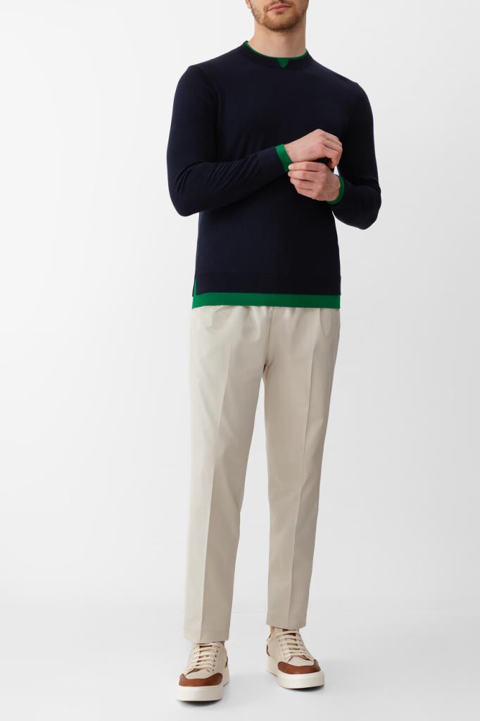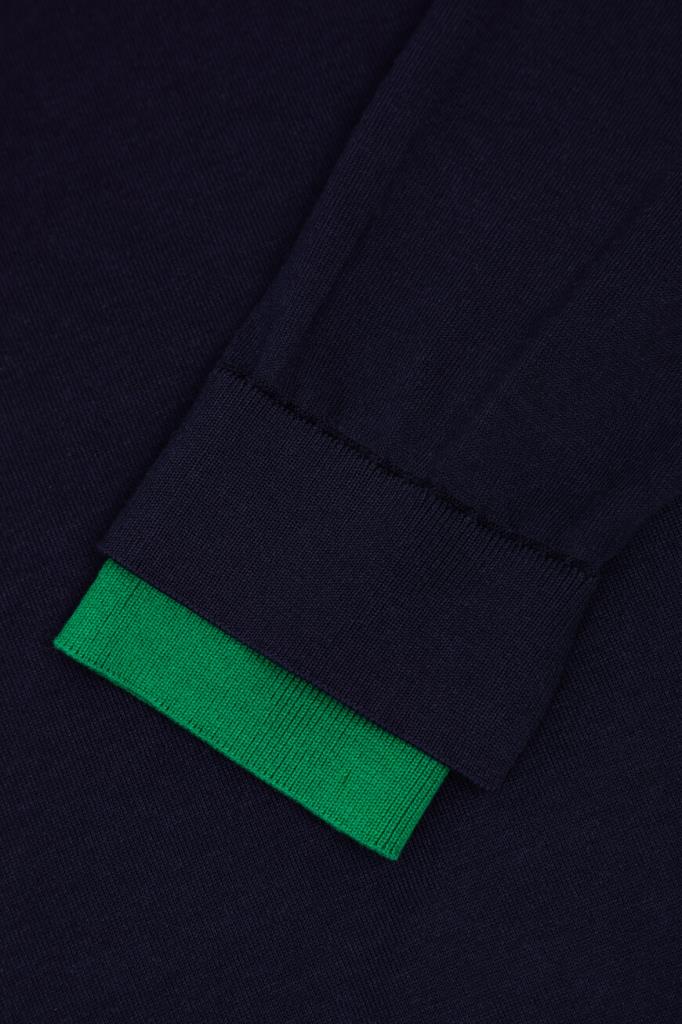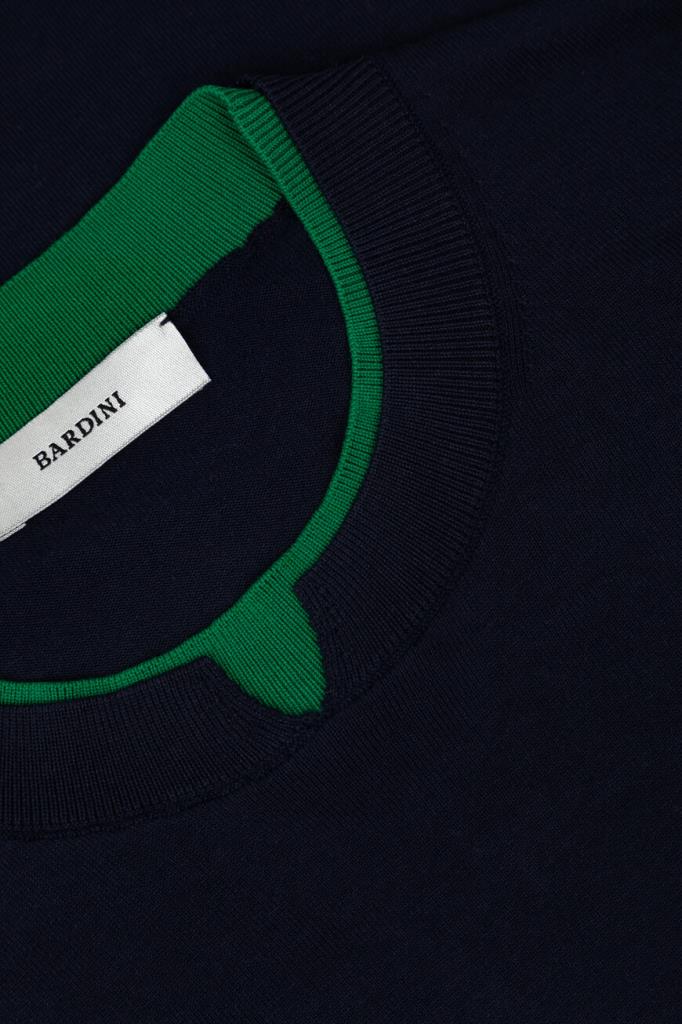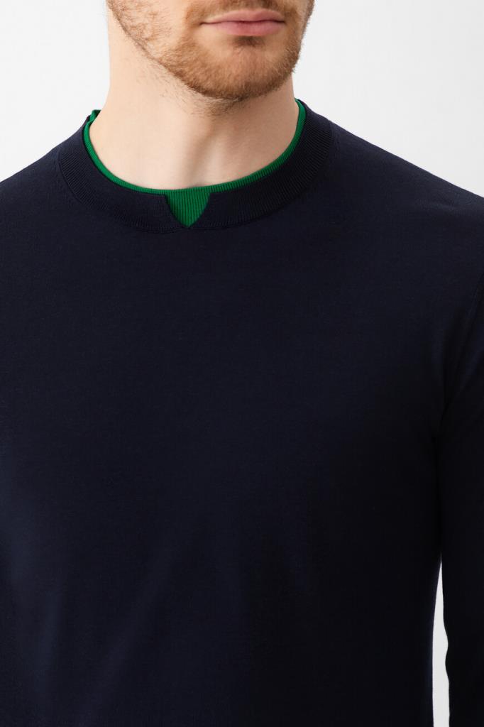 Тёмно-синий джемпер прямого силуэта от Bardini. Фасон повседневной модели, выполненной из трикотажа на основе мягкого хлопка, гипоаллергенного лиоцелла и гладкого шёлка, характеризуется наличием длинных рукавов и изящных неглубоких вырезов и выступающих вставок-полос зелёного оттенка на круглом вырезе горловины, манжетах и широком поясе. Акцентные детали создают двухслойный эффект наложения.