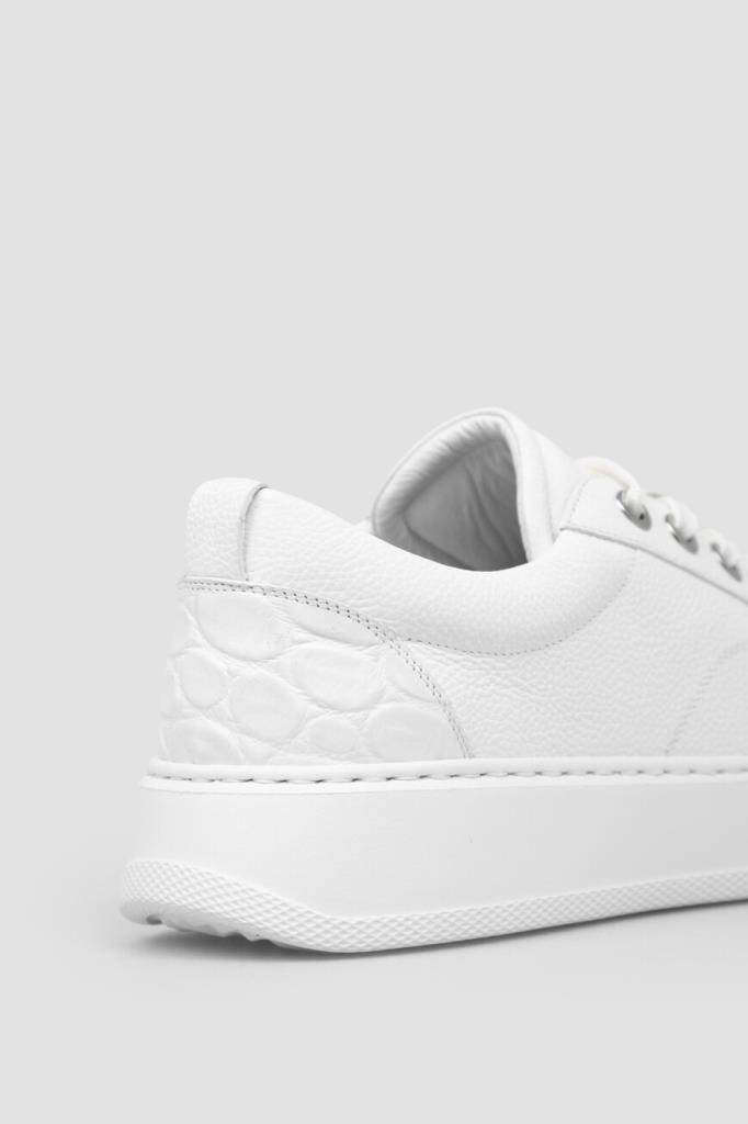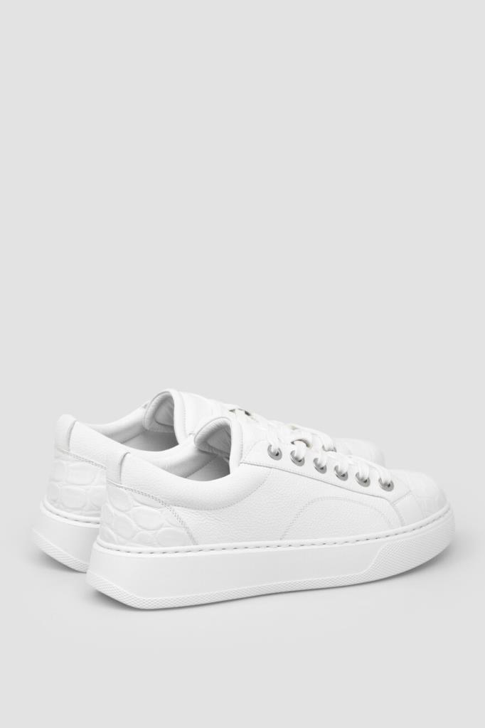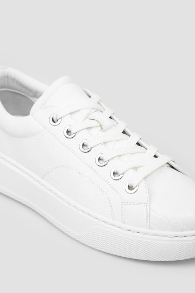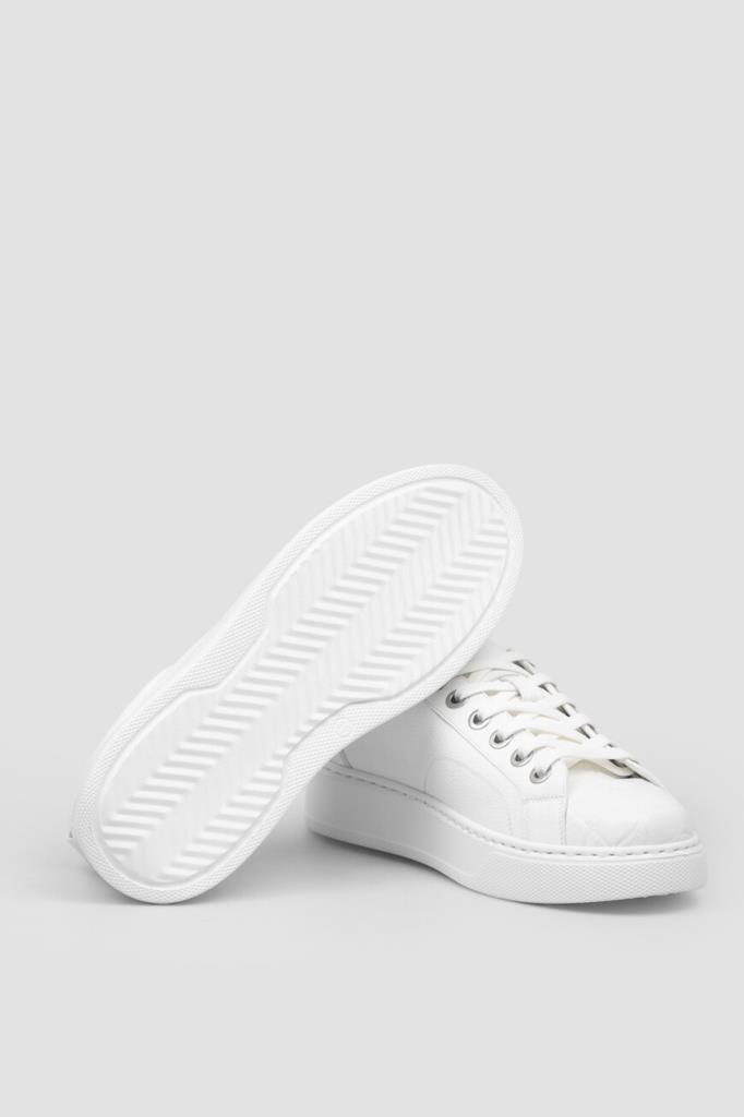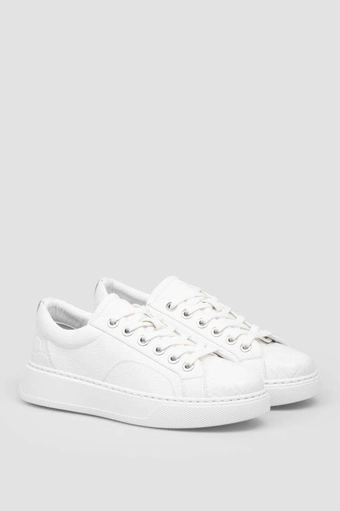 Белоснежные кеды Bardini с широкой колодкой. Для создания удобной пары используется зернистая телячья кожа со вставками из фактурной кожи крокодила на носке и заднике в тон. Модель отличается наличием перекрёстной многорядной шнуровки с люверсами из металла и прошитой плоской подошвы с рифлением снизу для надёжного сцепления с дорогой.