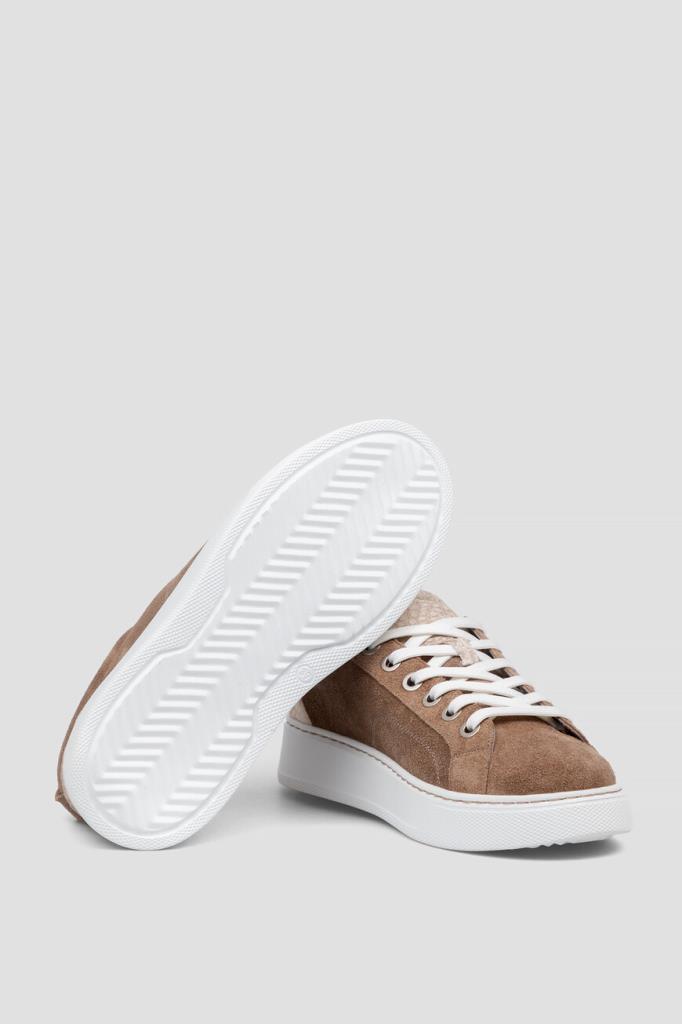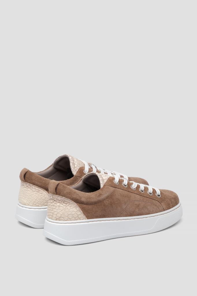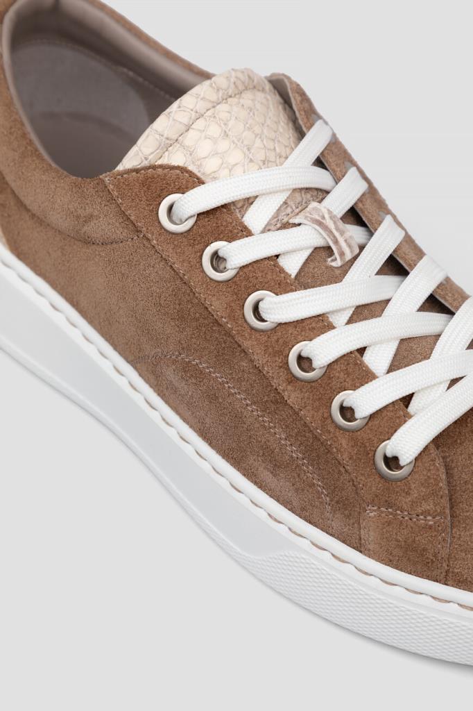 Комбинированные кеды от Bardini в бежево-коричневой гамме. Для создания изделия с перекрёстной многорядной шнуровкой белого цвета используется бархатистая замша со вставками из кожи крокодила с характерным чешуйчатым узором на язычке и в задней части. Отличительными деталями являются люверсы из серебристого металла, лента для удобства надевания сзади и наличие плоской прошитой подошвы из полиуретана с рифлением снизу для надёжного сцепления с дорогой.
