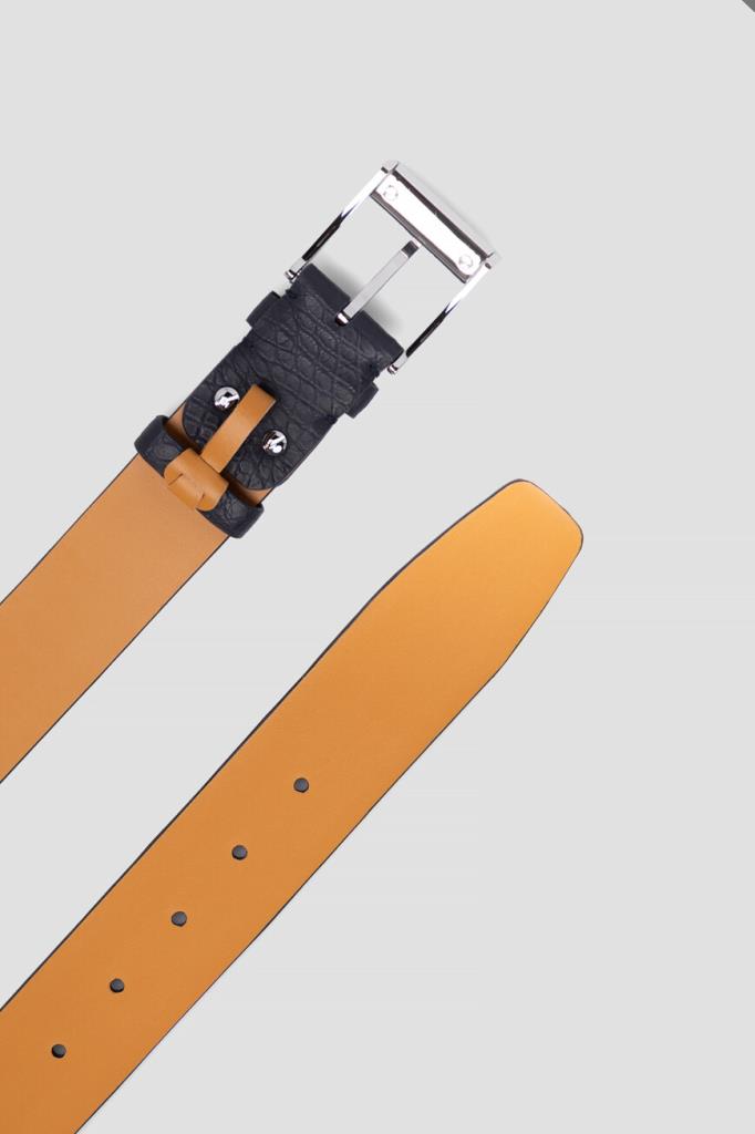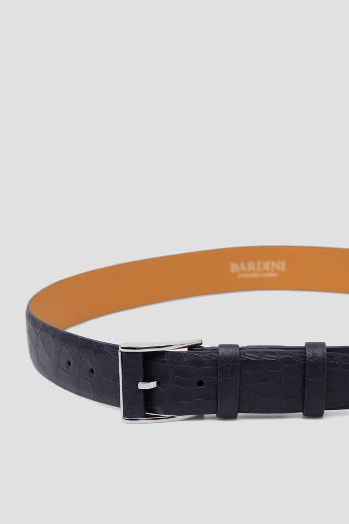 Тёмно-синий ремень ручной работы от Bardini. Модель изготовлена из фактурной кожи крокодила с характерным природным рисунком. Конструкция аксессуара предполагает наличие классической латунной пряжки с язычком, высококачественным и прочным гальваническим покрытием и кожаной вставкой в тон.