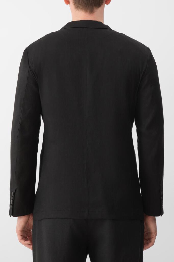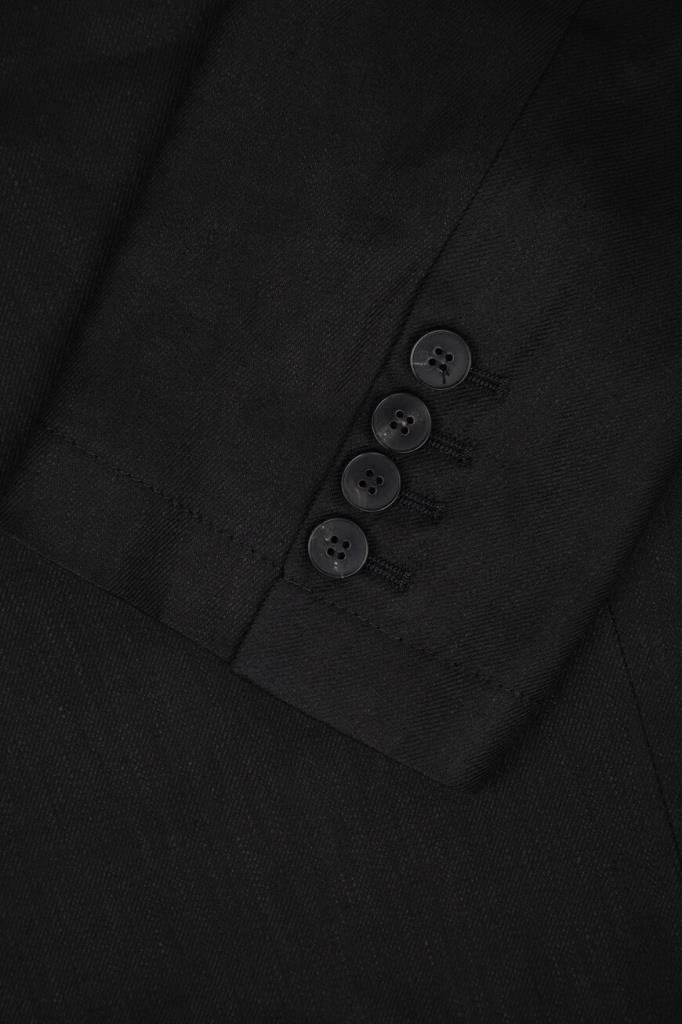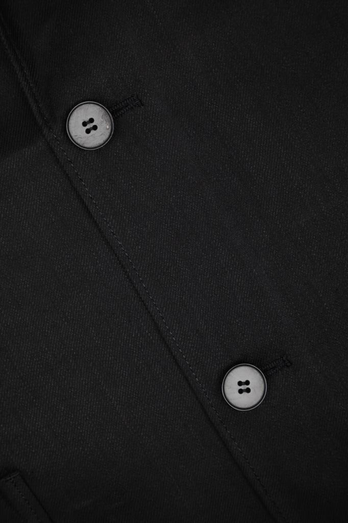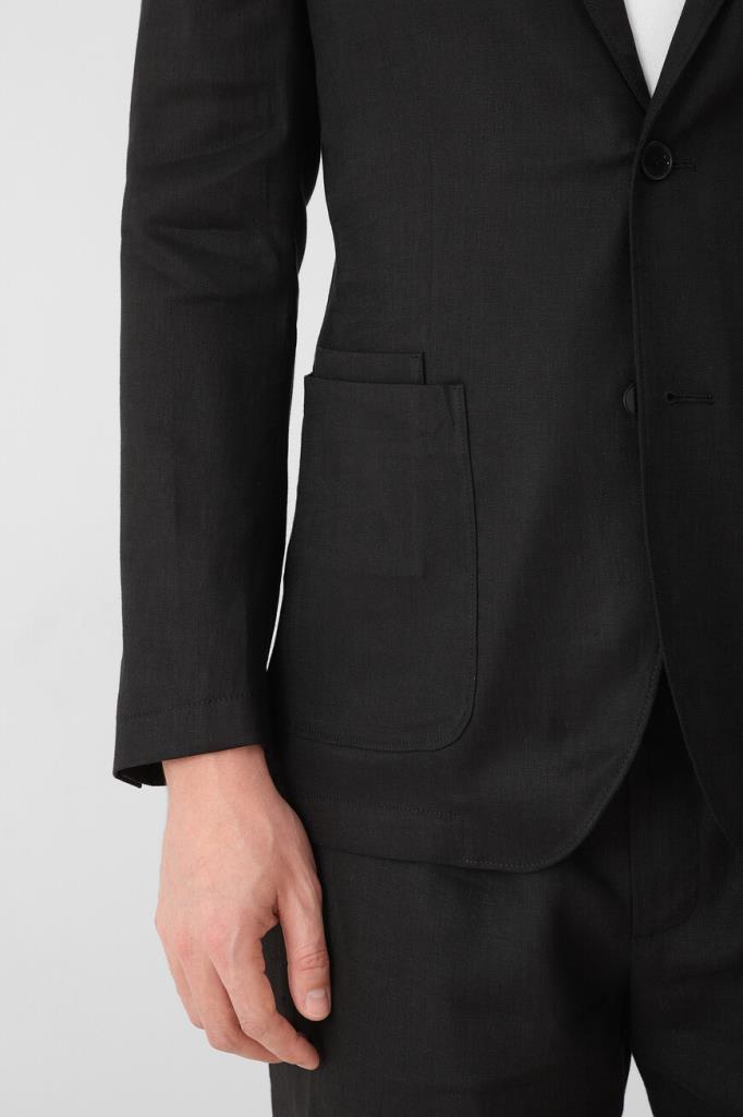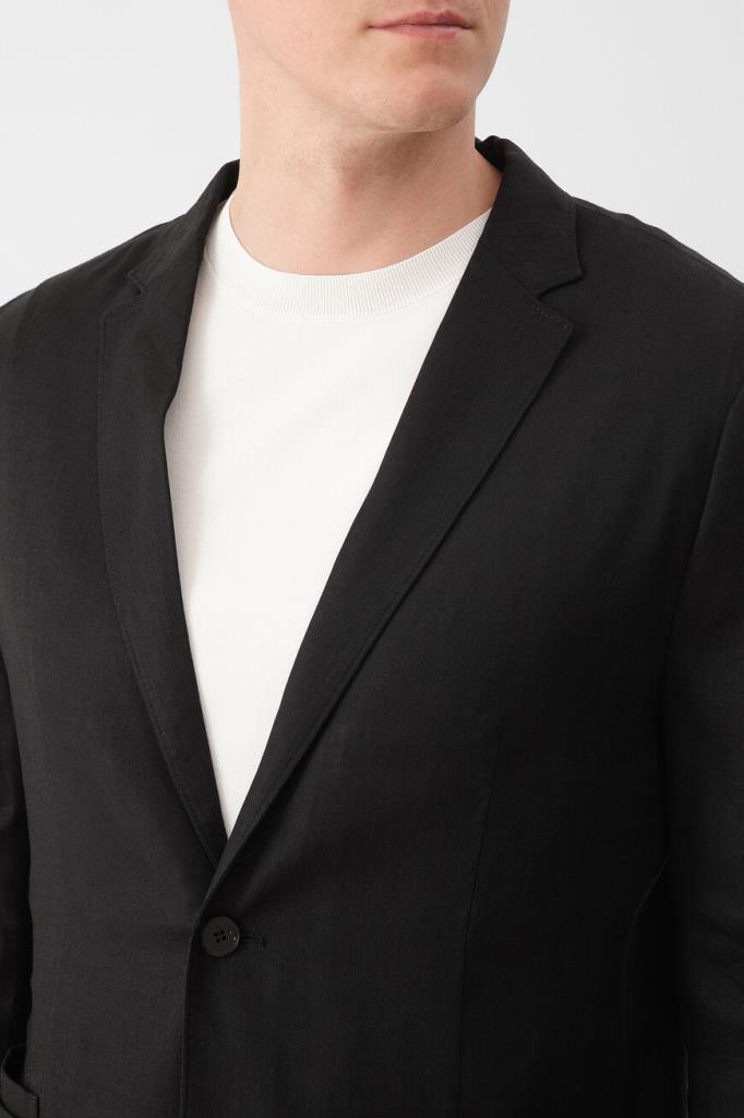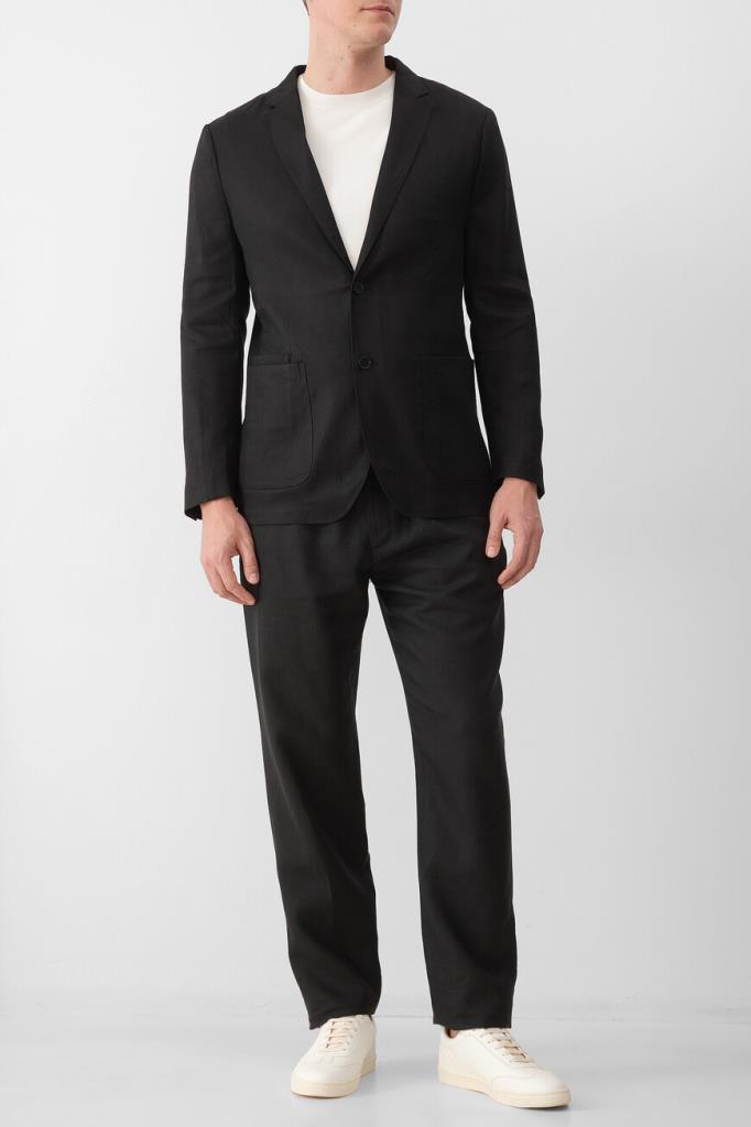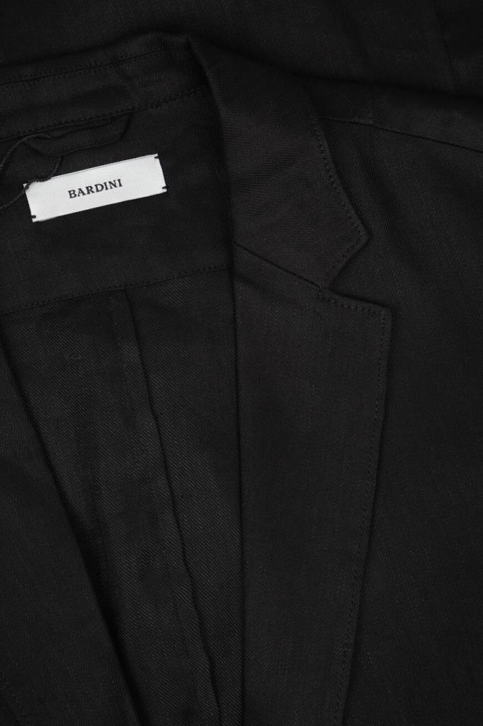 Чёрный пиджак Bardini с тремя накладными карманами. Фасон однобортной модели, изготовленной из мягкого хлопка стрейч и льна с диагональным саржевым переплетением нитей, характеризуется наличием прямоугольных лацканов и застёжкой на две крупные роговые пуговицы. Изделие с глубоким V-образным вырезом горловины станет завершающим элементом комплекта в стиле smart casual.