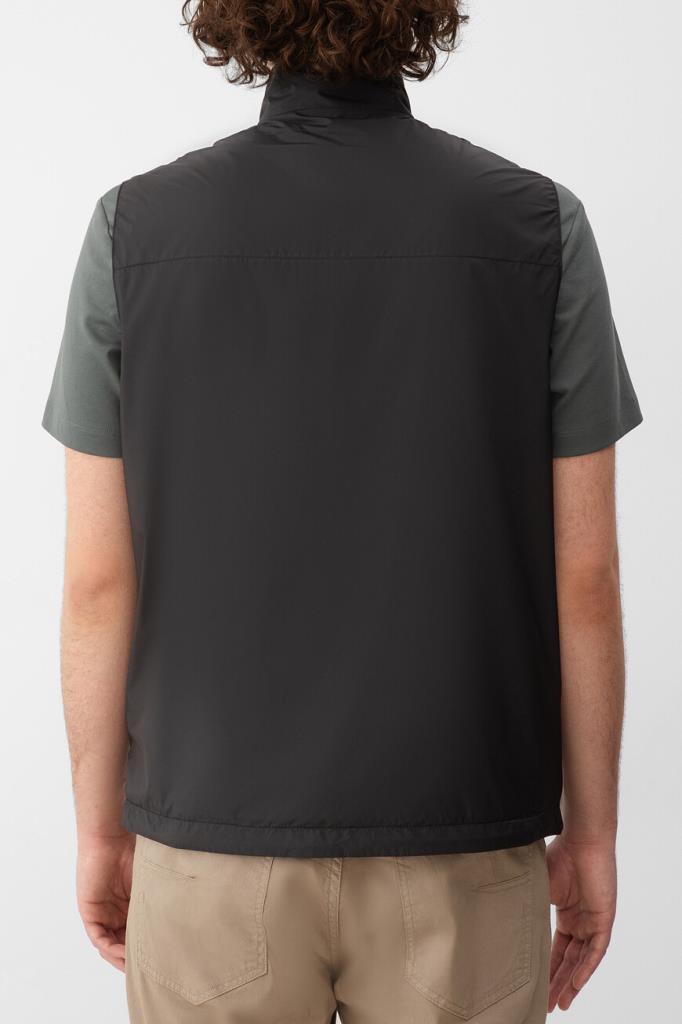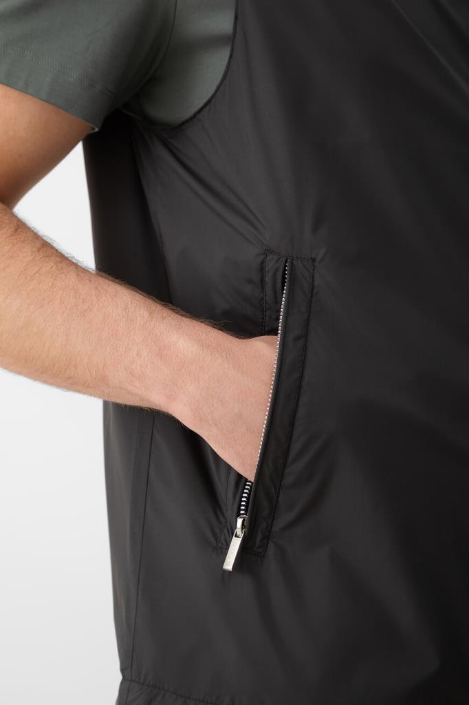 Чёрный жилет Bardini с нижней частью на скрытой регулируемой кулиске. Для создания изделия прямого силуэта выбран прочный матовый нейлон. Модель застёгивается на встречную молнию с двумя брендированными пуллерами и отличается отсутствием броского декора, что делает её ещё более универсальной.