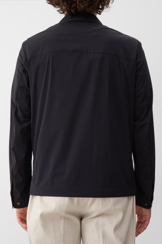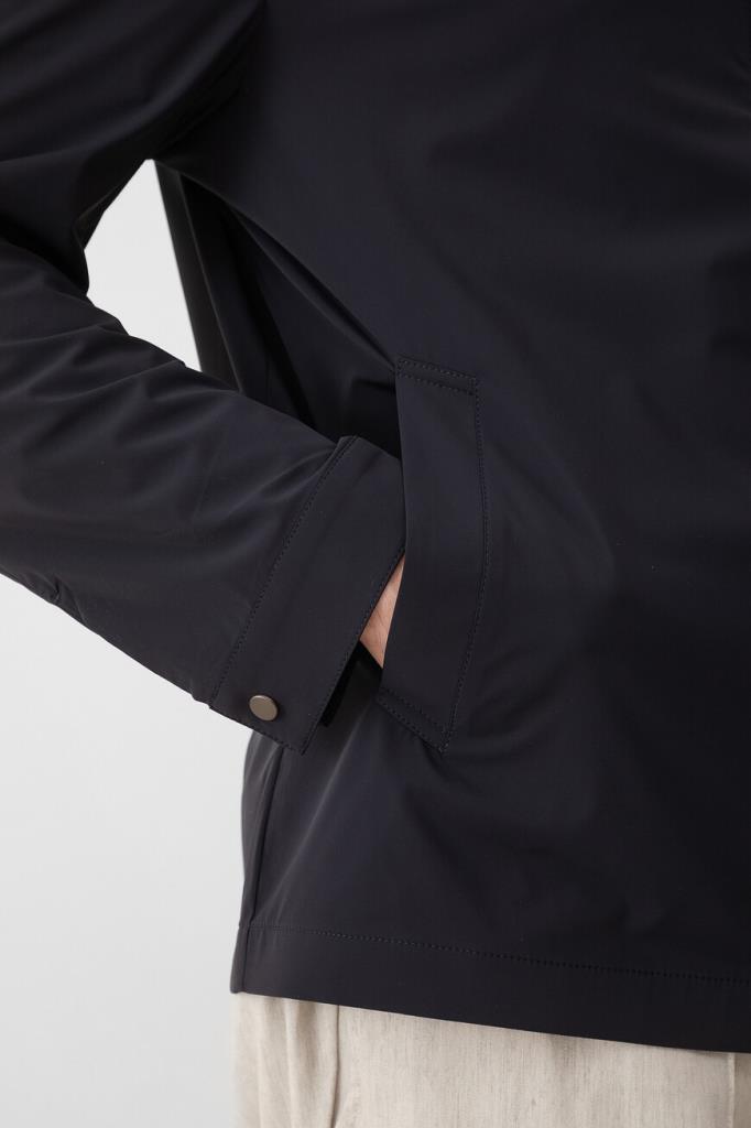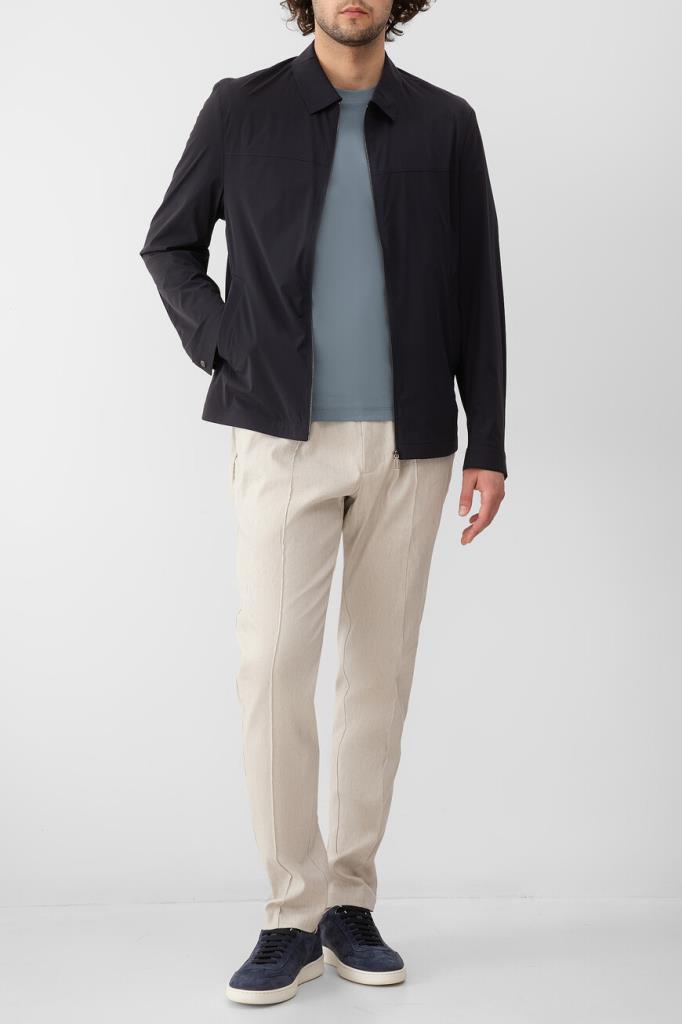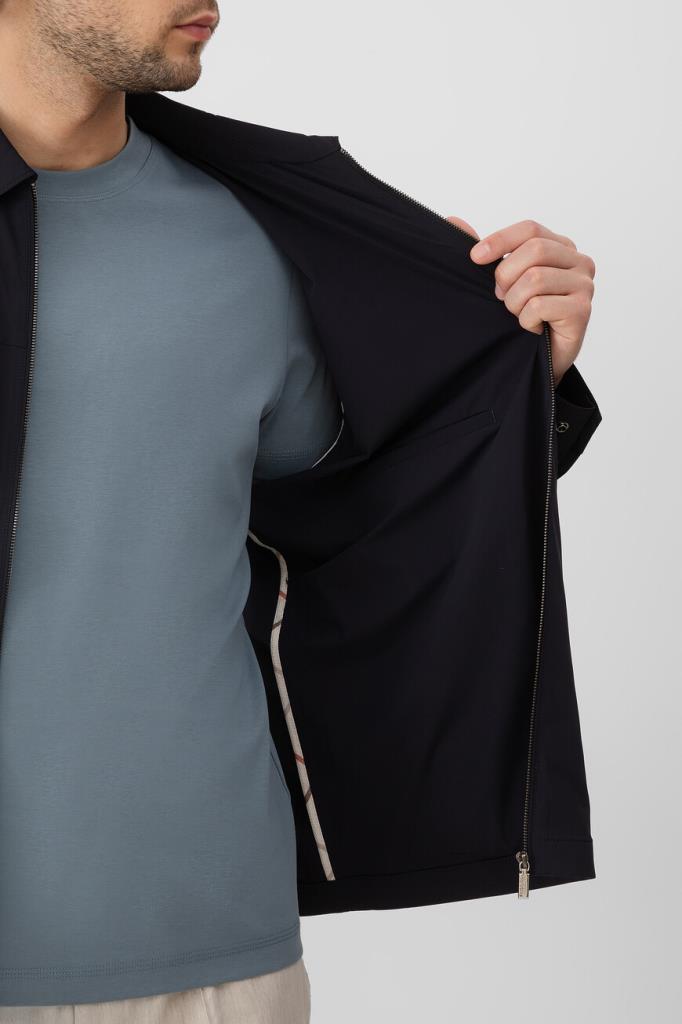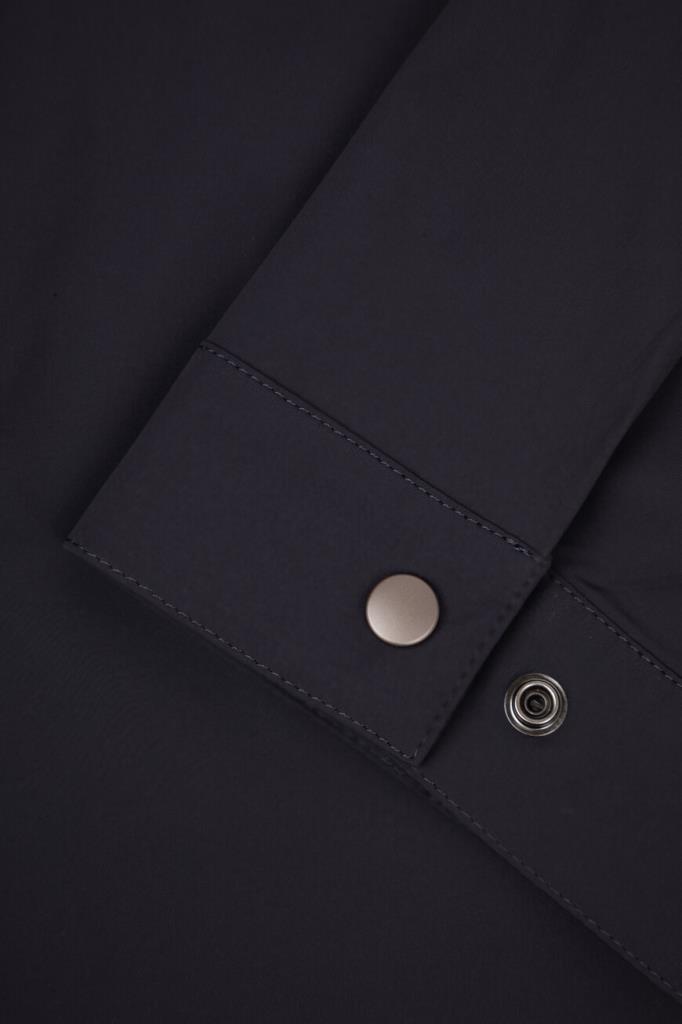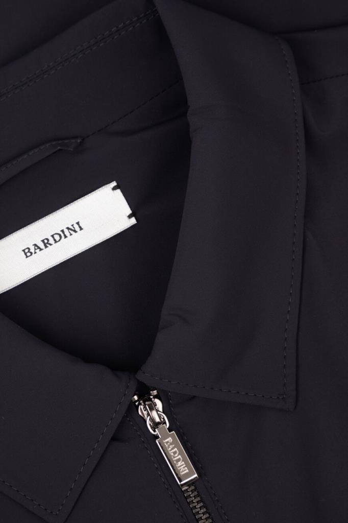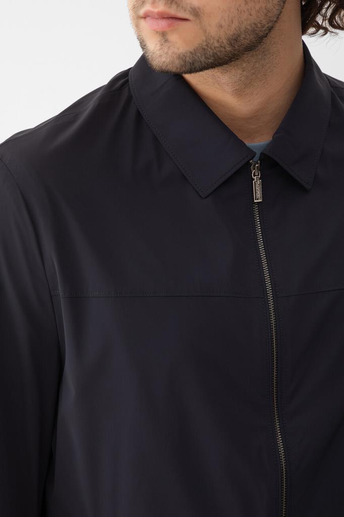 Прямая куртка тёмно-синего цвета от Bardini. Для производства изделия с отложным воротником используется прочный эластичный нейлон. На принадлежность модели с манжетами на клёпке Дому указывает гравировка на серебристом металлическом пуллере молнии.