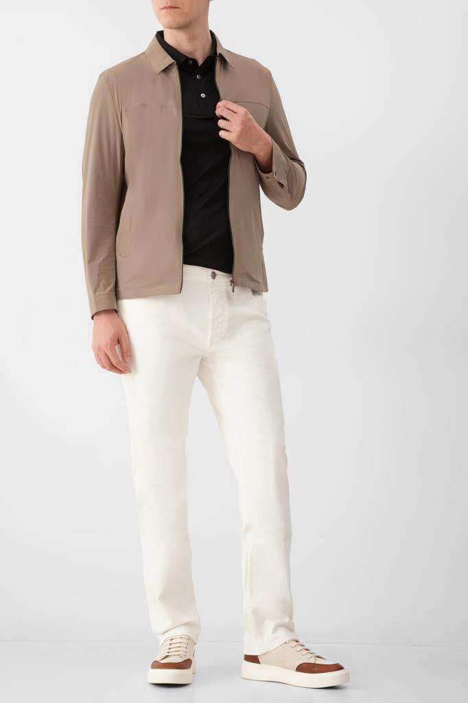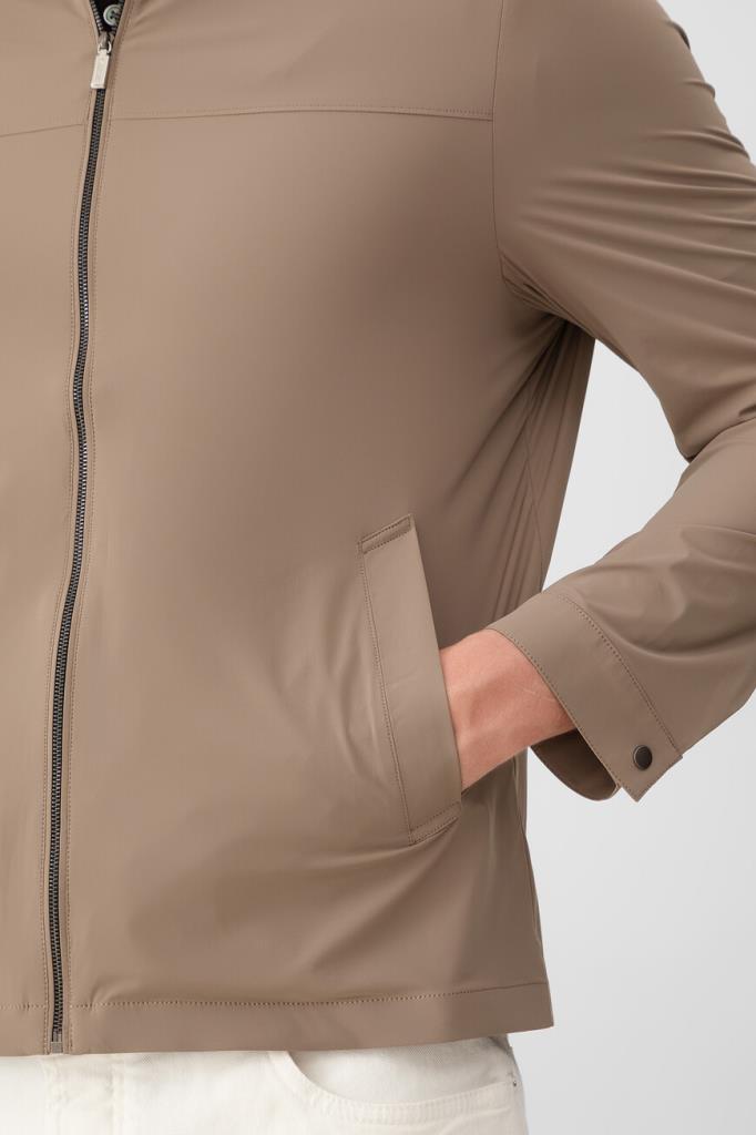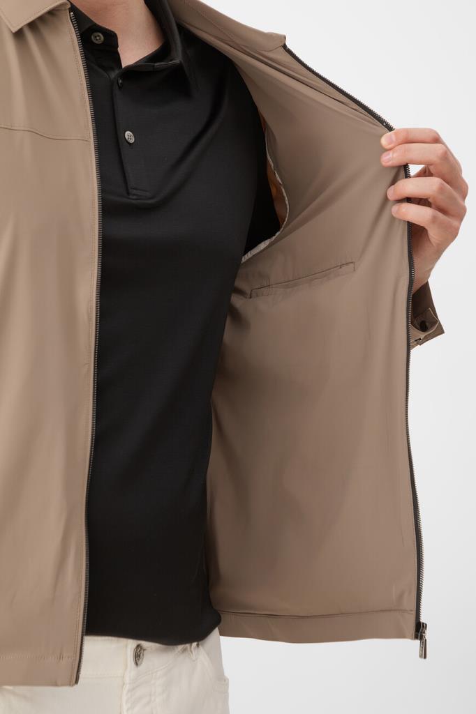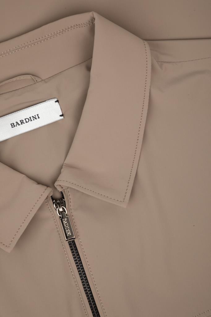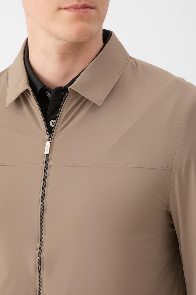 Куртка из прочного эластичного нейлона светло-коричневого оттенка от Bardini. Фасон повседневной модели прямого силуэта характеризуется наличием отложного воротника и застёжки-молнии чёрного цвета с брендированным пуллером. Внутри размещён прорезной карман на сетчатой подкладке в клетку.