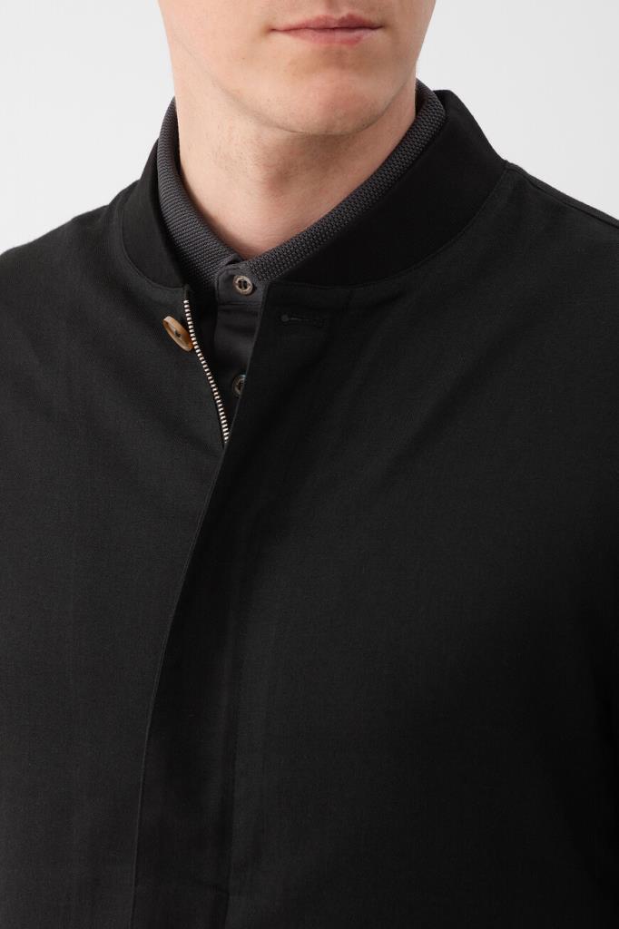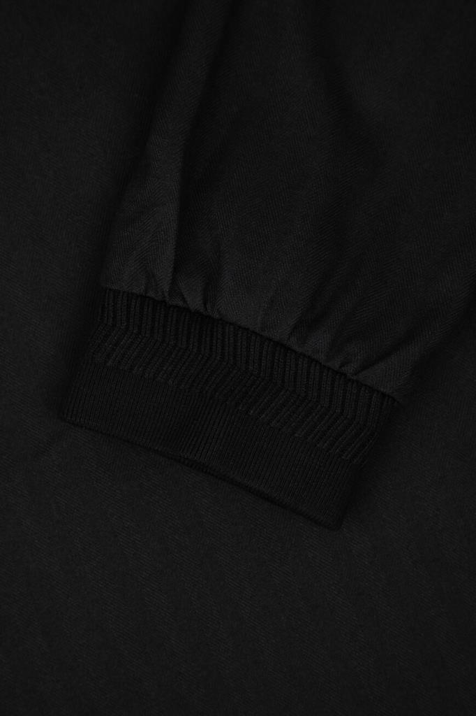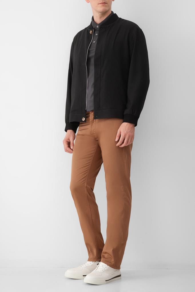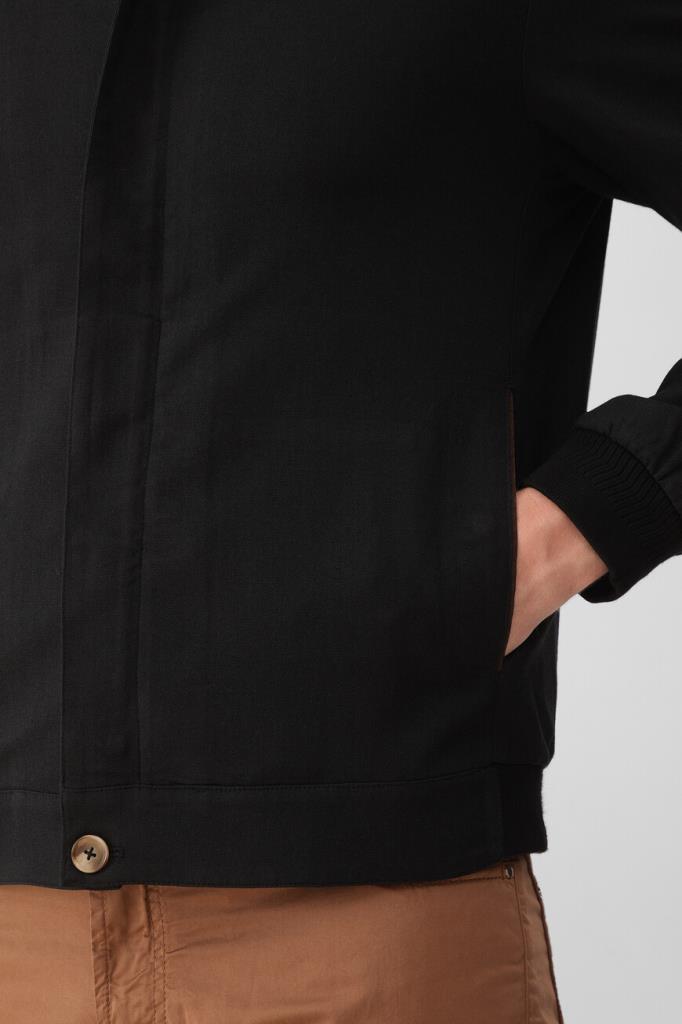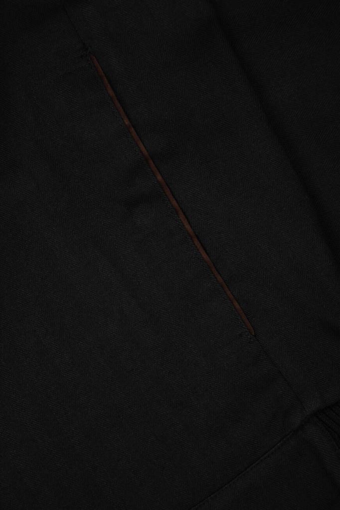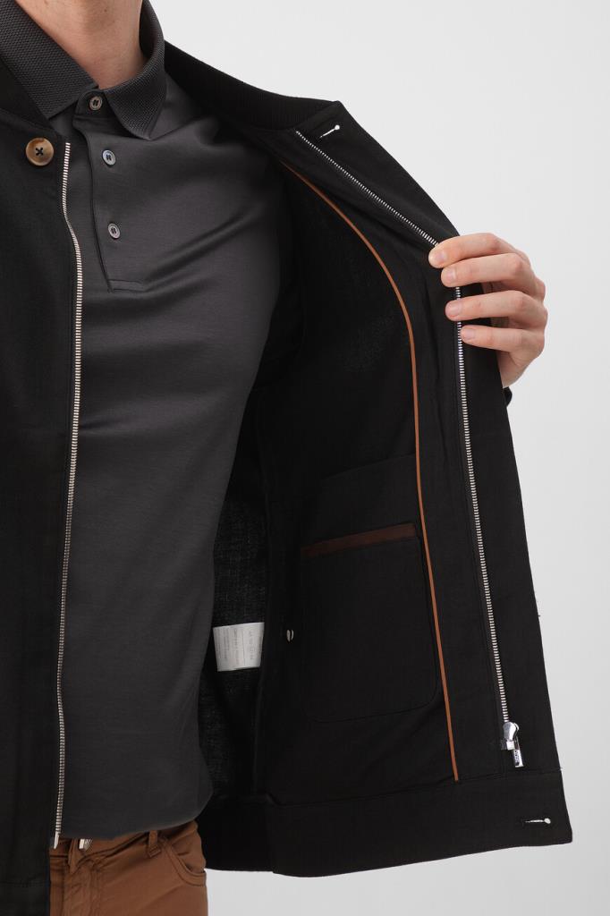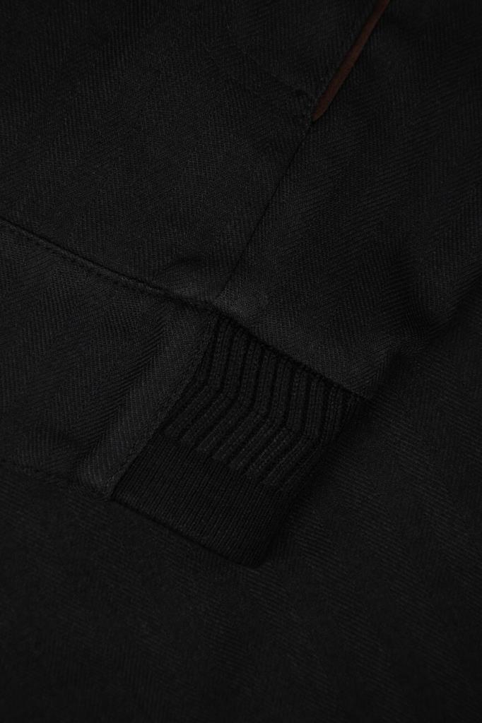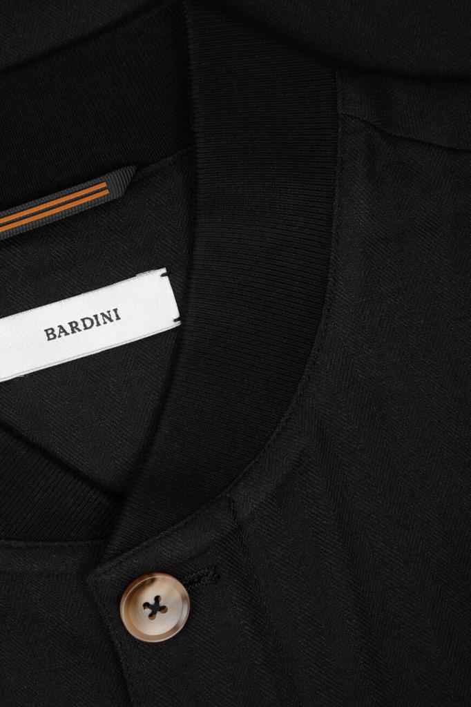 Прямая куртка чёрного цвета от Bardini. Для создания модели с фактурным геометрическим узором в «ёлочку» в тон используется мягкий трикотаж на основе полиэфира, льна и прочного вискозного волокна. Отличительными деталями являются тёмно-коричневые вставка на спинке и полосы-отделка на карманах.
