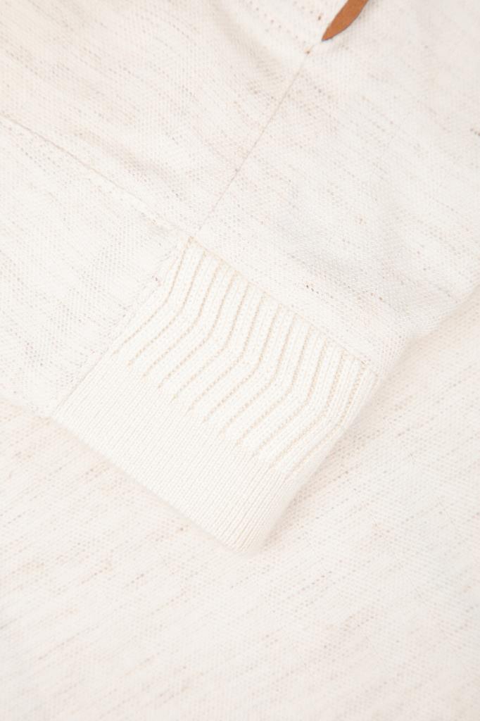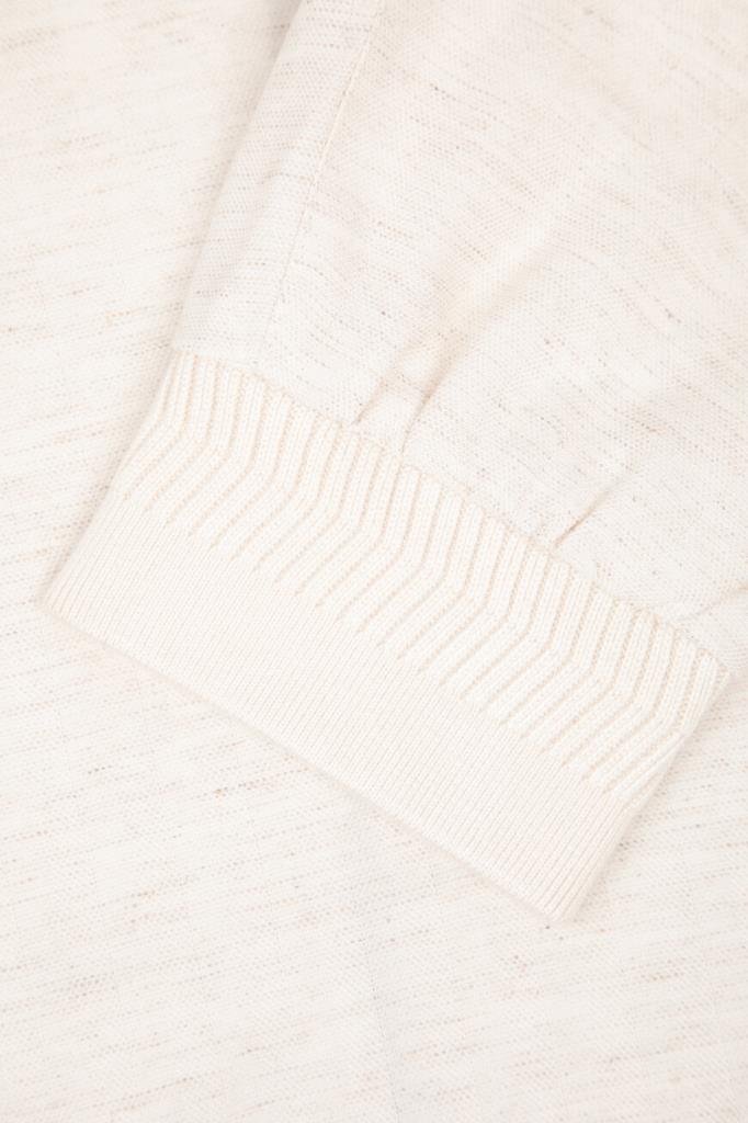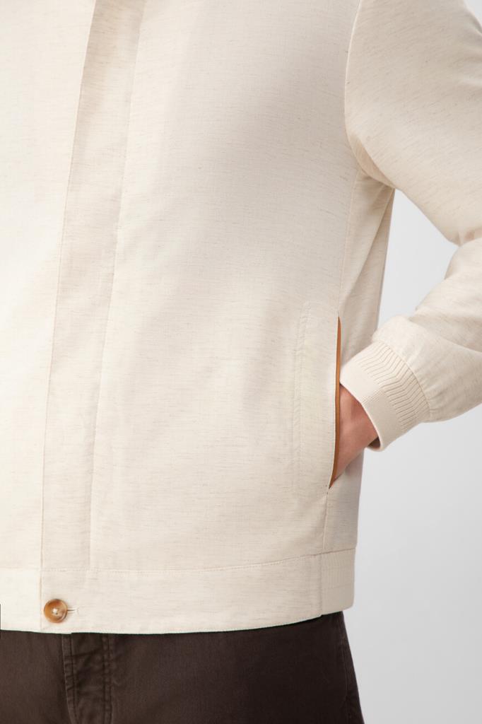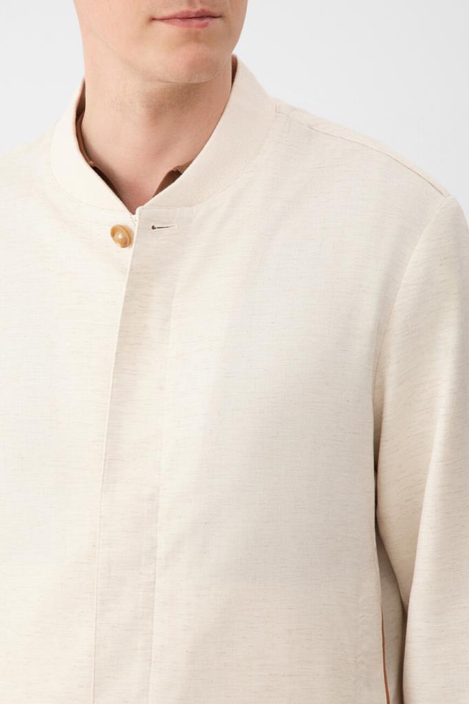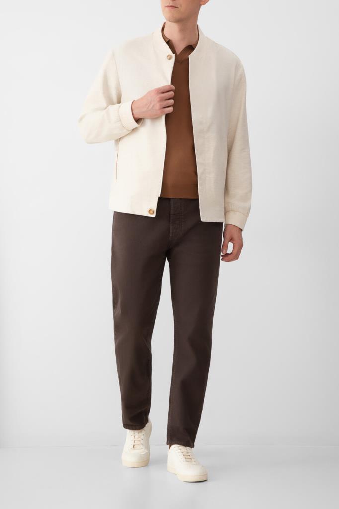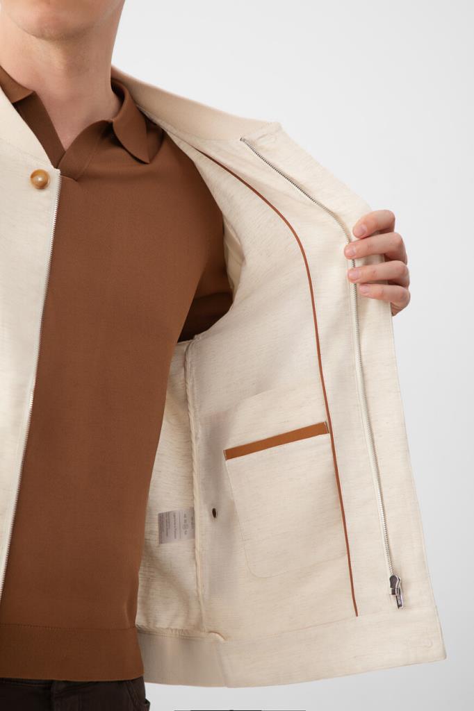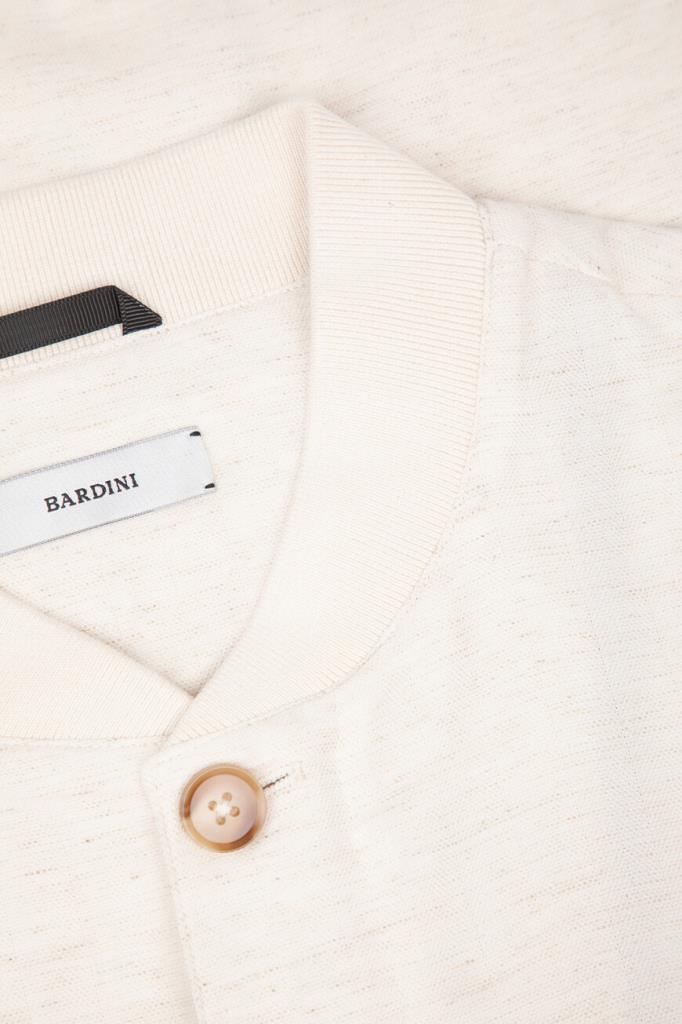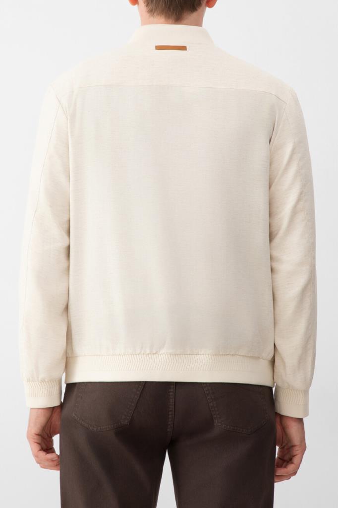 Трикотажная куртка Bardini с коричневыми вставкой сзади и полосами на карманах. Для изготовления повседневной модели выбраны прочный полиэстер, лён и вискозное волокно светло-бежевого оттенка. Манжеты рукавов обрамлены зигзагообразным кантом по верхнему краю. Надёжную защиту от порывов ветра обеспечивает застёжка на серебристую молнию, покрытую планкой, и две крупные роговые пуговицы.