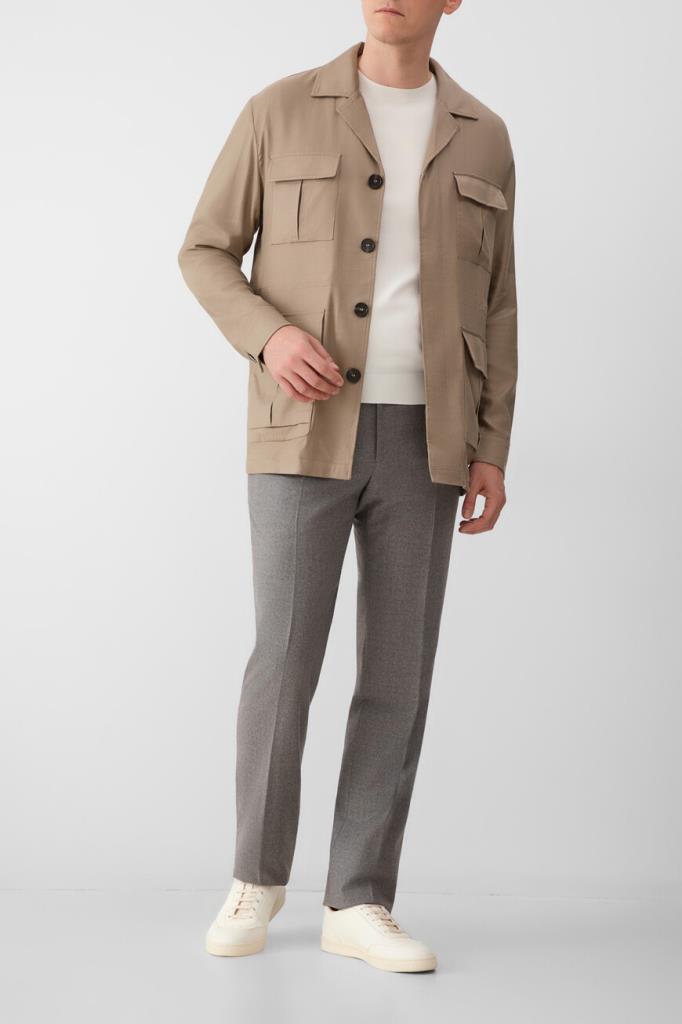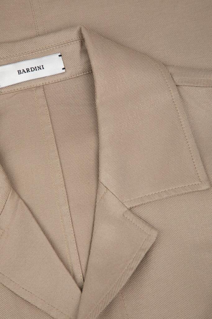 Куртка Bardini с талией на скрытой кулиске, создающей прилегающий силуэт. Конструкция изделия бежевого оттенка, выполненного из льна и инновационного гипоаллергенного материала - тенселя, изготовленного из натуральной целлюлозы, главным образом из древесины эвкалипта, предполагает наличие гавайского воротника и четырёх накладных карманов с клапанами для оптимального хранения всего необходимого на груди и по бокам. Крупные роговые пуговицы покрыты ветрозащитной планкой.