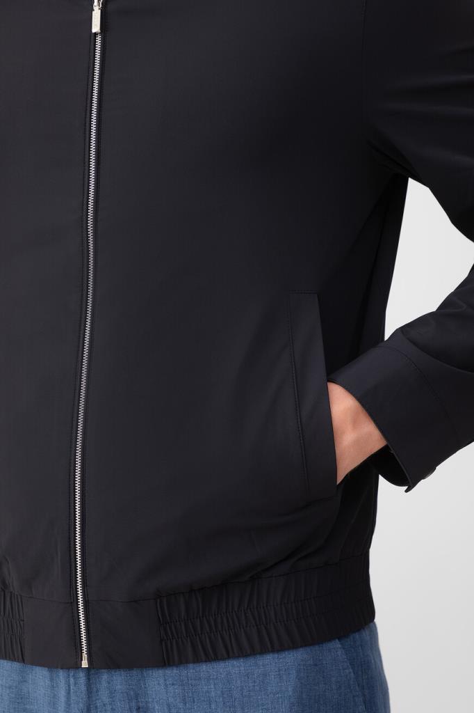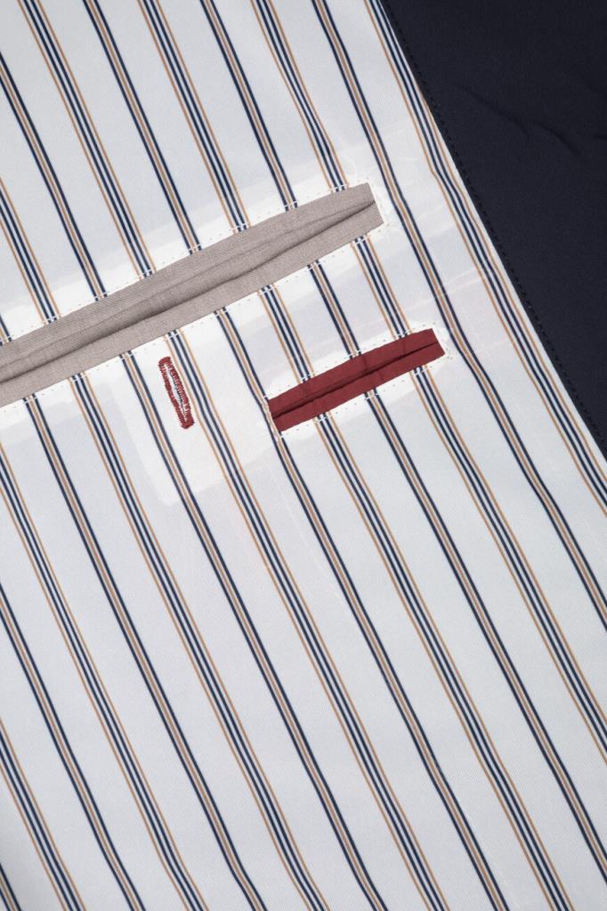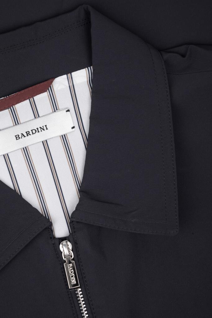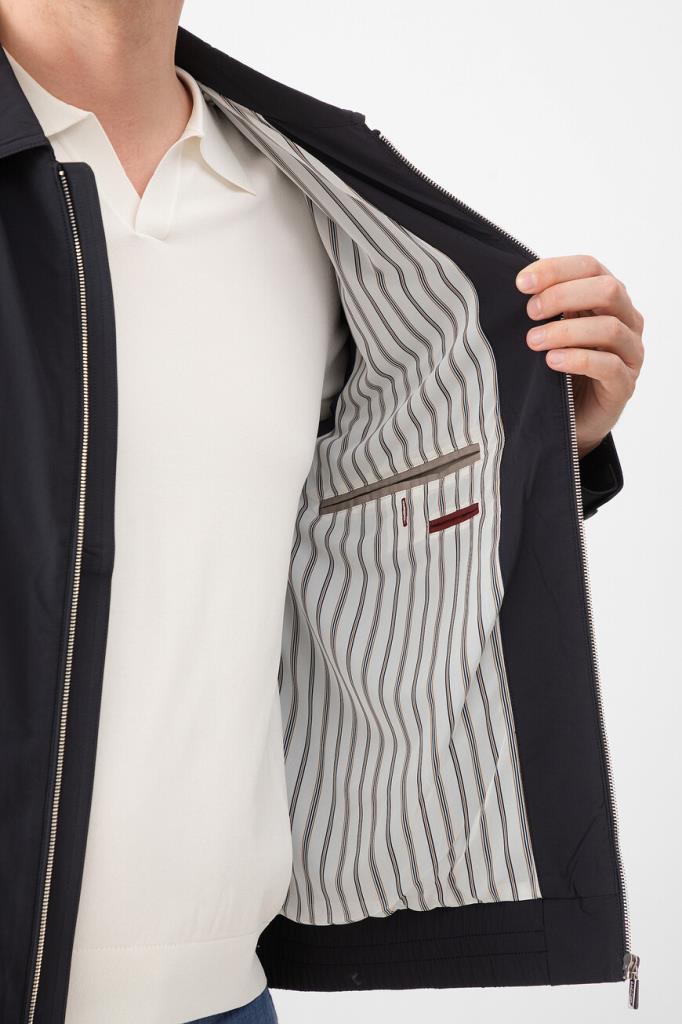 Тёмно-синяя куртка Bardini на белой подкладке с принтом в полоску. Модель изготовлена из прочного эластичного полиэстера и оснащена застёжкой на серебристую молнию с брендированным пуллером. Для оптимальной посадки изделия по фигуре предусмотрены регулируемые манжеты на металлической клёпке и широкий эластичный пояс в резинку.