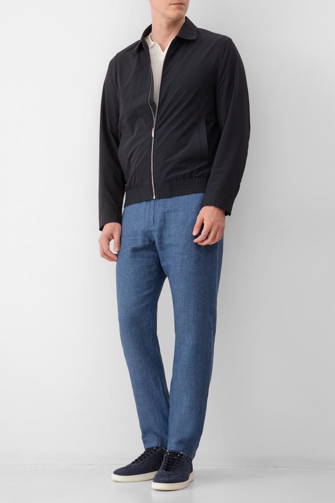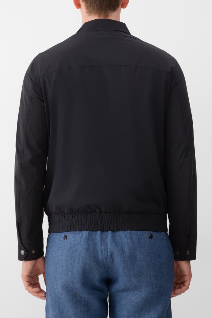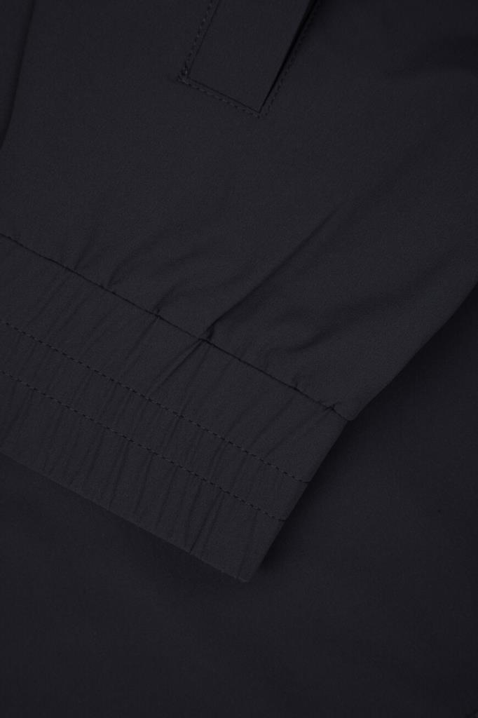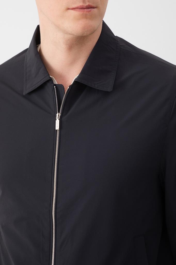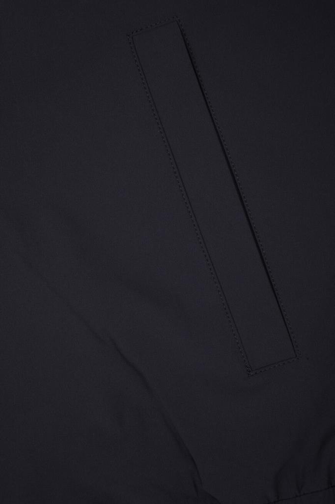 Тёмно-синяя куртка Bardini на белой подкладке с принтом в полоску. Модель изготовлена из прочного эластичного полиэстера и оснащена застёжкой на серебристую молнию с брендированным пуллером. Для оптимальной посадки изделия по фигуре предусмотрены регулируемые манжеты на металлической клёпке и широкий эластичный пояс в резинку.