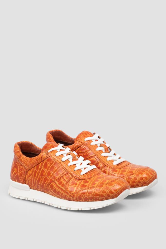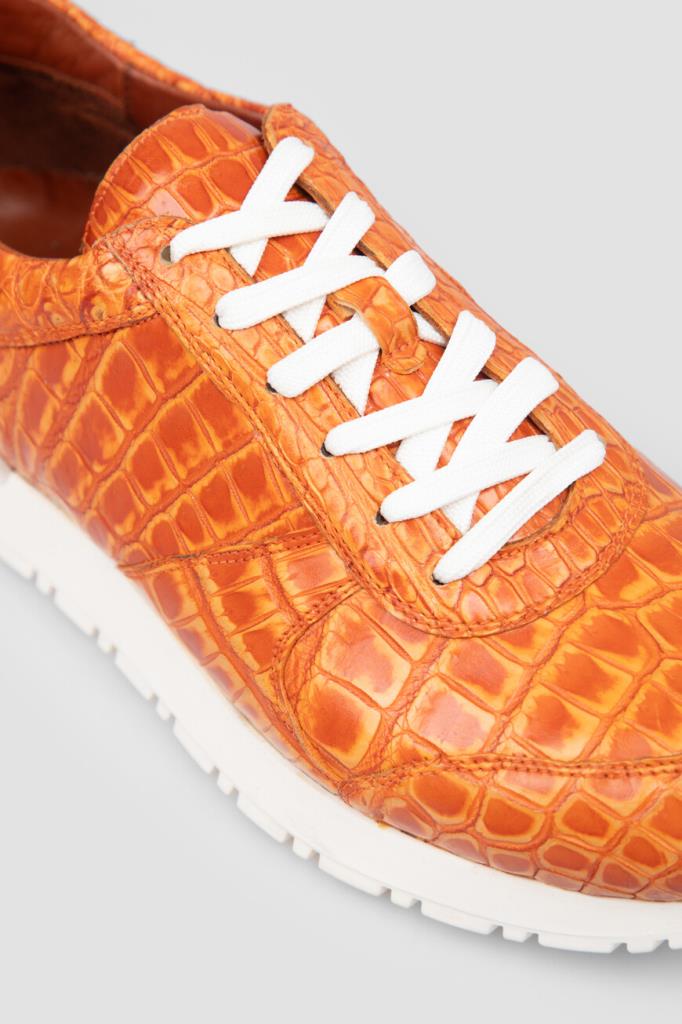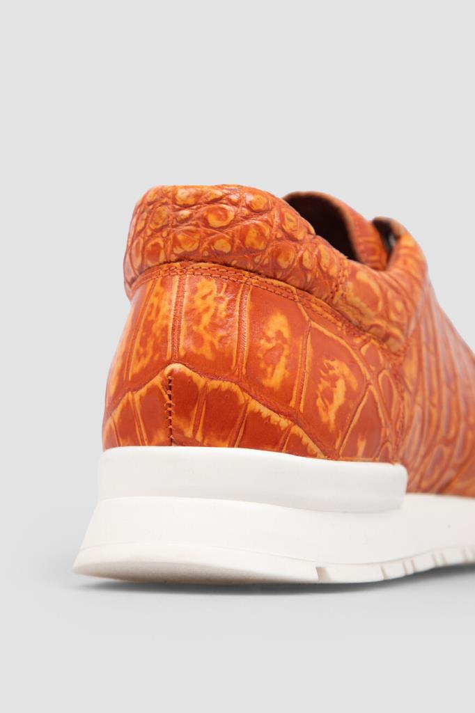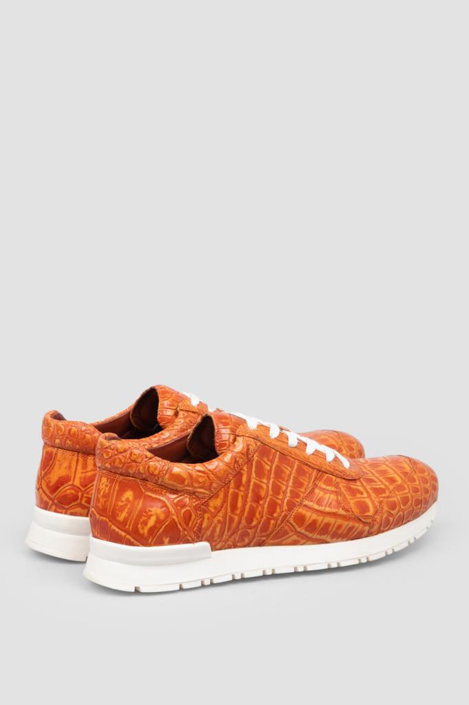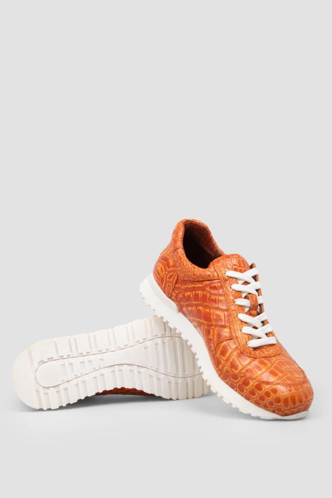 Яркие оранжевые кроссовки от Bardini. Для производства изделия с укреплёнными округлым носком и задником выбрана кожа нильского крокодила. Отличительными особенностями модели являются характерный чешуйчатый рисунок на поверхности и наличие перекрёстной многорядной шнуровки. Удобная пара установлена на амортизирующую подошву из прочного полиуретана и выделана изнутри гладкой телячьей кожей.