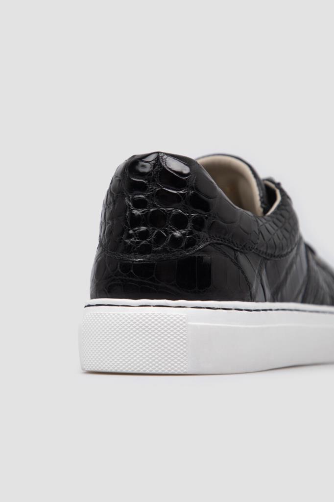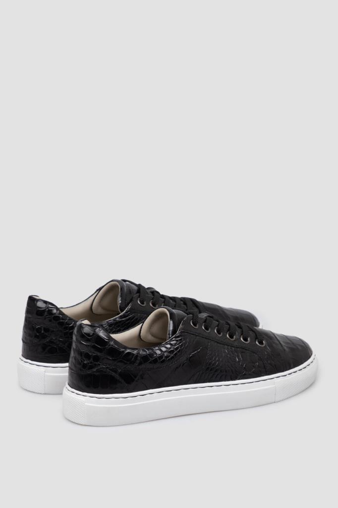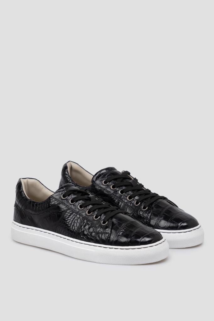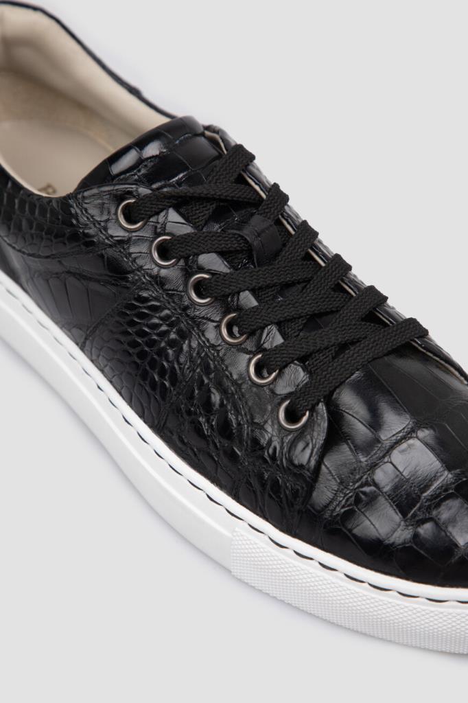 Чёрные кеды с широкой колодкой от Bardini. Модель из мягкой кожи крокодила с характерной чешуйчатой текстурой оснащена открытым типом шнуровки с люверсами из серебристого металла. Изделие выделано изнутри тонкой телячьей кожей и бархатистой замшей и украшено брендированием на стельках.