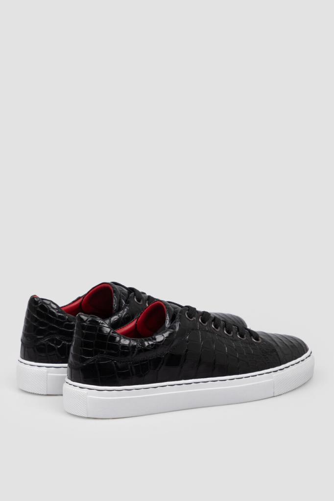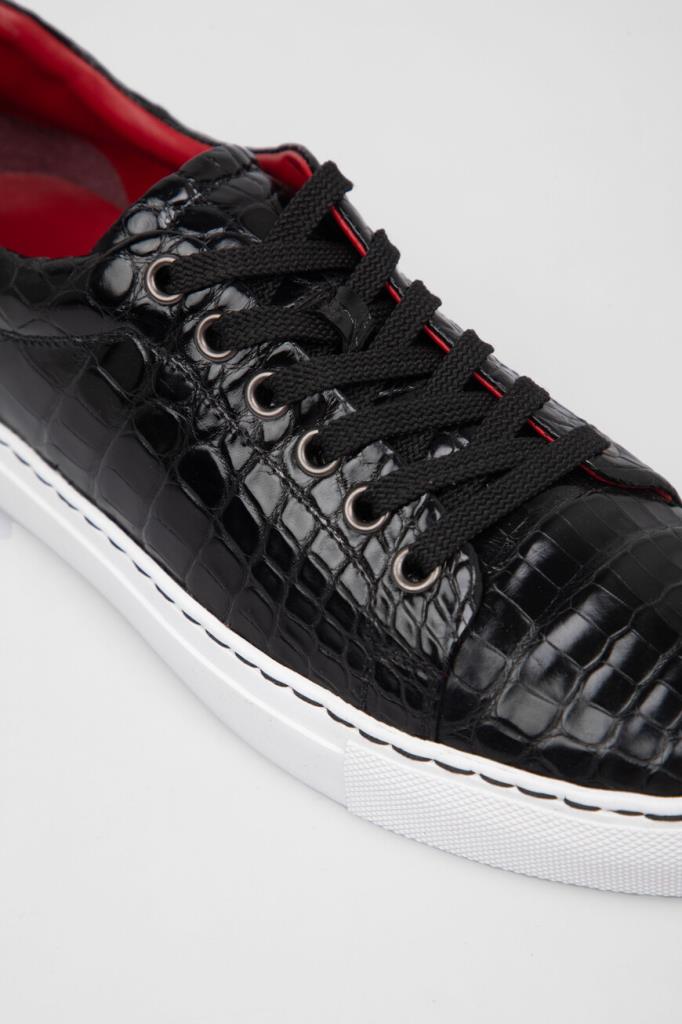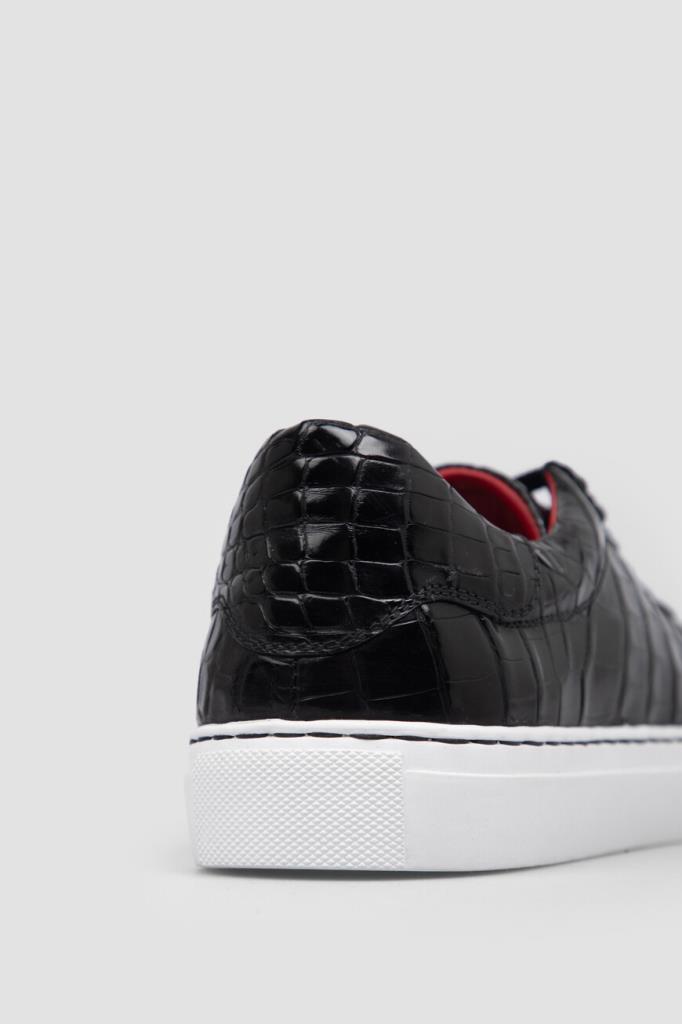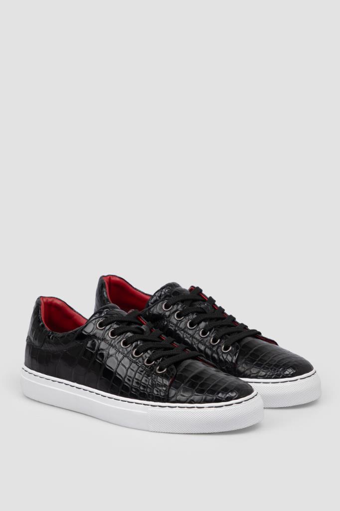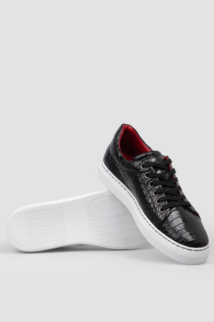 Кеды Bardini с ярко-красной внутренней отделкой. Для изготовления модели на плоской белой подошве выбрана контрастная кожа крокодила с естественным чешуйчатым рисунком. Пара комфортно сидит на ноге благодаря перекрёстной многорукой шнуровке с люверсами из серебристого металла.