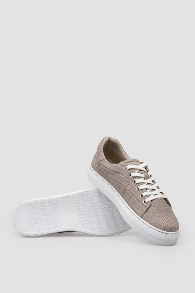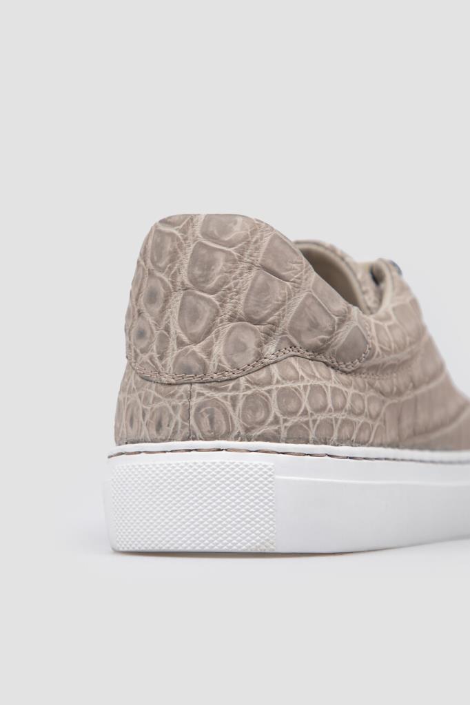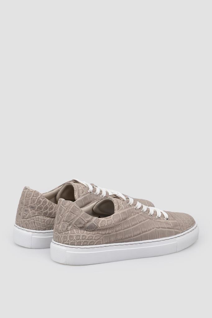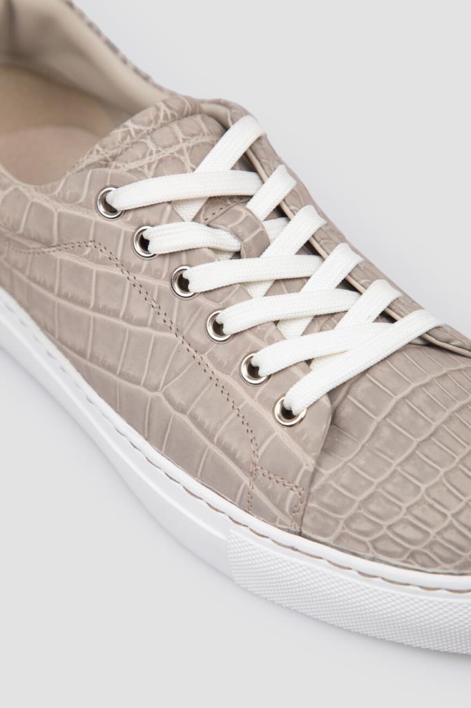 Серые кеды Bardini с традиционным миндалевидным носком. Конструкция удобной пары, выполненной из матовой кожи крокодила с естественным чешуйчатым рисунком, предполагает наличие перекрёстной многорядной шнуровки с люверсами из серебристого металла и плоской подошвы из прочного белого полиуретана с рифлением снизу для надёжного сцепления с дорогой. Модель нейтрального оттенка станет неотъемлемой частью Вашего повседневного гардероба.