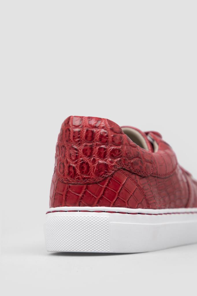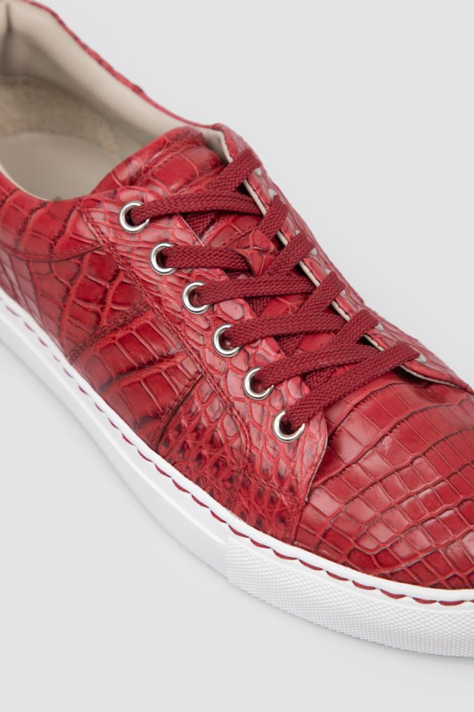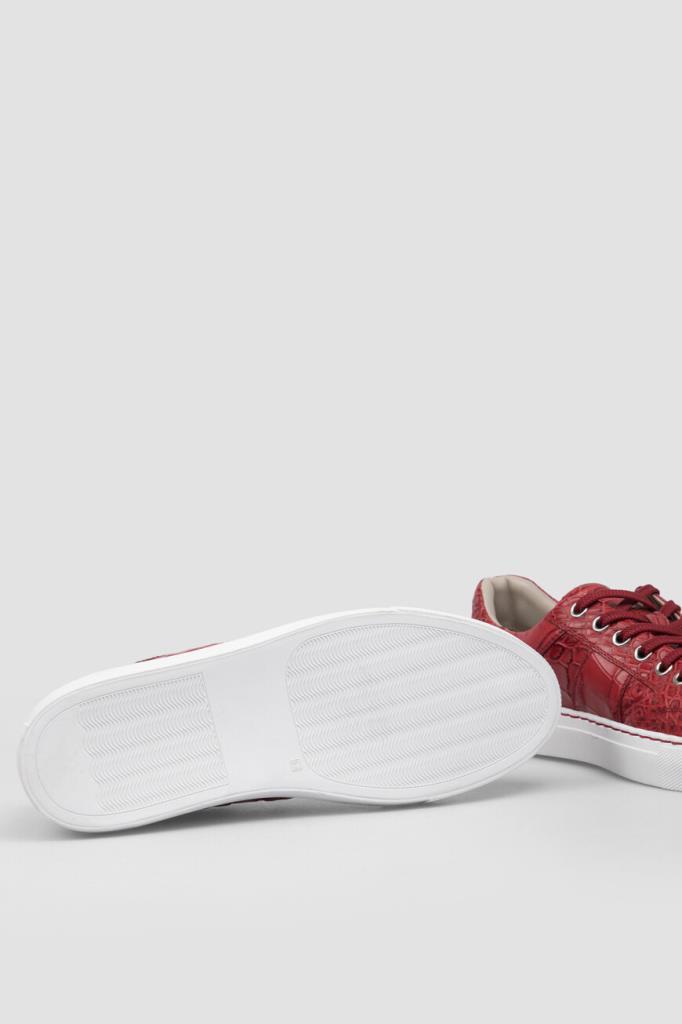 Кожаные кеды Bardini с естественным чешуйчатым рисунком. Характерными особенностями модели красного оттенка являются классическая форма и наличие перекрёстной многорядной шнуровки с люверсами из серебристого металла. Принадлежность удобной пары Дому деликатно обозначено брендированием на стельках.