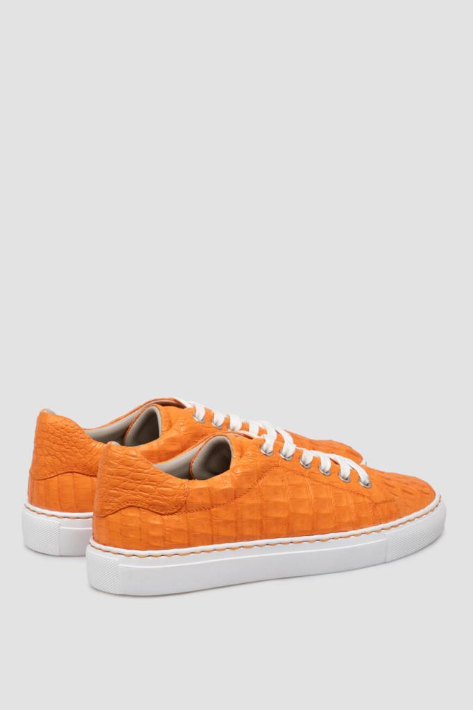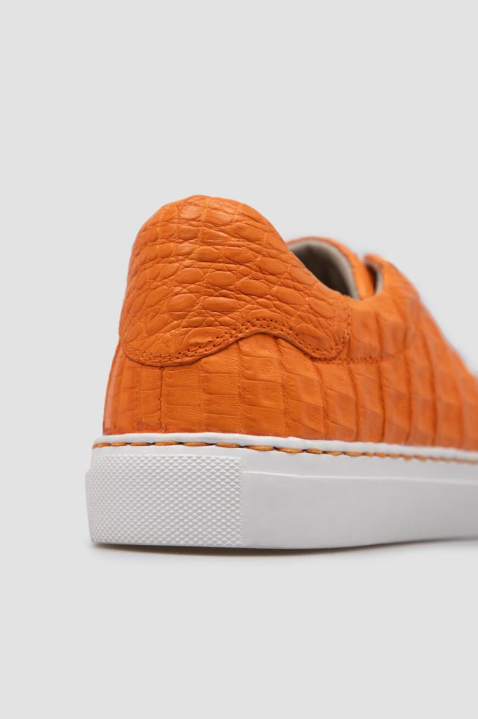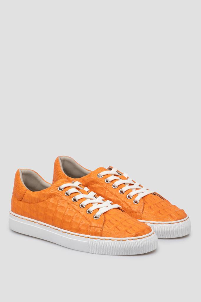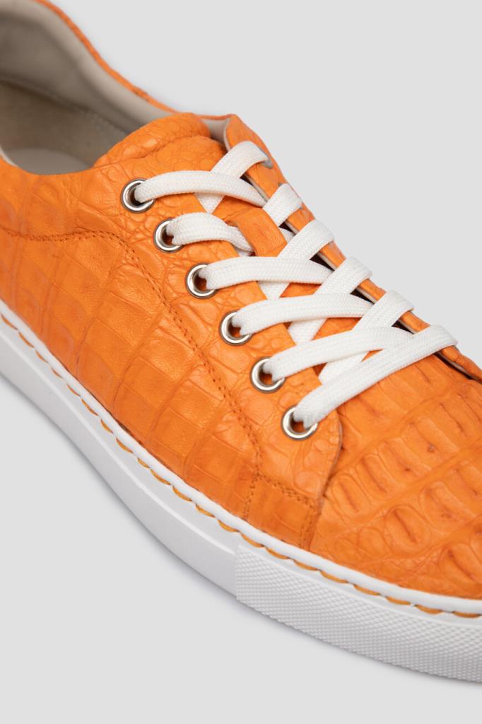 Кеды Bardini насыщенного оранжевого оттенка с матовой текстурой. Конструкция изделия из мягкой кожи крокодила с естественным чешуйчатым рисунком характеризуется наличием открытой перекрёстной шнуровки с люверсами из серебристого металла и плоской белой подошвы с рифлением снизу для дополнительной устойчивости. Удобная пара сыграет роль акцентного элемента в Вашем образе.